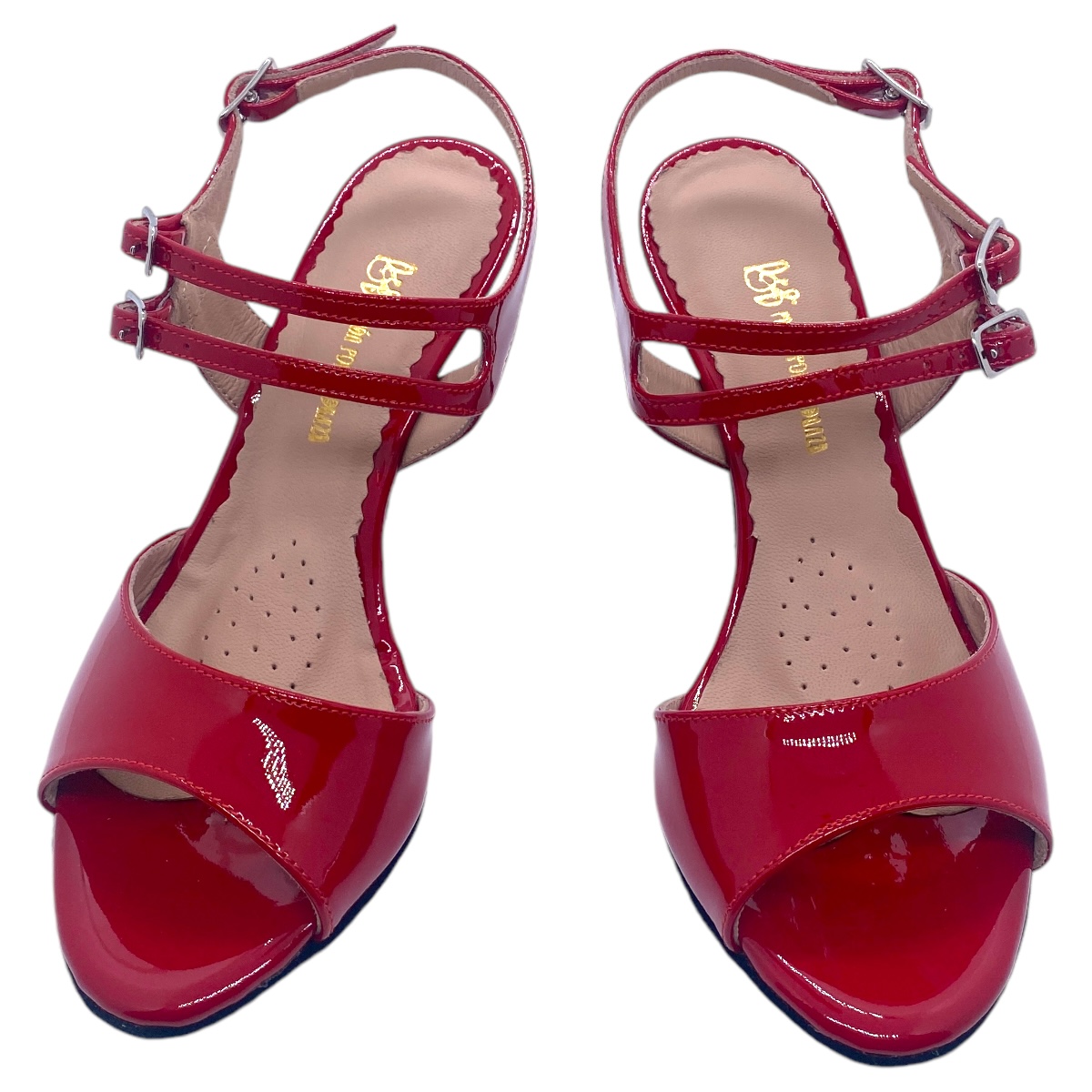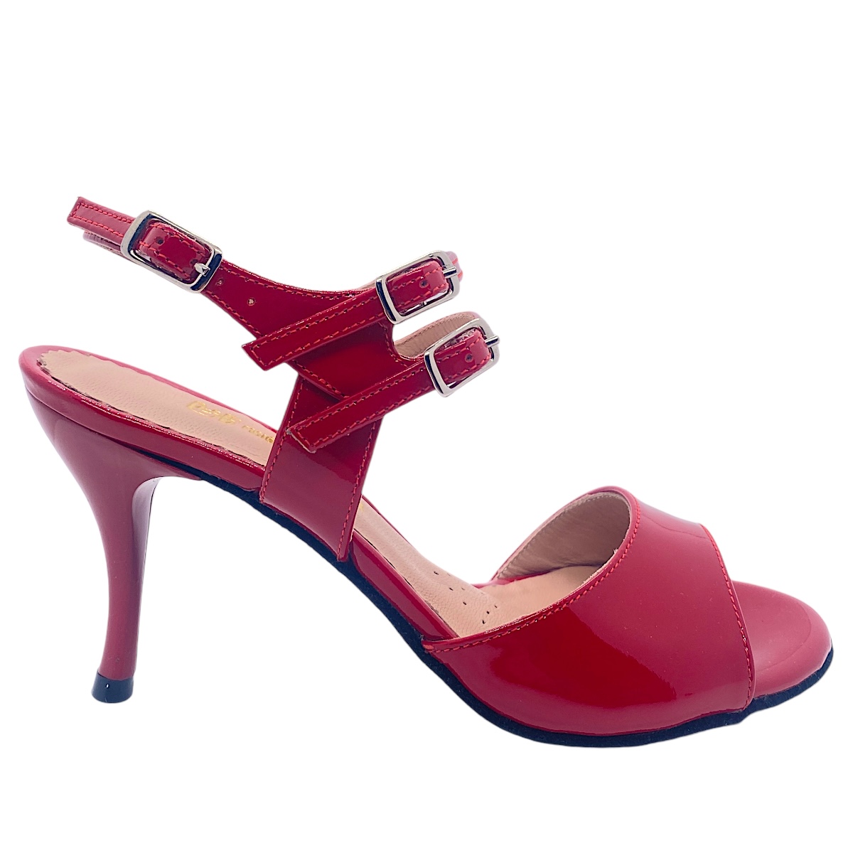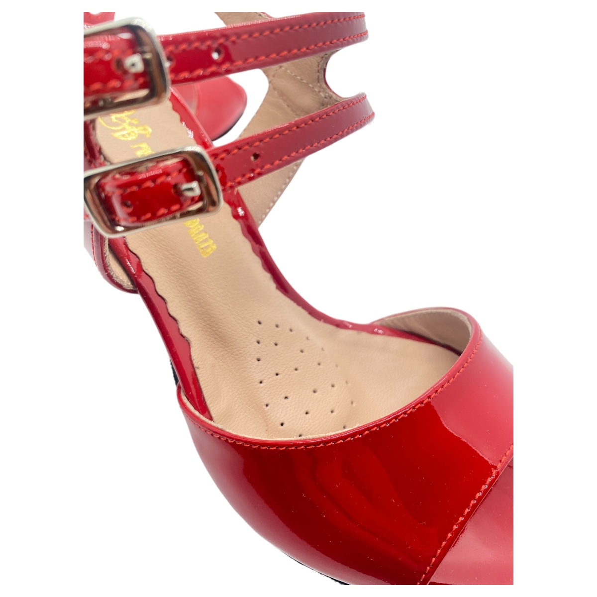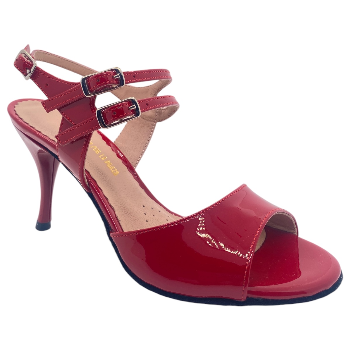Modell 444 von Porteno & Bailarina - 80 mm lackiertem Acrylabsatz - Wildledersohle, hier in rotem Lackleder, Bequemlichkeit durch gut abgeschäumte Leder-Innensohle, 3-fach verstellbarer Verschlussriemen, Maximum an Balance durch ausgefeilte Statik, wie alle Modelle von Porteña & Bailarina