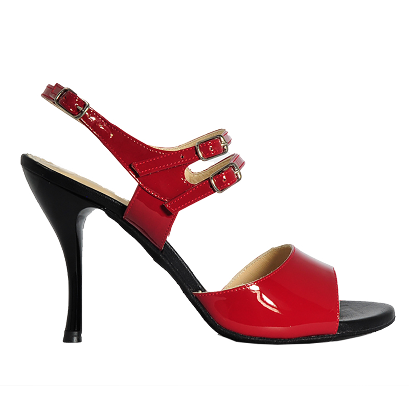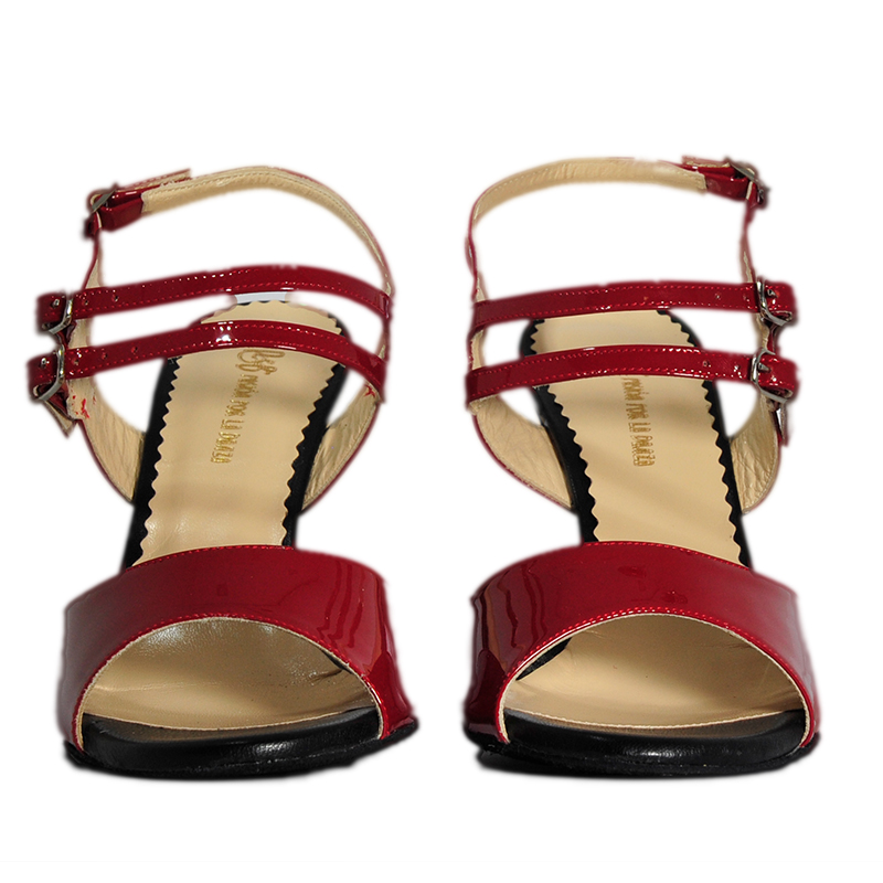 Modell 444 von Porteno & Bailarina - 80 mm lackiertem Acrylabsatz - Wildledersohle, in rotem Lackleder, Bequemlichkeit durch gut abgeschäumte Leder-Innensohle, 3-fach verstellbarer Verschlussriemen, Maximum an Balance durch ausgefeilte Statik, wie alle Modelle von Porteña & Bailarina