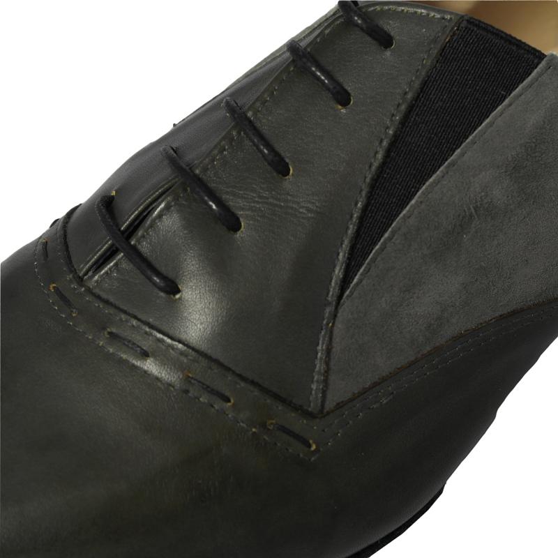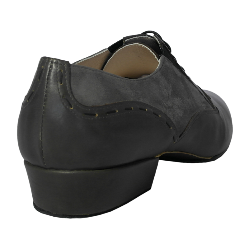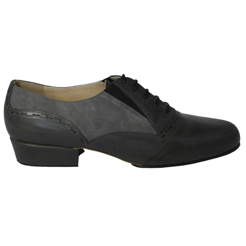 Modell Tony - ein Herren Tango Tanzschuh mit geteilter Sohle aus Wildleder, gemacht aus pflanzengefärbten, giftfreien Materialien. Besonders interessant die kleinen Elastikeinsätze seitlich am Spann - die macht jede Bewegung mit, hilft aber auch bei hohem Spann. Graues Wildleder und taupegraues Kalbsleder.