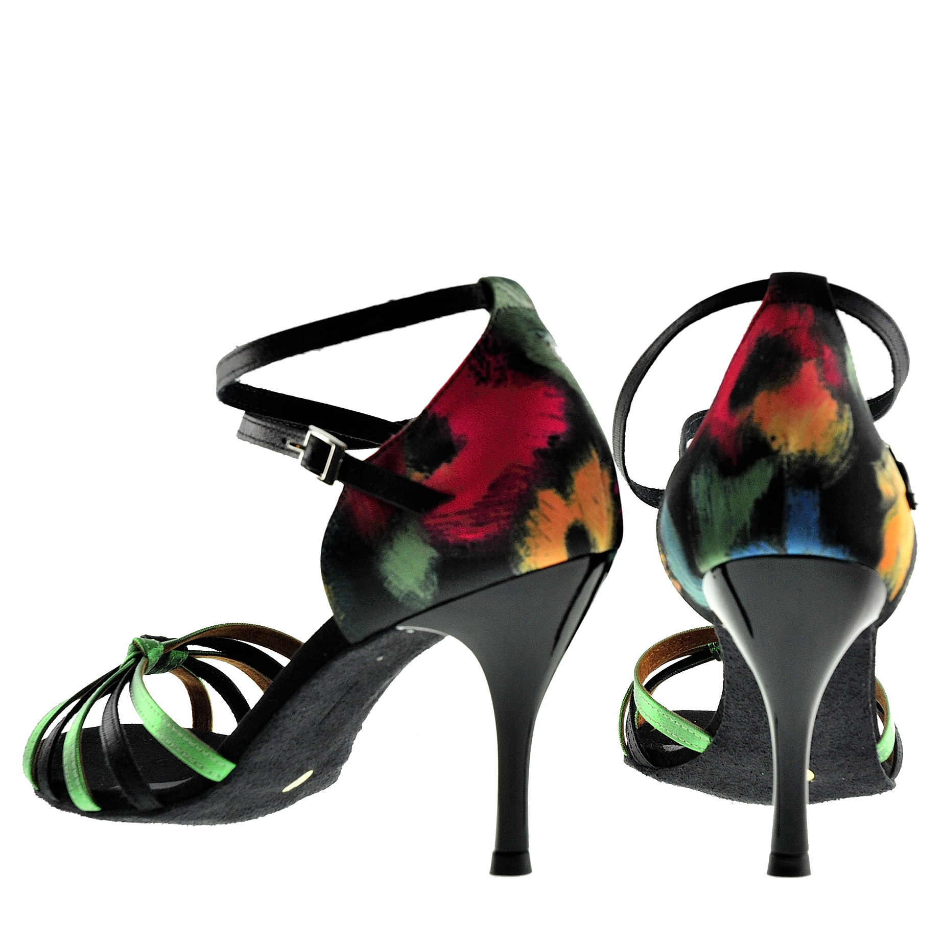 Ausgefale Tanzsandale mit Lurex in grün vorn und bunt das Material "Picasso" an der Ferse, 85 mm Absatz stört nicht da man ihn auf Grund des gut ausgearbeiteten Fußbettes kaum spürt, langlebige Mikrofasersohle, wasserdicht und beständig setzt sie sich nicht so schnell zu wie Wildleder, aufgerauht wird mit einer weichen Metallhaarbürste (auch bei uns im Shop)