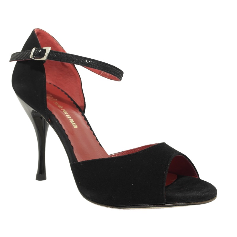 Hinten geschlossene Sandale aus weichem schwarzem Soft-Veloursleder. Decksohle aus rotem Wildeder, Tanzsohle aus unbehandeltem Leder (Outdoorgeeignet), 80 oder 90 mm Absatz Acryl - Porteño & Bailarina verbürgt sich für alle verwendeten Materialien in höchster Qualität, nach DIN Normen pflanzen-gefärbt für Umwelt und Tänzer