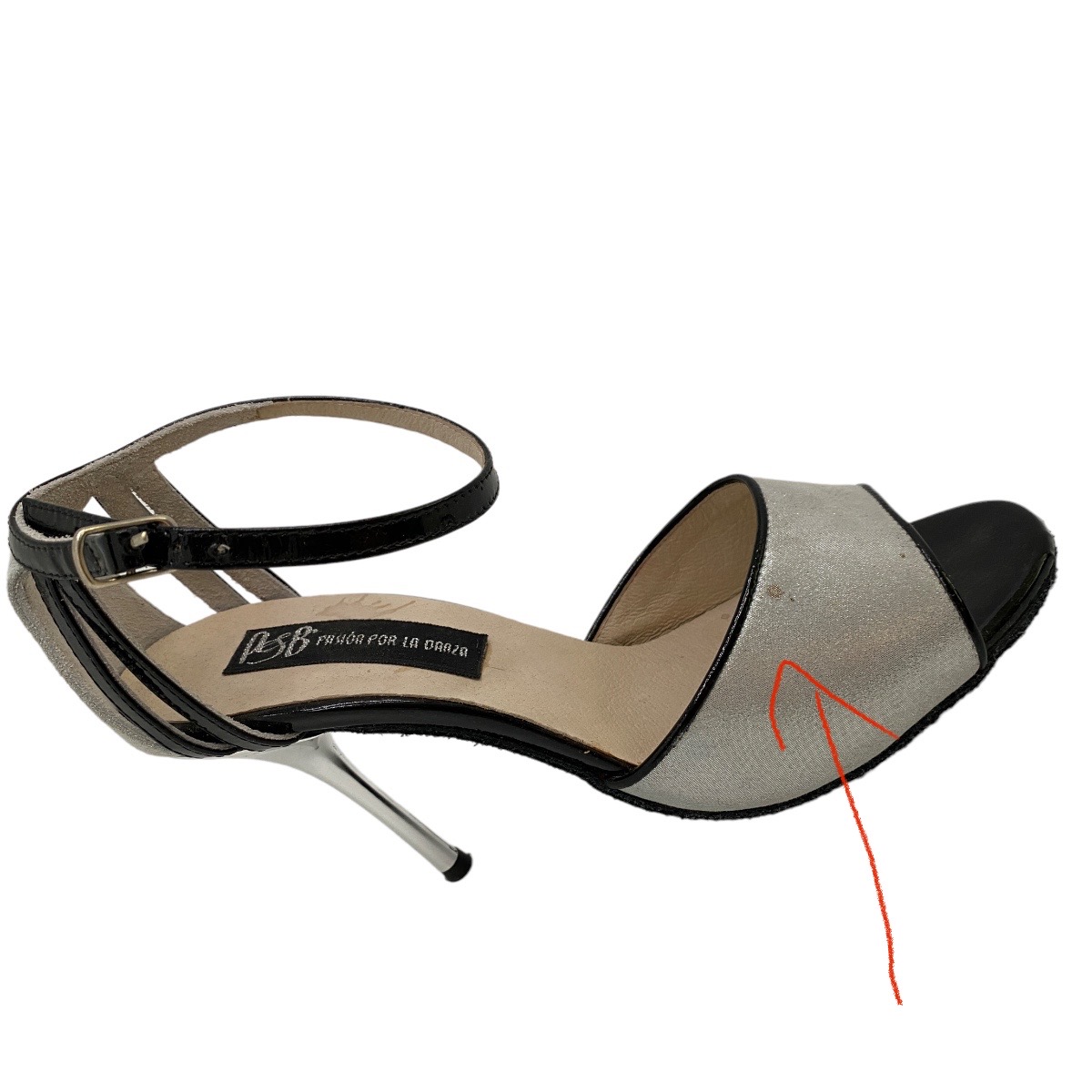 Der Tangoschuh 420 aus dem Hause Porteno & Bailarino aus in einer Kombination aus Silber und Schwarz. Mit 95mm Absatz und Velourledersohle. - Die Grösse 41 ist stärker reduziert, da Sie auf einem Schuh einen kleinen Fleck aufweist (siehe Bild)...