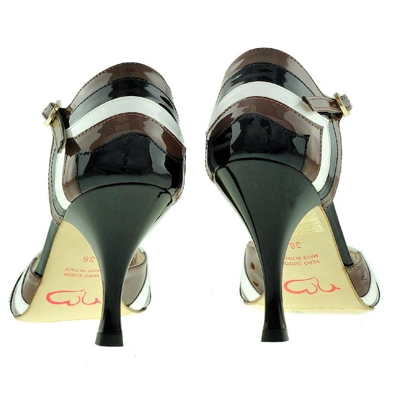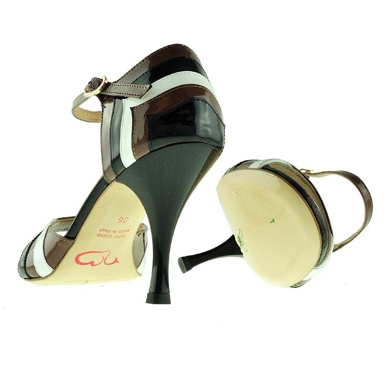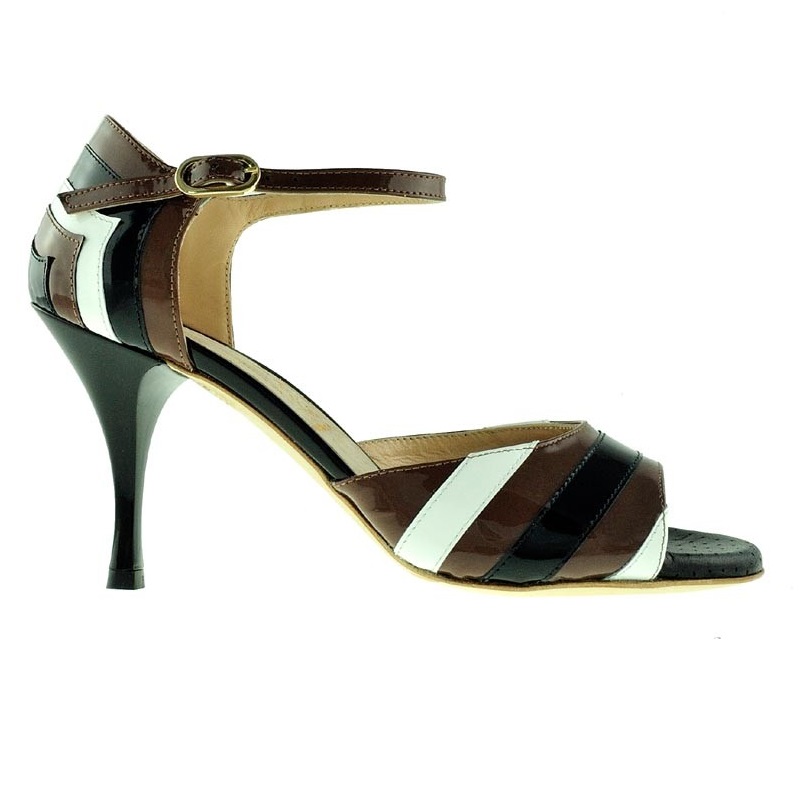 Der Tangoschuh Chocostripes aus dem Hause Nada Màs in schwarz-weiß-braun gestreiftem Lackleder. Mit 7 oder 8cm Absatz, outdoorfähiger Glattledersohle und traumhast weicher Schäumung.