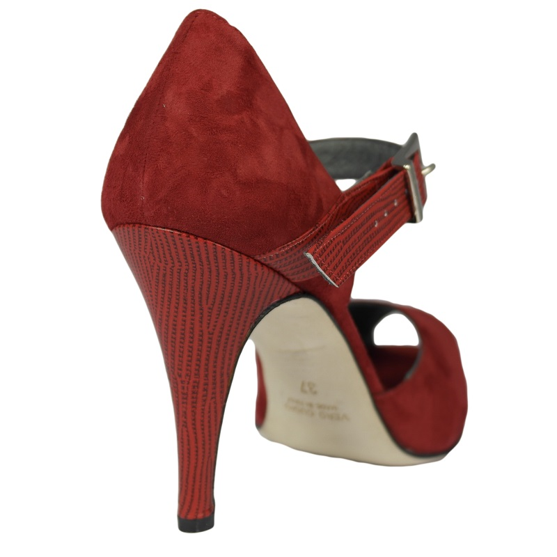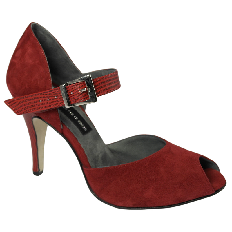 Der Tangoschuh 680 aus dem Hause Porteno & Bailarina in Rot. Aus Velourleder mit schönem Printlederriemchen und Printlederüberzogenem Absatz. Mit 95mm Absatz und Velourledersohle.