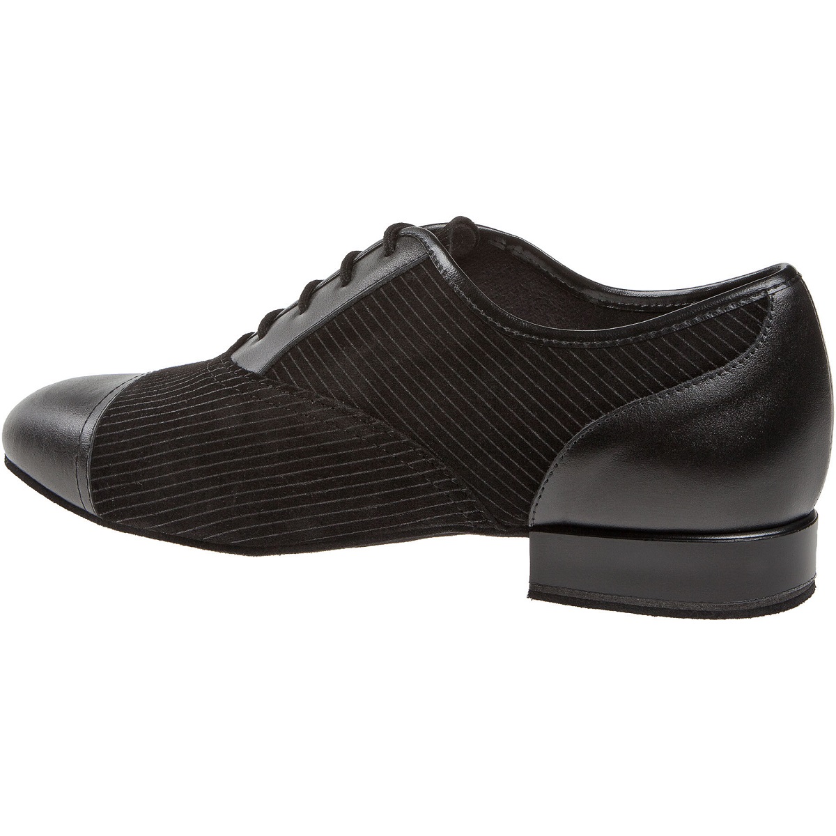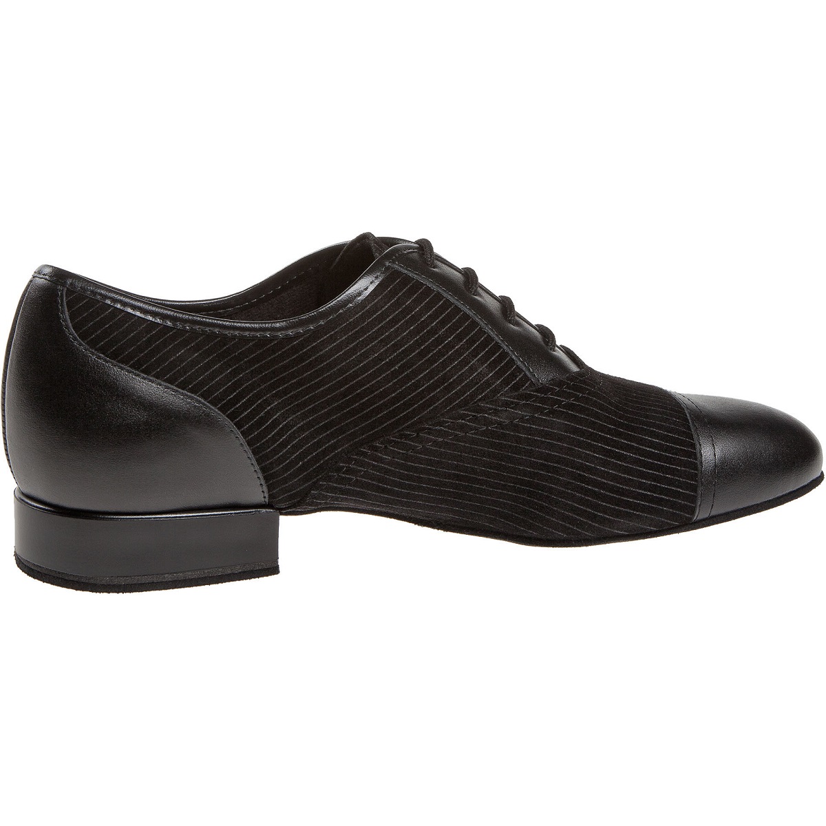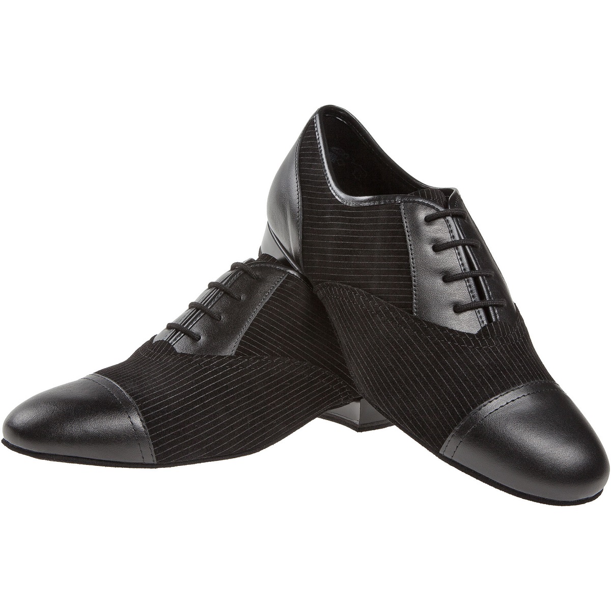 Mod. 077 Diamant Herren Tanzschuhe Made in Germany handgefertigt in klassischer Captoe Oxford Ausführung mit geschlossener 5-Loch Schnürung. Dieser Tanzschuh wird in der Weite G (Normalweite) mit einem Schock absorbierenden 2 cm Standard Absatz hergestellt. Als Innenauskleidung wird ein atmungsaktives, antibakterielles und Feuchtigkeit absorbierendes Microfaser aus italienischer Premium-Herstellung eingearbeitet. Für die Obermaterialien aus schwarz Nappaleder kombiniert mit schwarz Laser Velourleder mit Nadelstreifenmuster werden weiche Leder aus Italien verwendet.