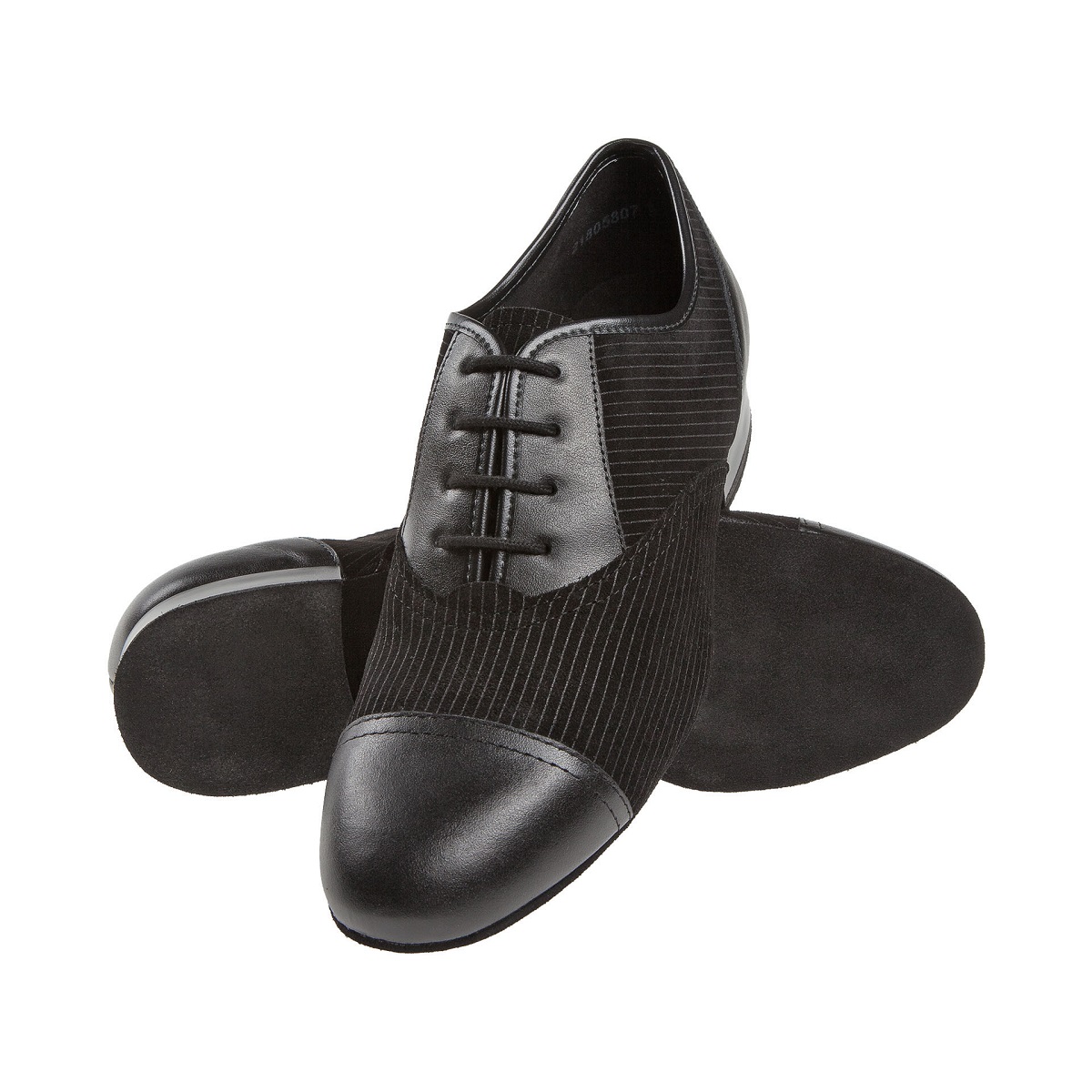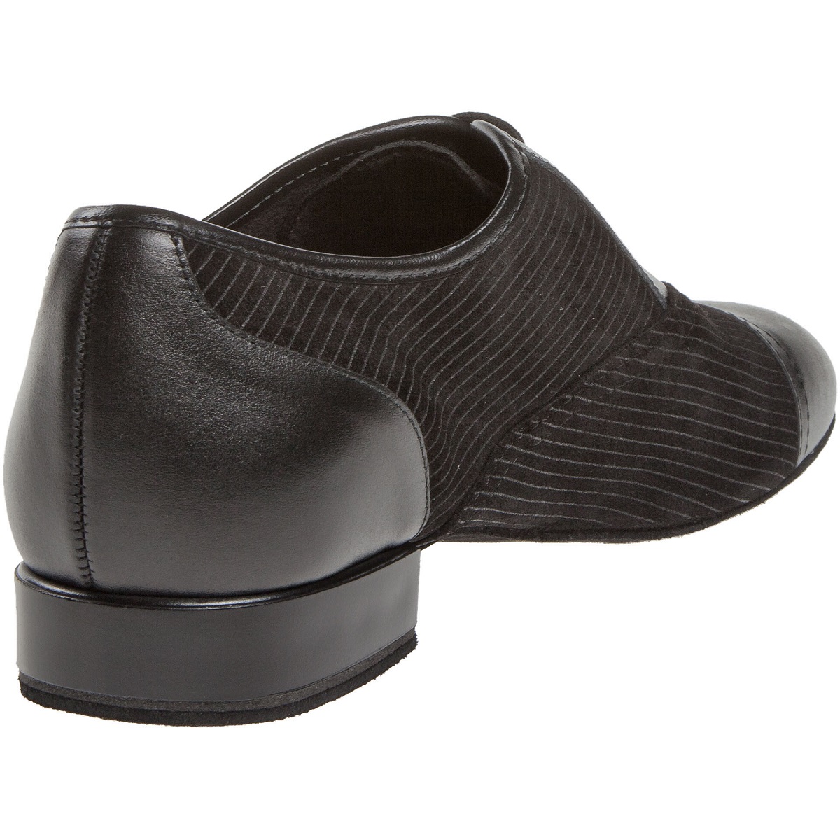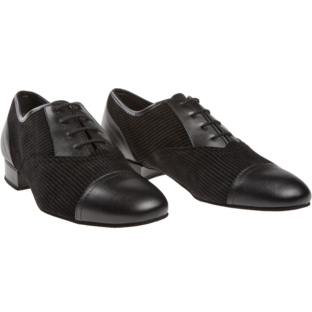 Mod. 077 Diamant Herren Tanzschuhe Made in Germany handgefertigt in klassischer Captoe Oxford Ausführung mit geschlossener 5-Loch Schnürung. Dieser Tanzschuh wird in der Weite G (Normalweite) mit einem Schock absorbierenden 2 cm Standard Absatz hergestellt. Als Innenauskleidung wird ein atmungsaktives, antibakterielles und Feuchtigkeit absorbierendes Microfaser aus italienischer Premium-Herstellung eingearbeitet. Für die Obermaterialien aus schwarz Nappaleder kombiniert mit schwarz Laser Velourleder mit Nadelstreifenmuster werden weiche Leder aus Italien verwendet.