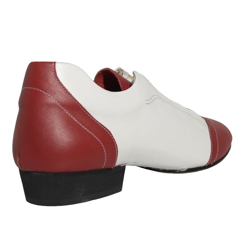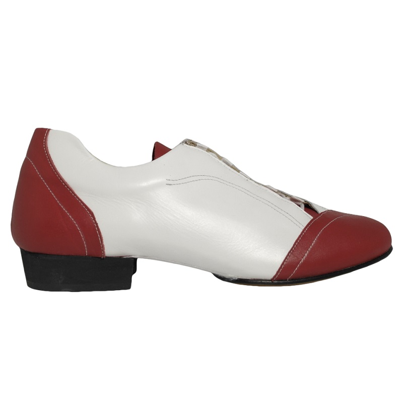 Längst nicht mehr nur für Profis - ein Tanzschuh mit austauschbarem Frontsohlenkern, hier in einer sportlichen Kalbsleder-Variante in rot-weiß, im Detail schön ausgearbeitet durch die Kontrastnähte, 35 mm Microsoftabsatz federt Stöße ab und schützt die Gelenke, die Splitsohle hat vorn einen Mittelbereich, den man, je nach Bodenbeschaffenheit mit Glattleder (Outdoor), Wildleder (auf Parkett) oder Gummi (für sehr rutschige Böden) bestücken kann. Das Leder ist weich, Kanten und Zungenstück abgepolstert, Einsätze sind im Preis enthalten und auch separat nachkaufbar.