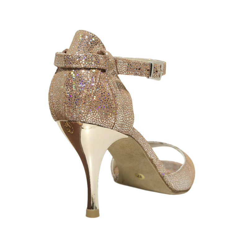 Aus der Serie "Pimp Your Danceshoe" von Porteno & Bailarina - Sandale mit geschlossener Ferse aus Glanzvelours in Cipria-Tönen, mit Schlaufen versehen, durch die auch farbige Bänder aus Organza oder Satin gezogen werden können. Das Modell hat Lederriemchen mit Schließe, die man (siehe Zubehör) in andere Farben oder in bunte Bänder austauschen kann. Decksohle aus Leder, Tanzsohle Wildleder, 80 mm Absatz Acryl, Ton in Ton lackiert und mit zartem Aluminiumstift verstärkt - P&B verbürgt sich für alle verwendeten Materialien in höchster Qualität, nach DIN Normen pflanzen-gefärbt für Umwelt und Tänzer. Der Schuh trägt seinen Namen in Erinnerung an die Tangopoetin Isabel Canaveri (1882 - 28. Februar 1945) - fast unbekannt schrieb Sie den Tango "Flor de Cardo" .. Carlos Gardel gab ihm den Namen "El Cardo Azul", hängte eine Oktave aus "Pobre Flor" dran und sang ihn als erster ..es gibt eine Aufnahme aus dem Jahr 1913