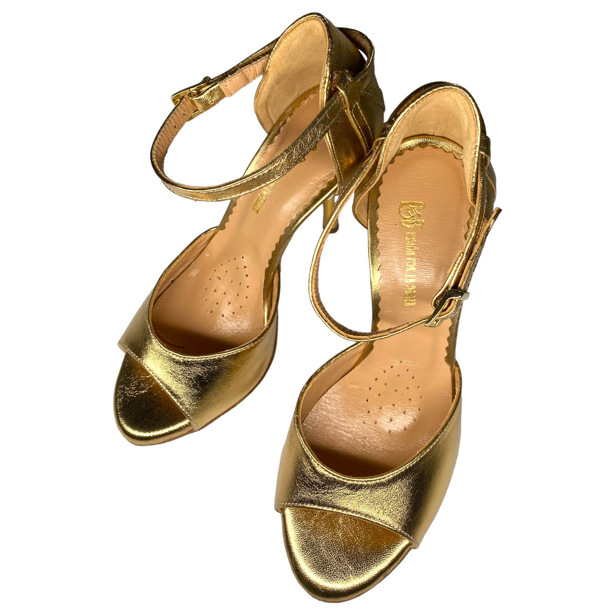 Aus der Serie "Pimp Your Danceshoe" Modell 1688 (ISABELL) von Porteno & Bailarina - schlichte Sandale hier in gold Leder, mit Schlaufen versehen, durch die auch farbige Bänder aus Organza oder Satin gezogen werden können. Das Modell hat Lederriemchen mit Schließe, die man (siehe Zubehör) in andere Farben oder in bunte Bänder austauschen kann. Decksohle aus Leder, Tanzsohle Wildleder, 80 mm Absatz Acryl, Ton in Ton lackiert und mit zartem Aluminiumstift verstärkt - P&B verbürgt sich für alle verwendeten Materialien in höchster Qualität, nach DIN Normen pflanzen-gefärbt für Umwelt und Tänzer.