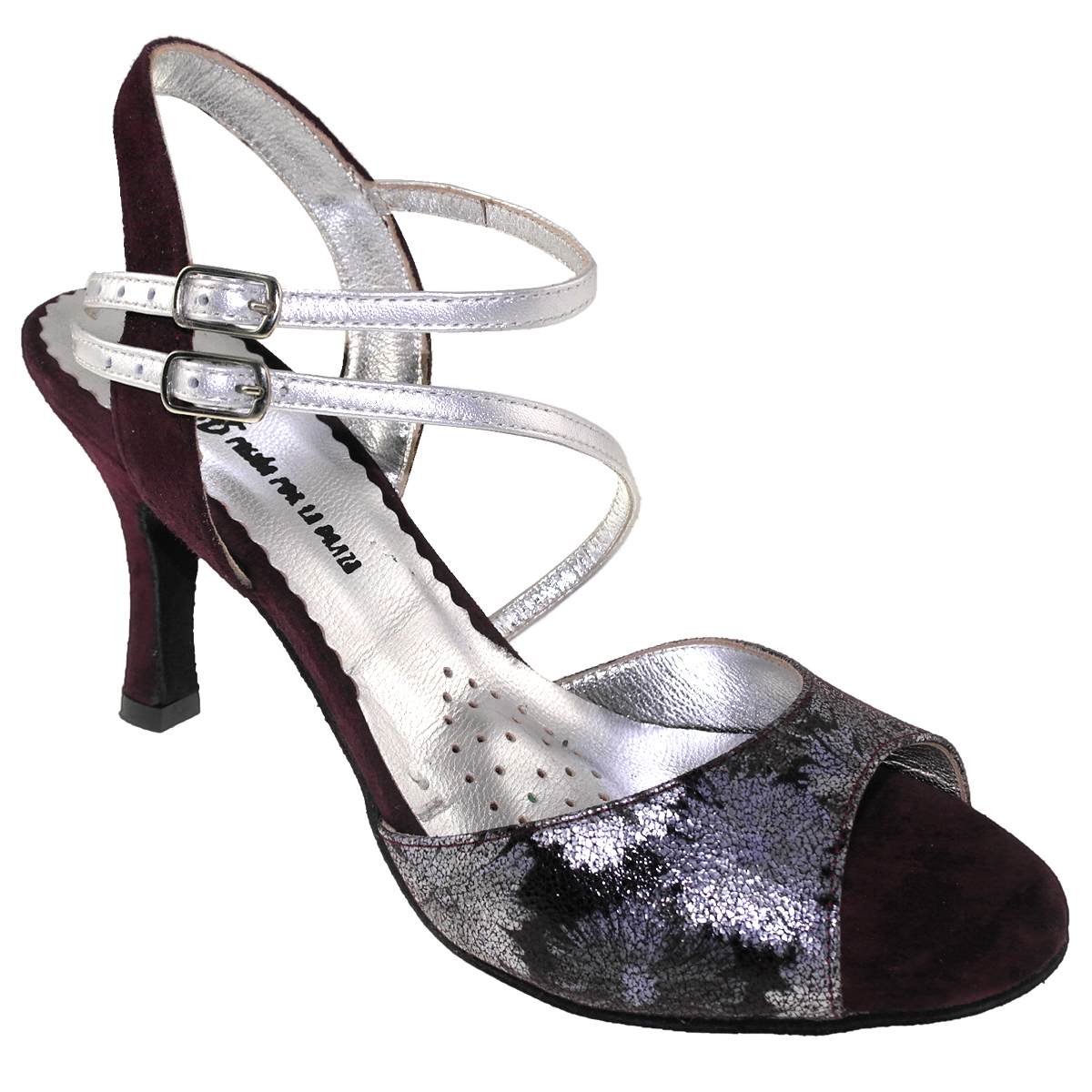 Ein neues Modell von Porteño & Bailarina aus softem, dunkelbordeaux-farbenem Wildleder in Kombination mit Eisblumen - schon fast ein Herbstmodell - oder für alle die gedeckte Farben bevorzugen. Die Blumen glänzen matt silbrig, das Fußbett ist stark abgefedert und hat eine sanfte Mittelfußstütze, die Deinen metatarsalen Knochen vorm schnellen Ermüden schützt. Weicher und komfortabler geht es nicht... Der Absatz ist bezogen und hat eine Höhe von 80mm, weiche Wildleder Tanzsohle