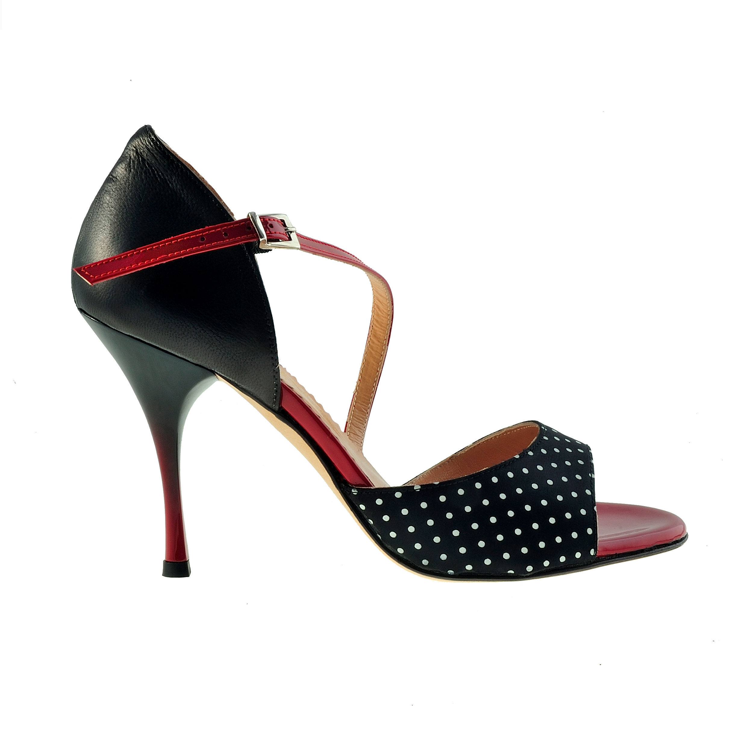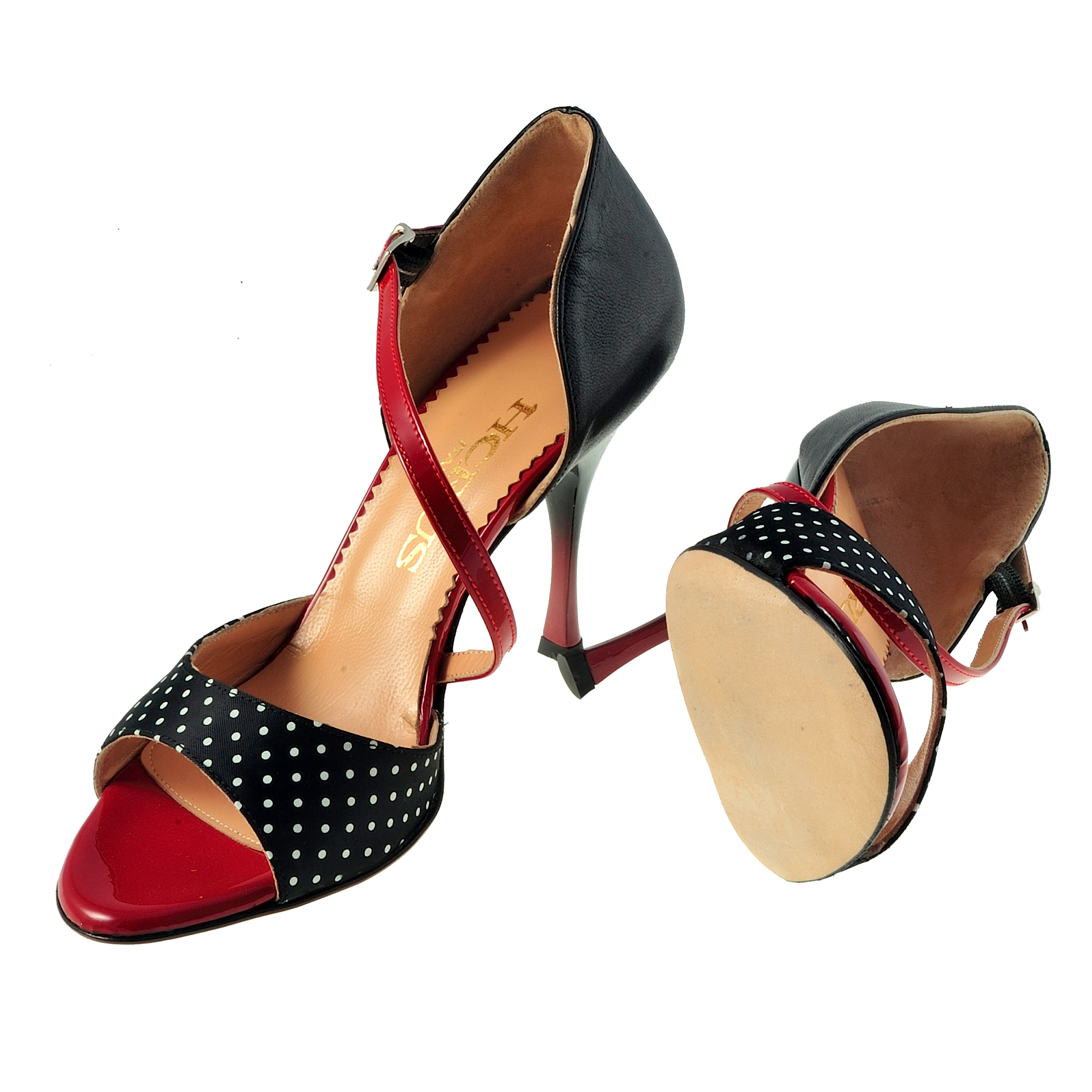 DOTTIE - Hochwertiger Tangoschuh von Horus, Italia - Weisse Pünktchen auf schwarzem Satin in Kombination mit rotem Lack und schwarzem Lammnappaleder. Eine gelungener Tangoschuh mit 90 mm Pfennig-Absatz und gut abgepolsterter Innensohle aus Leder. Tanzsohle unbehandeltes Leder, offenporig, mit dem man auch draussen laufen darf - praktisch in der kommenden Ballsaison um die Schuh bei Ankunft nicht wechseln zu müssen. Italienische Handarbeit aus europäischen Materialien.