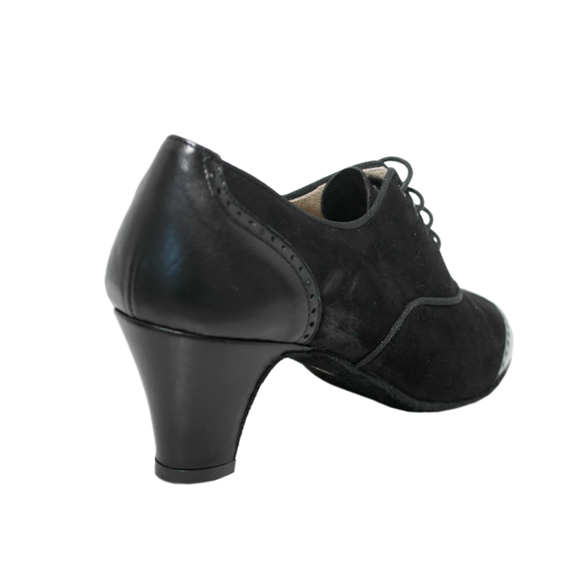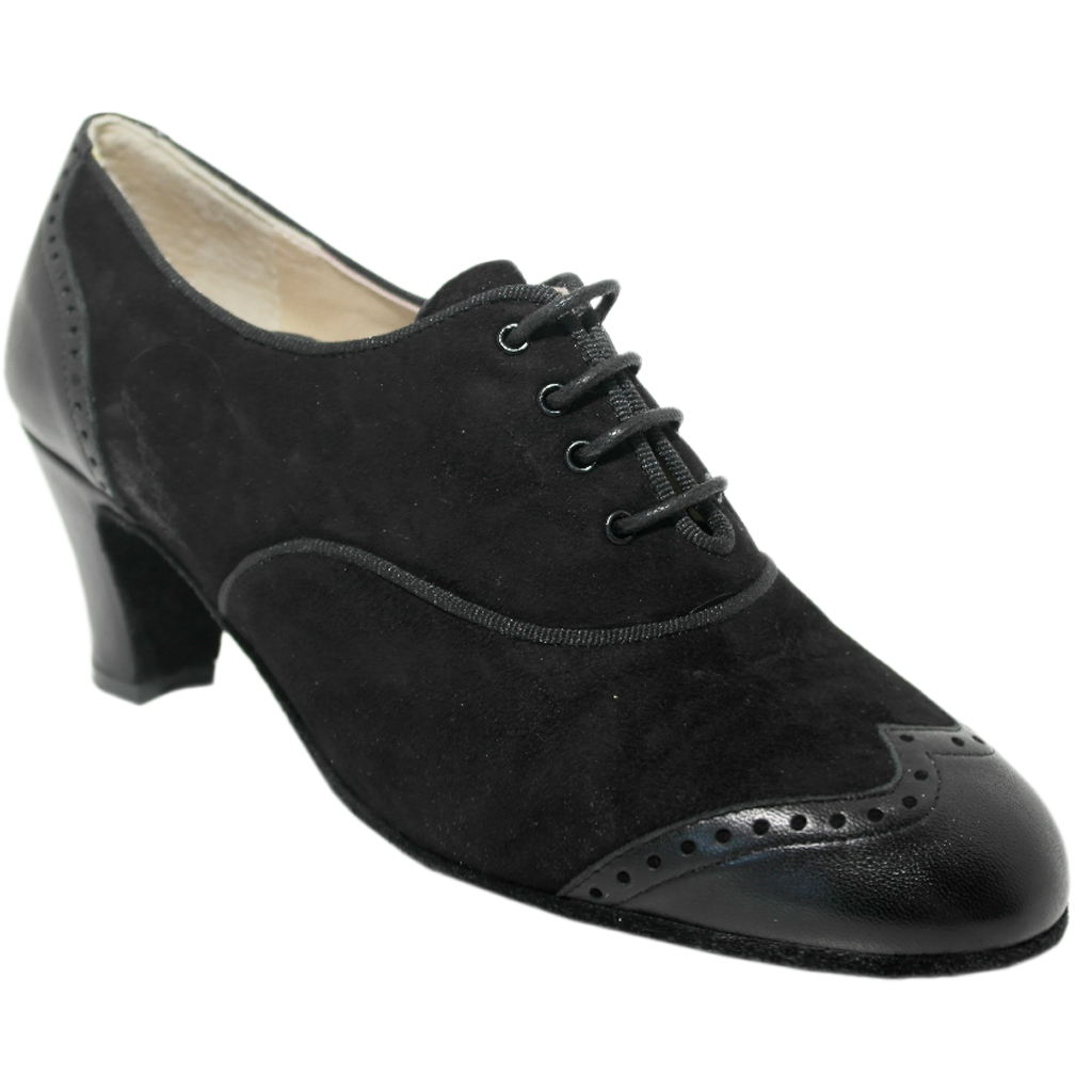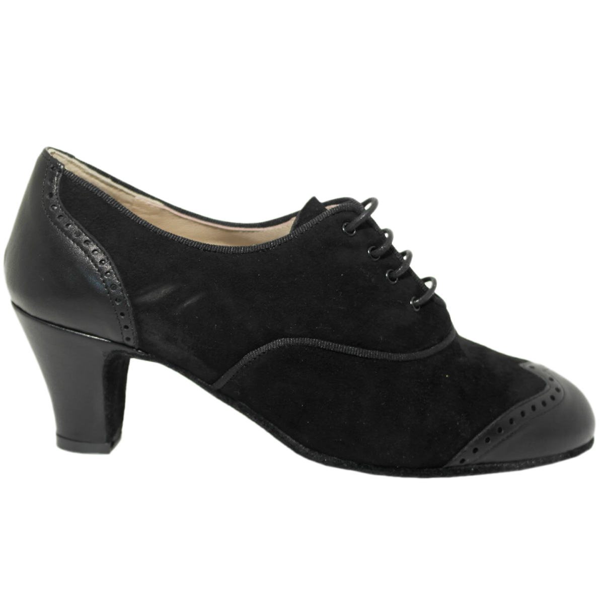 Ein Damentrainer von Porteño & Bailarina - geschnürter, geschlossener Tanzschuh im Look der 20er/30er Jahre. Durch den stabilen, nicht zu hohen Absatz ist dieser Schuh besonders für Frauen geeignet, die abwechselnd beide Rollen tanzen. 50 mm Absatz, Wildledersohle.