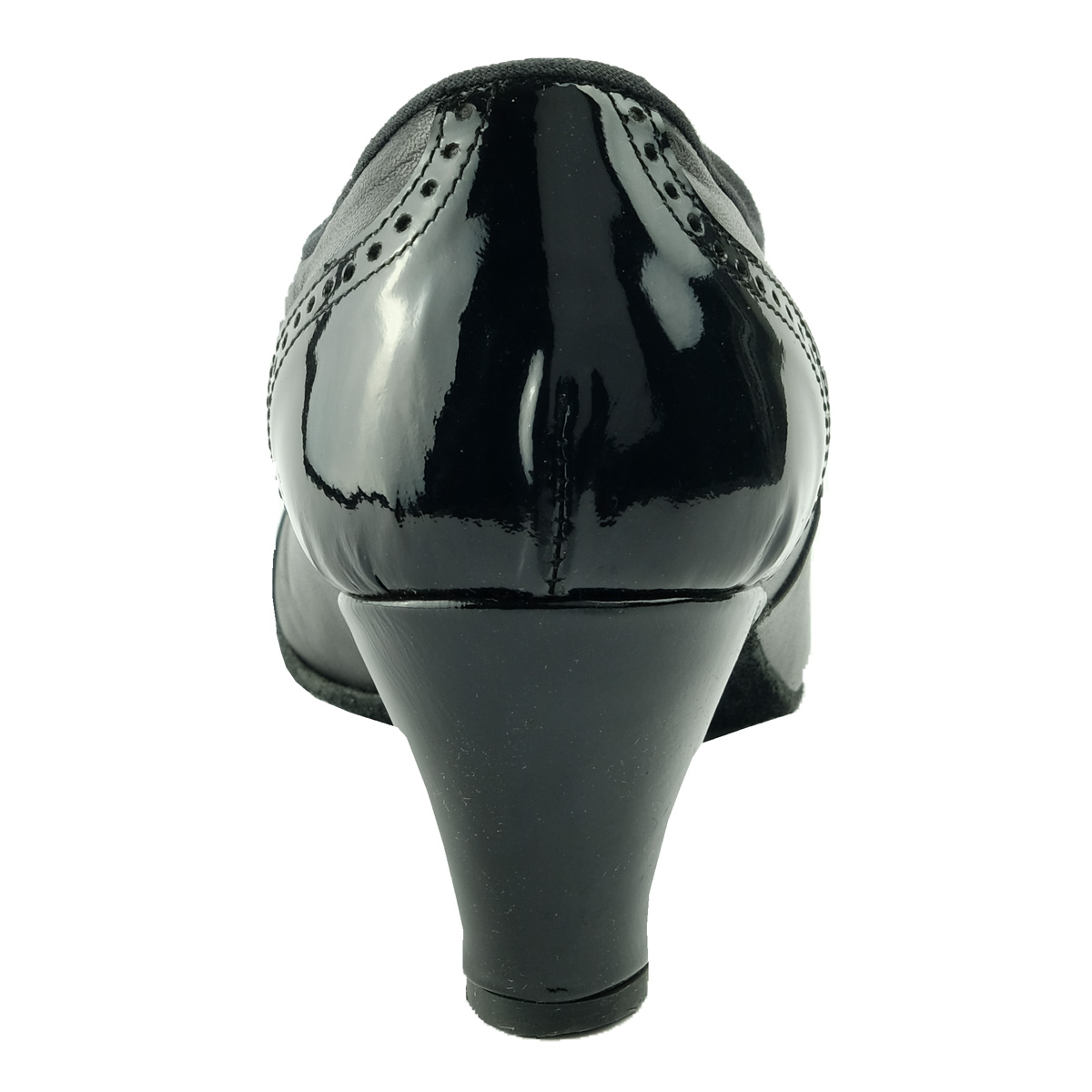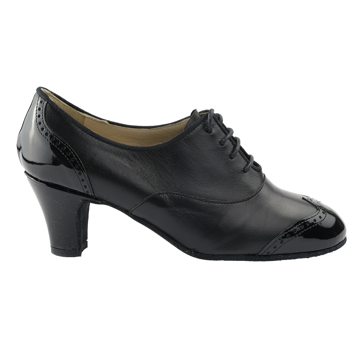 Ein Damentrainer in einer Kombination von schwarzem Lackleder und Nappaleder - geschnürter, geschlossener Tanzschuh im Look der 20er/30er Jahre. Durch den stabilen, nicht zu hohen Absatz ist dieser Schuh besonders für Frauen geeignet, die abwechselnd beide Rollen tanzen. 50 mm Absatz, Wildledersohle.