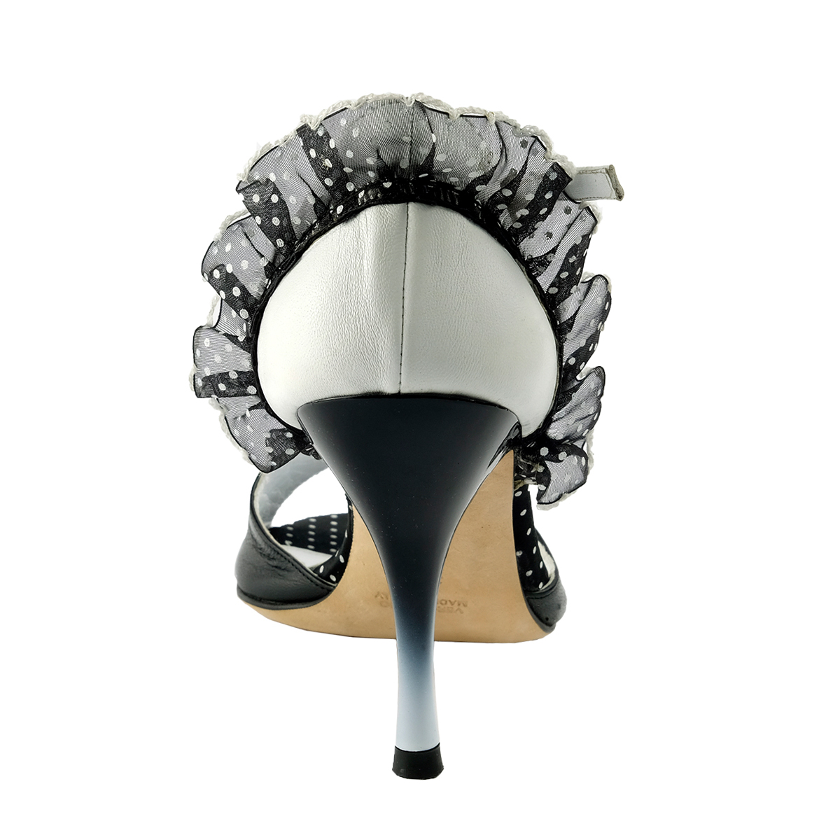 SCARLETT - ein wunderschöner Tangoschuh mit kleinen Details wie gepunktete Innensohle vorn, kleiner "Dots-Spitzenborte" an der geschlossenen Ferse, in schwarz-weiss mit 90mm Absatz der von weiss auf schwarz im Farbverlauf von Hand lackiert wurde. Tanzsohle unbehandeltes griffiges und flexibles Leder. Dieser Schuh ist also auch für die kommende Outdoor-Tanz-Saison geeignet