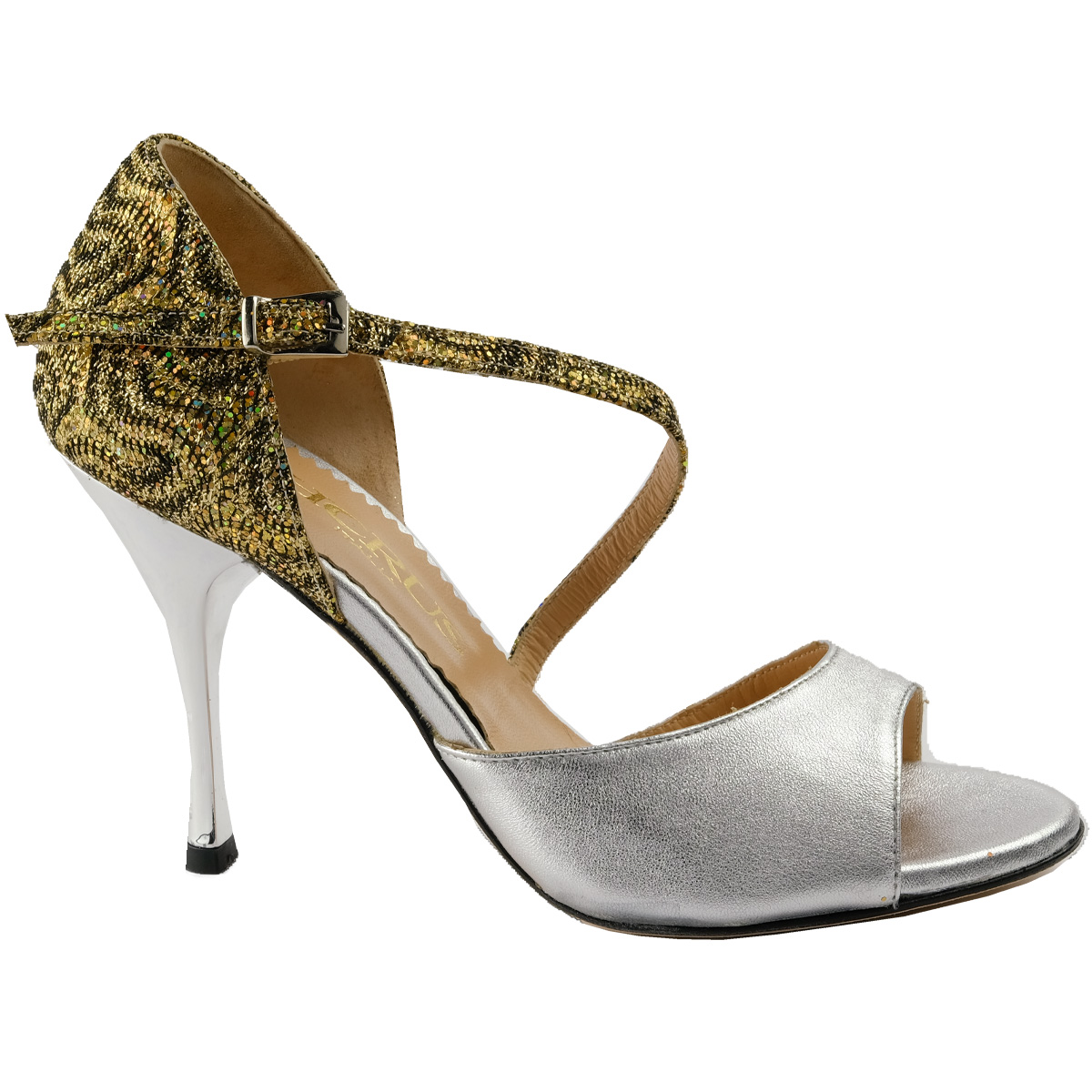 Hochwertiger Tangoschuh von Horus, Italien - Silbernes Lammnappaleder in Kombination mit goldener Glitter-Spitze hinten. Eine gelungener Tangoschuh mit 95 mm Pfennig-Absatz und gut abgepolsterter Innensohle aus Leder. Tanzsohle unbehandeltes Leder, offenporig, mit dem man auch draussen laufen darf - praktisch in der kommenden Ballsaison um die Schuh bei Ankunft nicht wechseln zu müssen. Italienische Handarbeit aus europäischen Materialien.