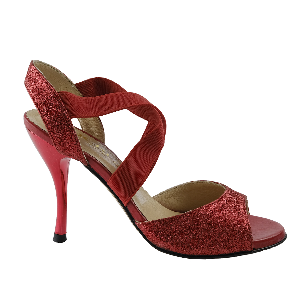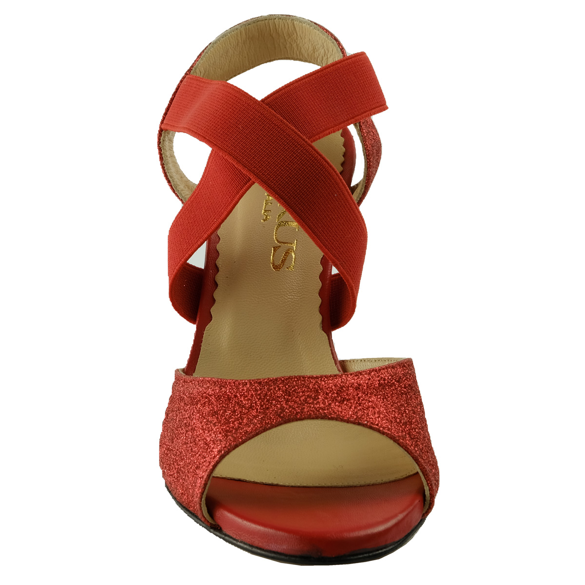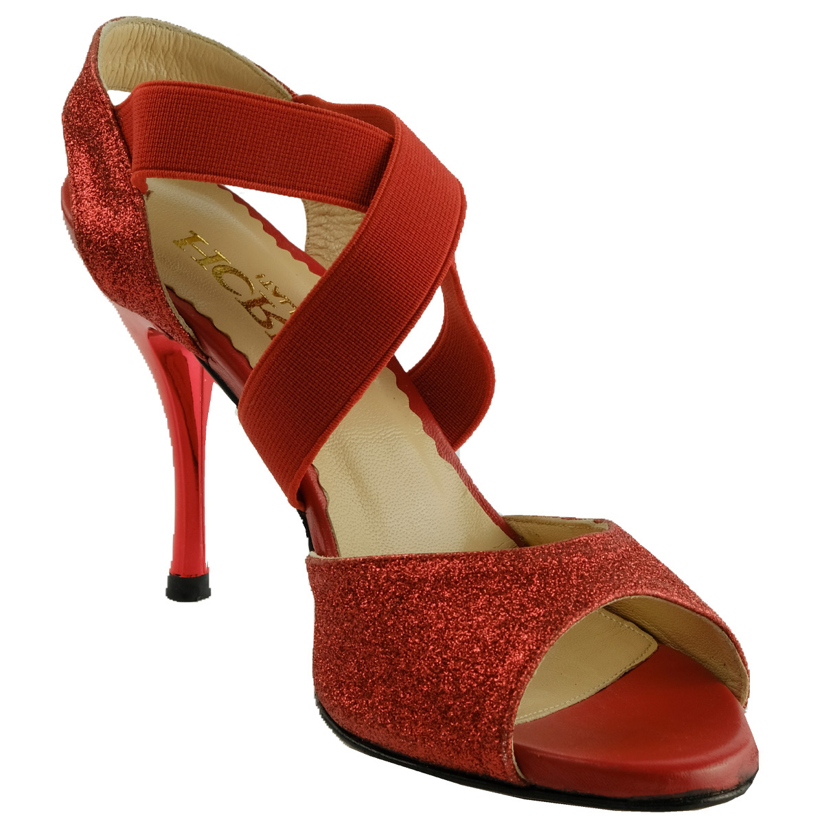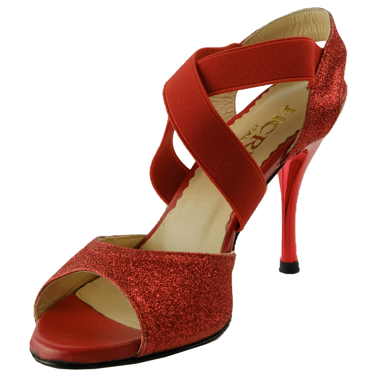 Die praktischste Erfindung seit es Tangoschuhe gibt... schnell rein und schnell raus mit den Modellen der "Elasticos"-Serie. Kein lästiges Auf- und Zumachen mehr in der halbdunklen Milonga. In LA TANA schlüpfst Du in Sekunden und verpasst keinen Takt Deiner Lieblingstanda. 90 mm Absatz. Die Sohle wie immer extrem gut abgeschäumt mit einer Schäumung mit hoher Dichte. So bleibt sie lange schön stabil, pflanzengefärbt in Europa. Eine griffige Ledersohle und gute Statik, hier in rot oder silber Glitzer vorn mit einer Slingferse mit praktischen Elastikbändern über dem Spann gekreuzt - kein lästiges Auf und Zumachen von kleinen Schnallen in dunklen Milongas mehr !! - das Elastik ist haltbar und engt nicht ein.