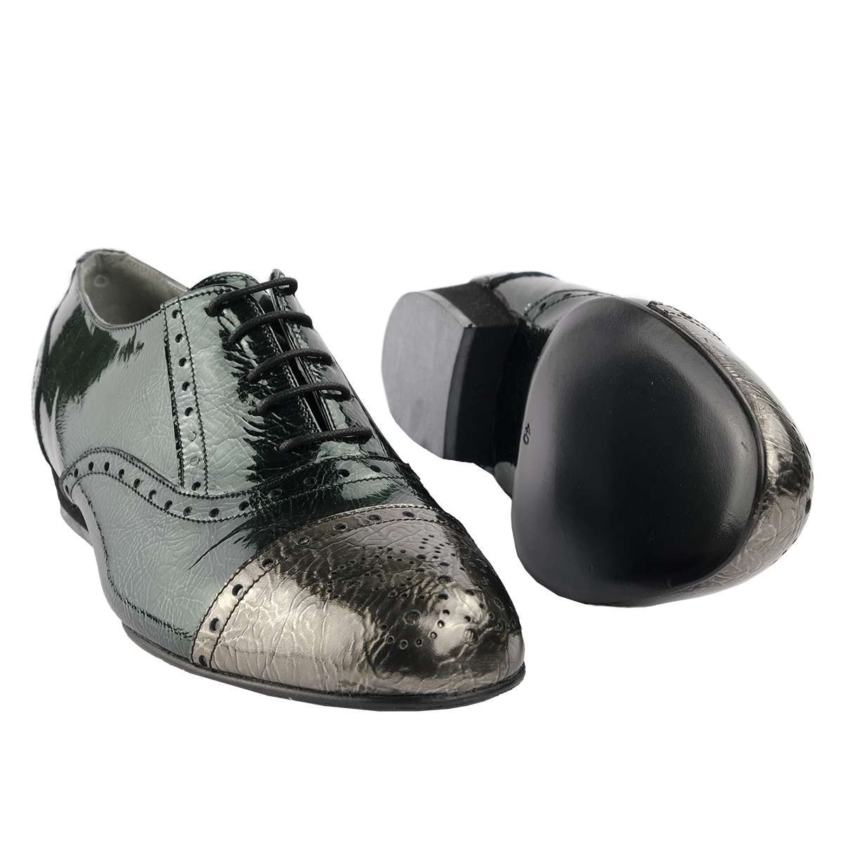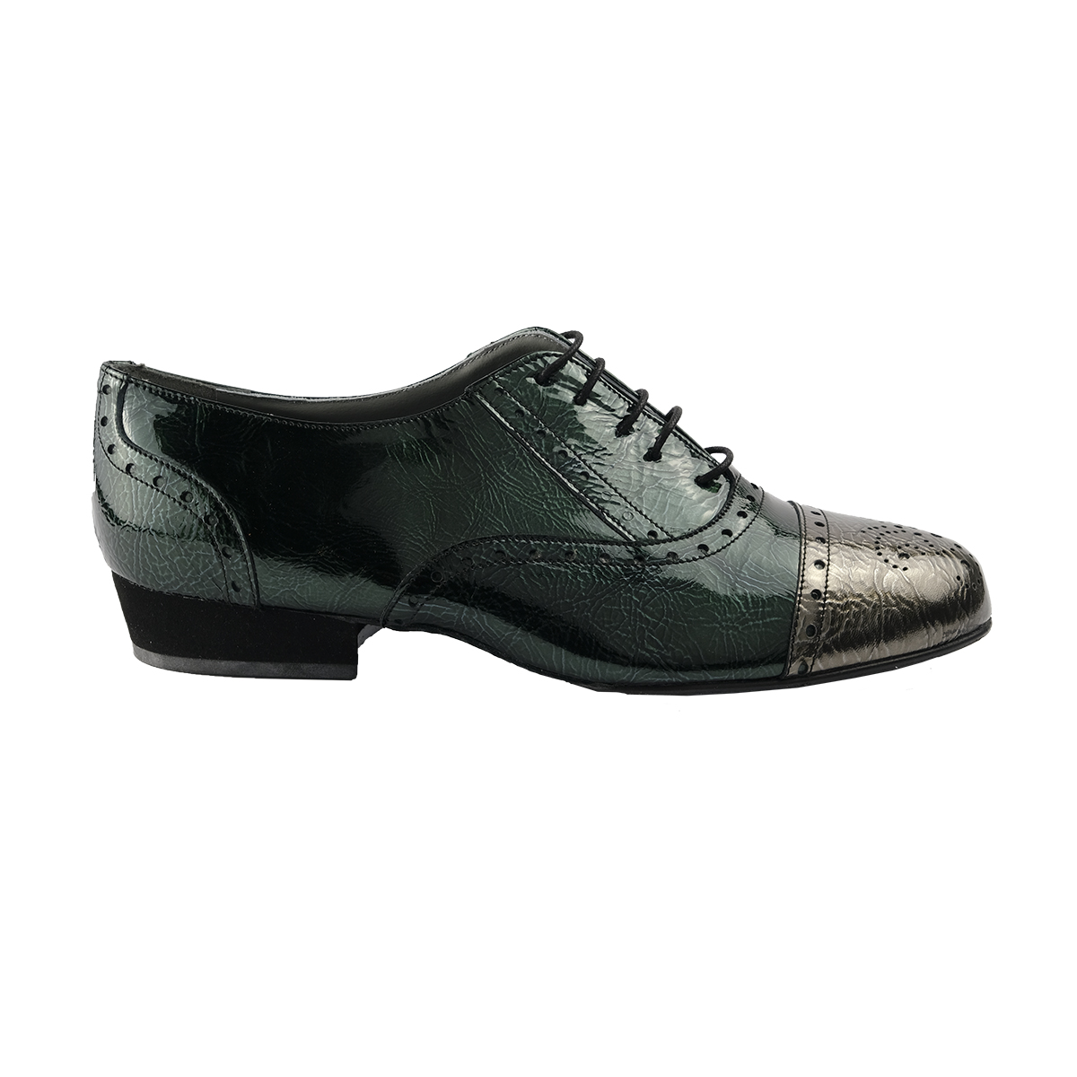 Das Modell 16154 CASIMIRO - ein italienischer Tanzschuh mit geteilter Sohle. Lochverzierung im Stil der 40er Jahre. Der 35 MCR Absatz federt Stöße ab und schont so Fuß- und Kniegelenke. Der Schuh ist wunderbar leicht, was ein schnelles Ermüden bei langem Tanzen verhindert. Mit der geteilten Leder Sohle hast Du maximale Flexibilität für jede Verzierung und kannst auch prima outdoor Milongas tanzen. Auffälliges Design in dunkelgrünem oder mitternachtsblauem Crash-Lack in Kombination mit der Farbe Antiksilber.
