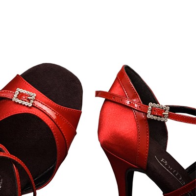 Die Lateinsandale PD135 aus einer schwarzen oder roten Kombination aus Satin und Lack. Mit dekorativer Schnalle, flexibeler Rauledersohle und 65 oder 75mm Absatz.