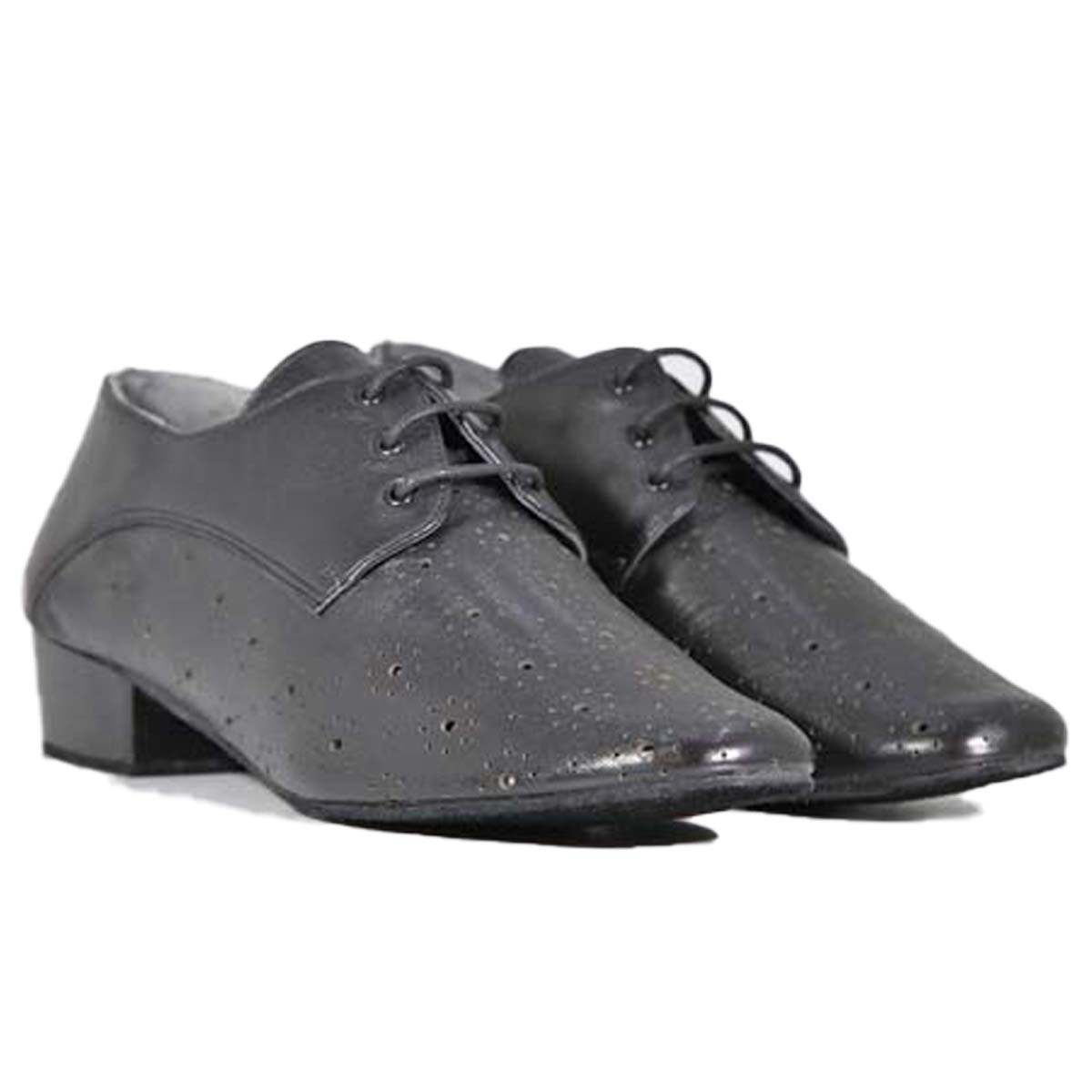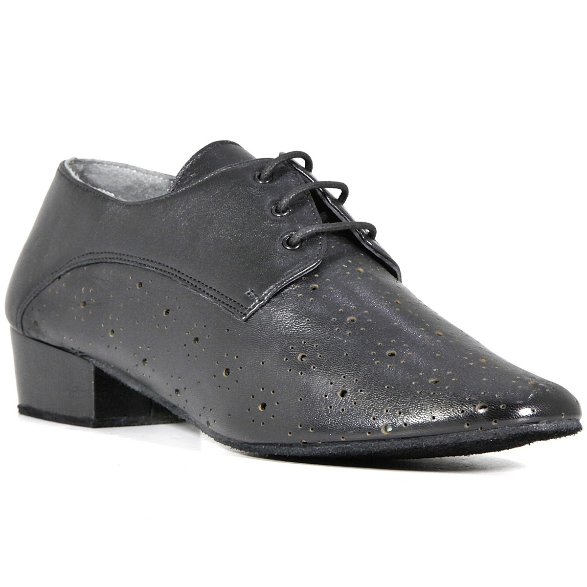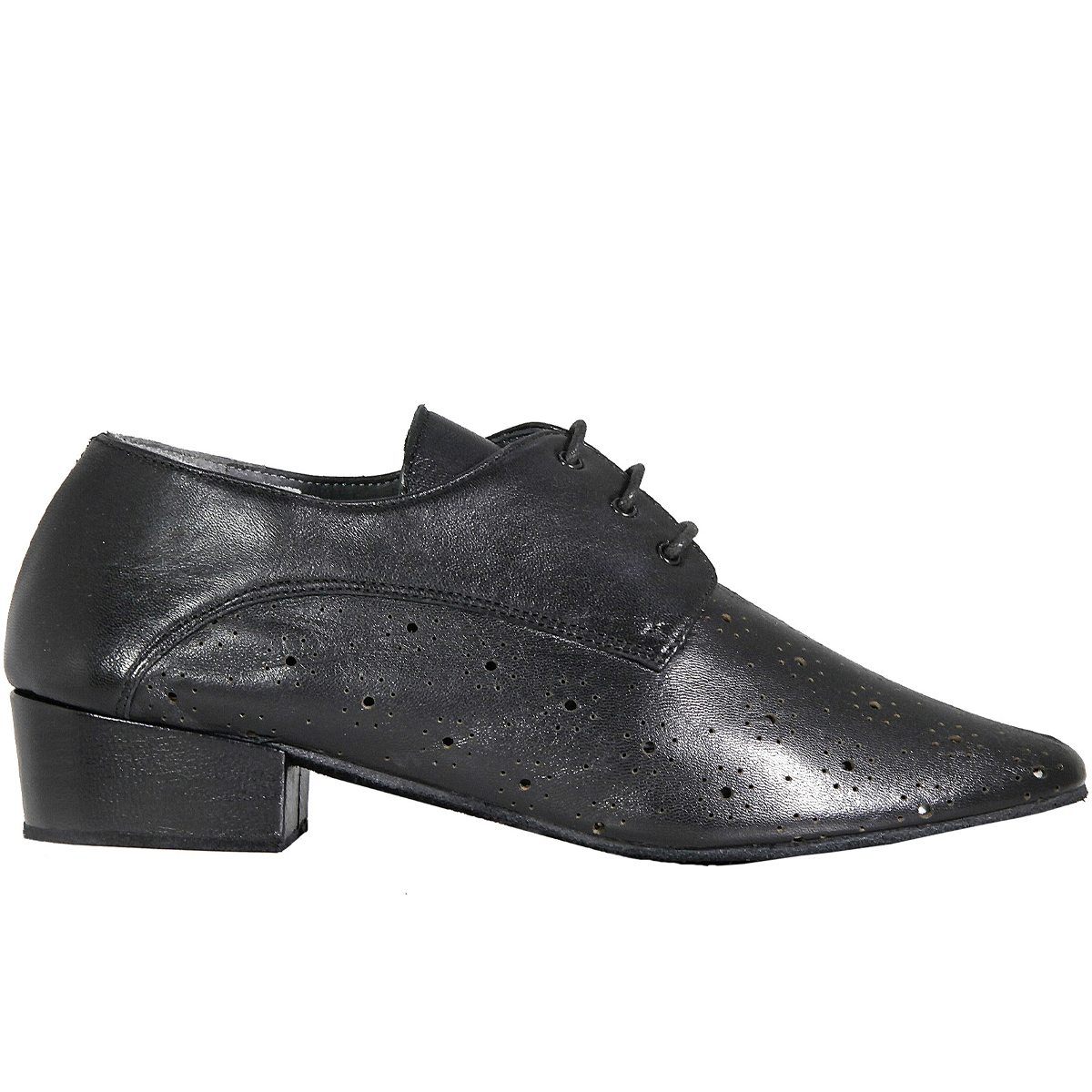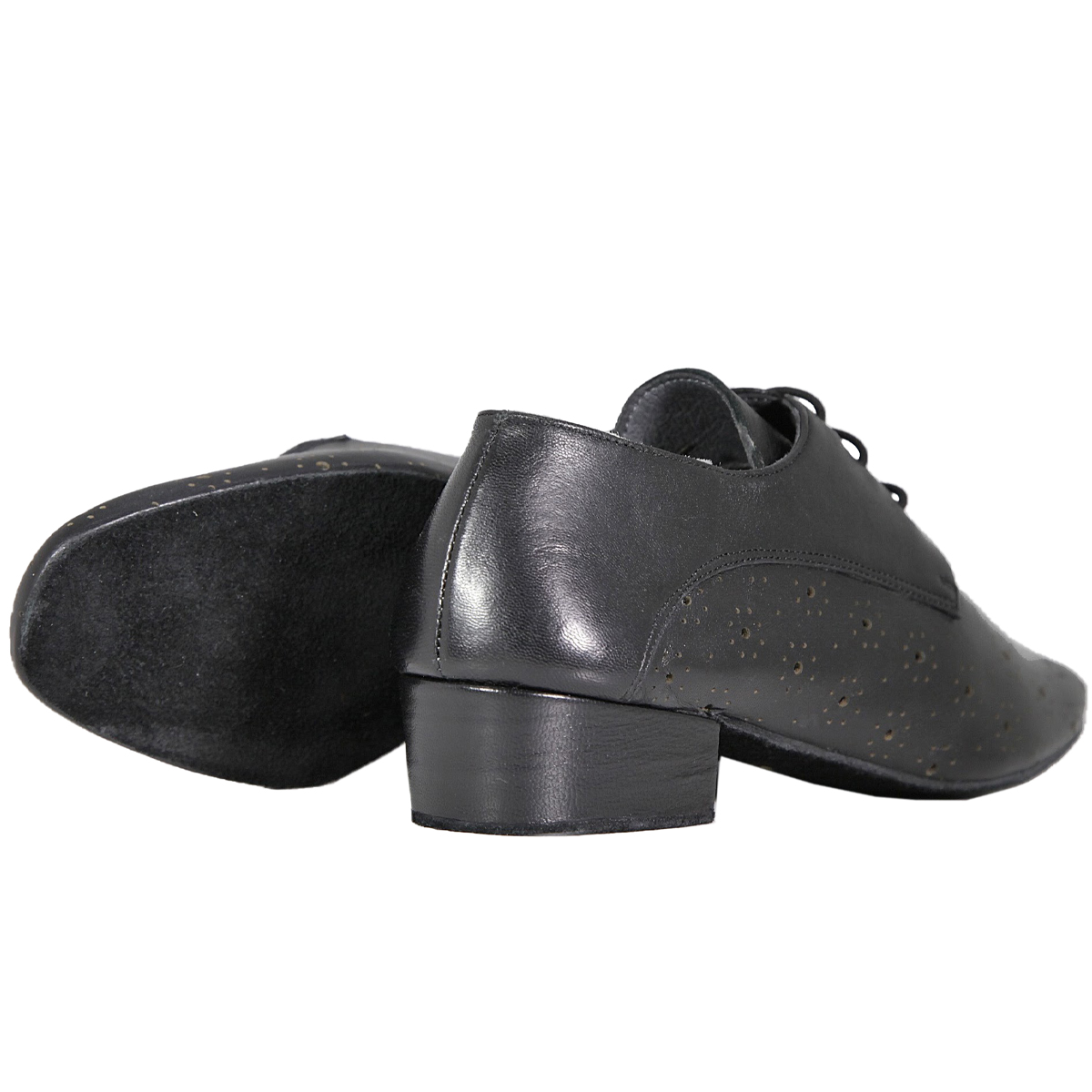 Damenführungsschuh SB35 Stellina in schwarzem Nappa-Leder mit einer Lochverzierung im vorderen Bereich, - ein klassischer Herrenschuh, gemacht auf einem Damenleisten nur für Frauen mit einem stossfedernden MCR Absatz 35 mm und griffiger Wildledersohle. Alle Materialien pflanzengefärbt und giftfrei. Es gibt so viele Frauen die beim Tanzen führen, und keine Heels gebrauchen können. Auf Herrrenmodelle in kleinen Größen ausgewichen, ergibt sich das Problem, dass die Leisten zu breit geschnitten sind. Daher hat Porteño & Bailarina einen Damen Führungsschuh herausgebracht. Ein maskuliner Schnitt auf einem Leisten für Damenanatomie gearbeitet.