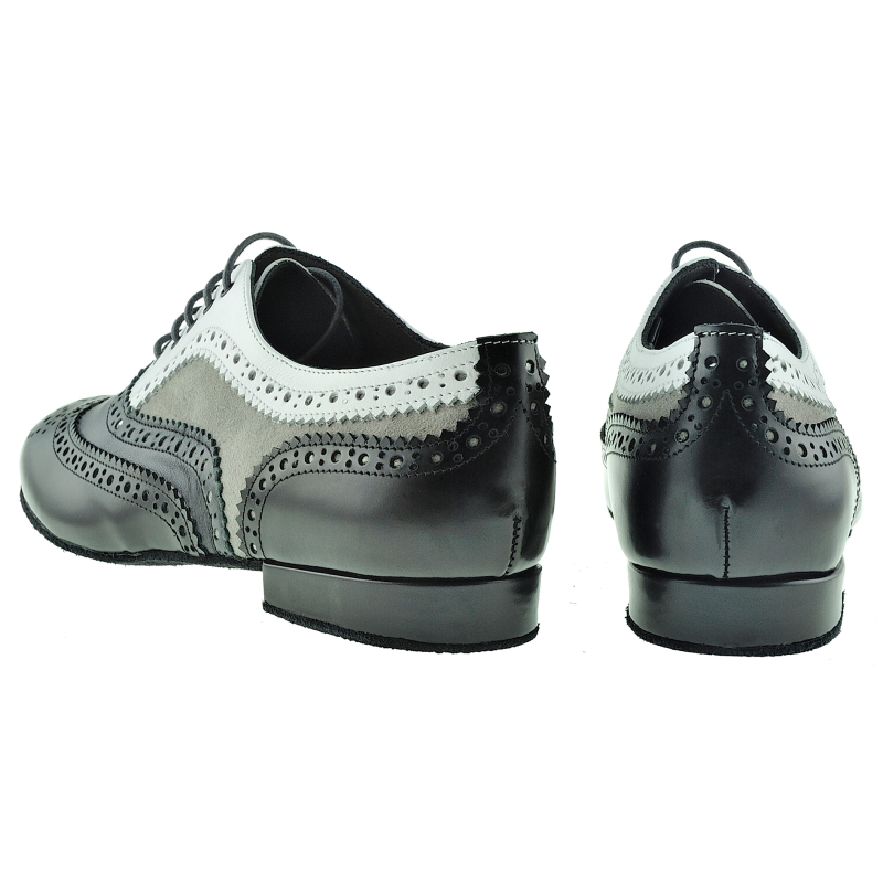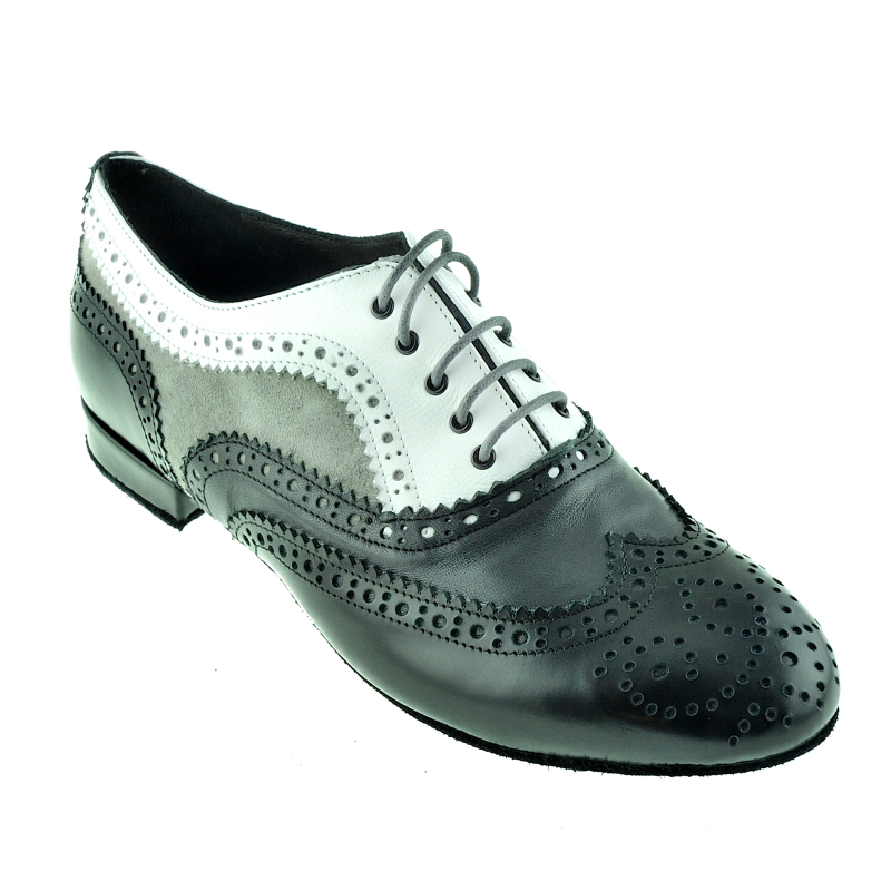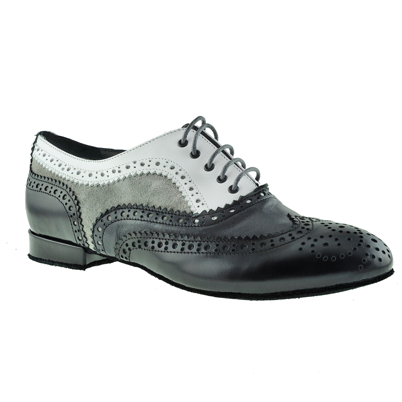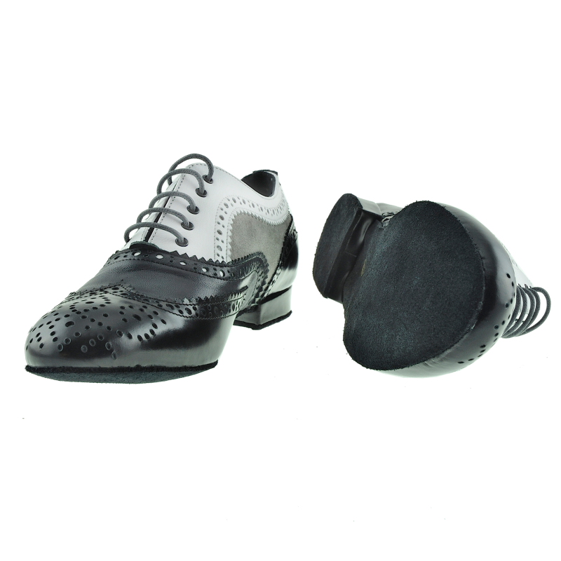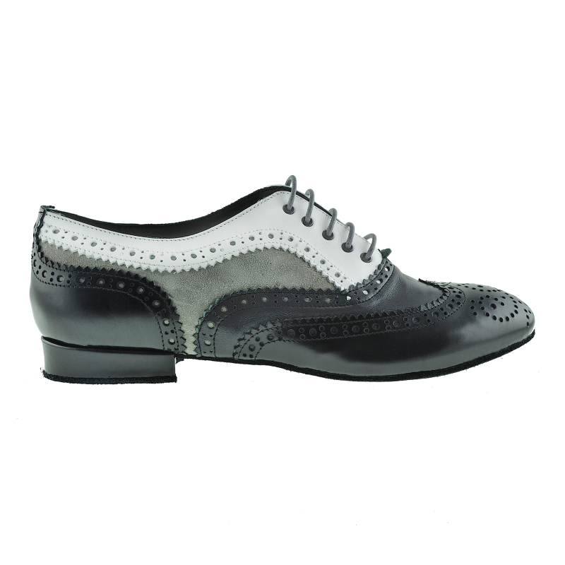 Damenführungsschuh TG01 in schwarzem Abrasivato-Leder (elegant glänzend aber kein Lack) in Kombination mit weiss, sowie grauem Nappa und taupe Wildleder - vom Feinsten ausgearbeitet mit Budapesterr Lochverzierung, - ein klassischer Herrenschuh, gemacht auf einem Damenleisten nur für Frauen mit einem stossfedernden MCR Absatz 20 mm und griffiger Wildledersohle. Alle Materialien pflanzengefärbt und giftfrei. Es gibt so viele Frauen die beim Tanzen führen, und keine Heels gebrauchen können. Auf Herrrenmodelle in kleinen Größen ausgewichen, ergibt sich das Problem, dass die Leisten zu breit geschnitten sind. Daher hat Porteño & Bailarina einen Damen Führungsschuh herausgebracht. Ein maskuliner Schnitt auf einem Leisten für Damenanatomie gearbeitet.