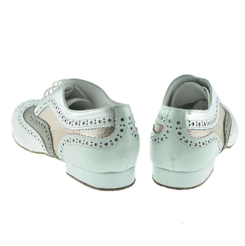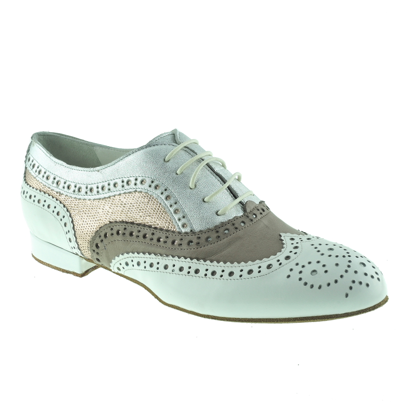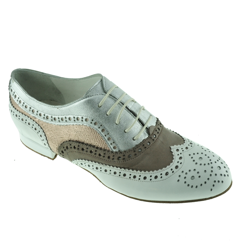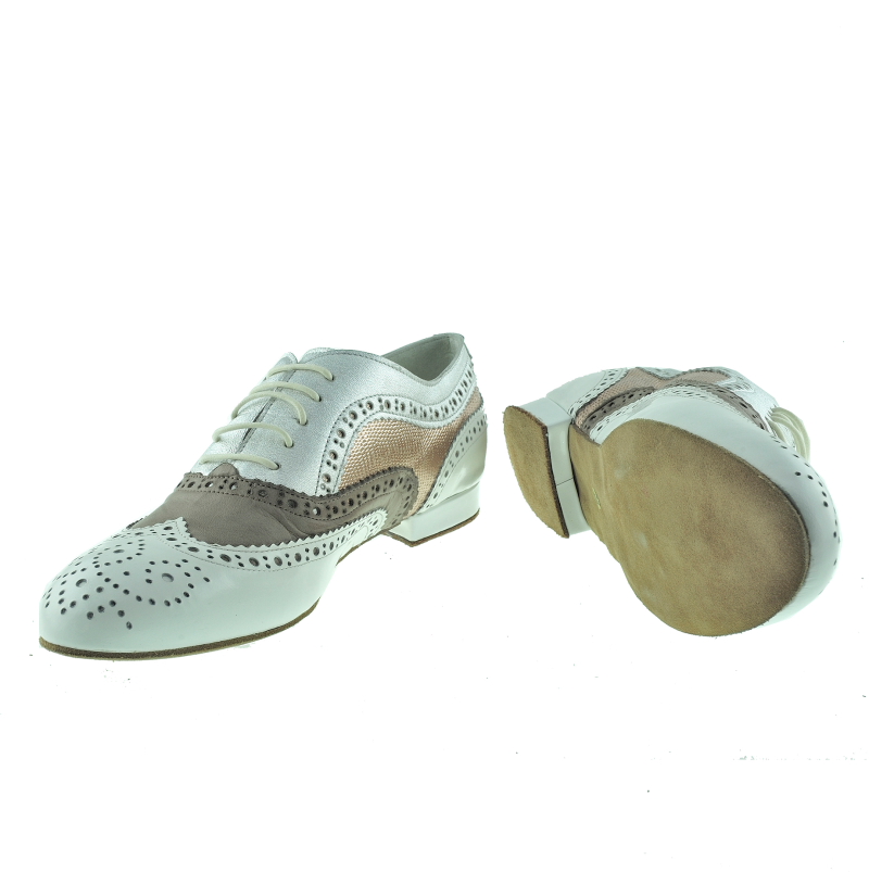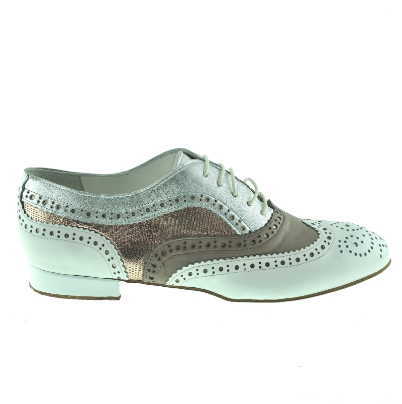 Damenführungsschuh BR200 in weißem Abrasivato-Leder (elegant glänzend aber kein Lack) in Kombination mit silber, kupfer und taupe Nubuk - vom Feinsten ausgearbeitet mit Budapesterr Lochverzierung, - ein klassischer Herrenschuh, gemacht auf einem Damenleisten nur für Frauen mit einem stossfedernden MCR Absatz 20 mm und griffiger Wildledersohle. Alle Materialien pflanzengefärbt und giftfrei. Es gibt so viele Frauen die beim Tanzen führen, und keine Heels gebrauchen können. Auf Herrrenmodelle in kleinen Größen ausgewichen, ergibt sich das Problem, dass die Leisten zu breit geschnitten sind. Daher hat Porteño & Bailarina einen Damen Führungsschuh herausgebracht. Ein maskuliner Schnitt auf einem Leisten für Damenanatomie gearbeitet.