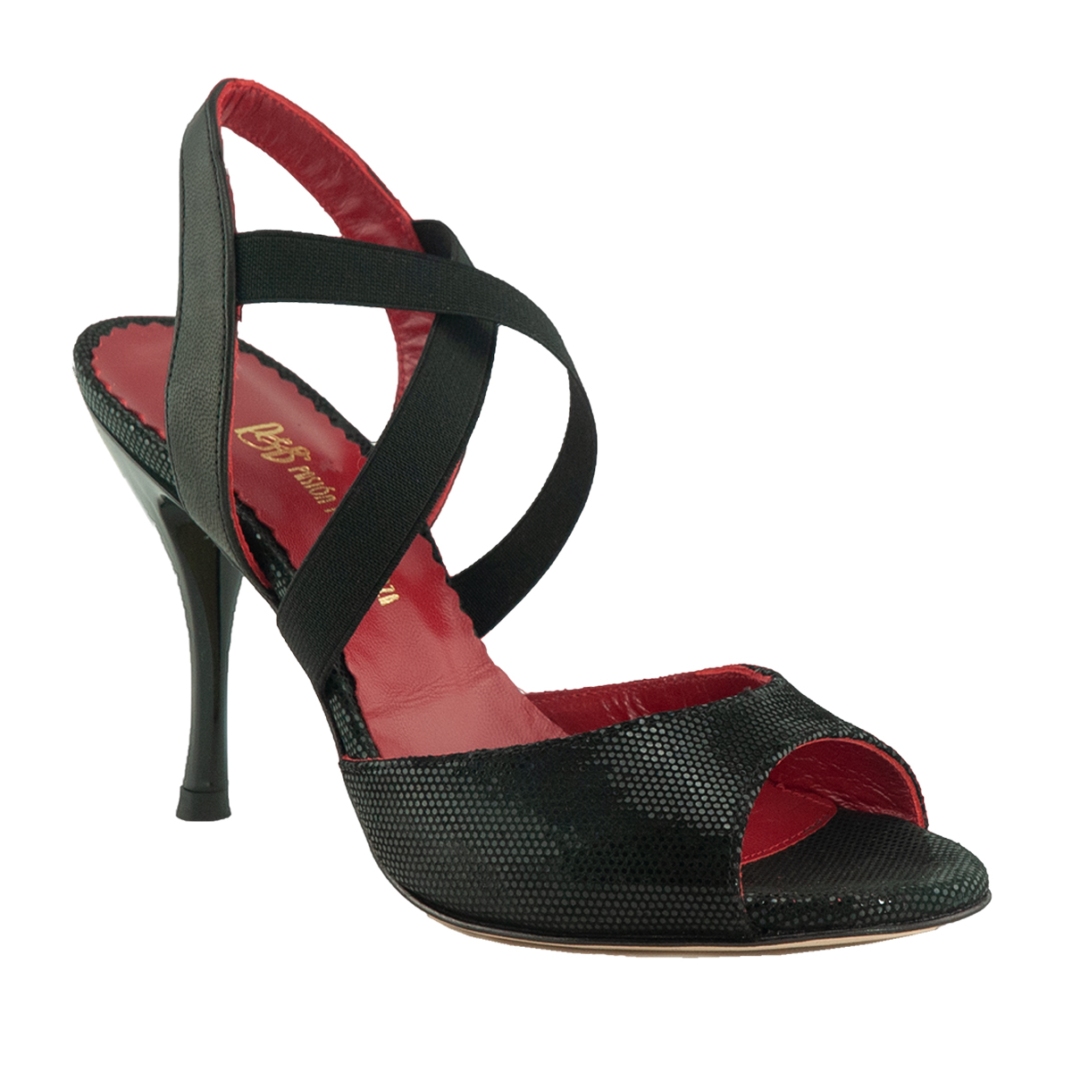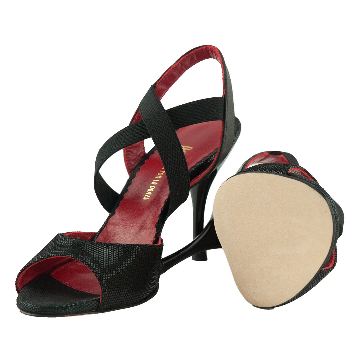 Die praktischste Erfindung seit es Tangoschuhe gibt... schnell rein und schnell raus mit den Modellen der "Elasticos"-Serie. Kein lästiges Auf- und Zumachen mehr in der halbdunklen Milonga. In LA TANA schlüpfst Du in Sekunden und verpasst keinen Takt Deiner Lieblingstanda. Hier die Variante /A mit schmalerem Elastik. 80mm oder 90mm Absatz. Die Sohle wie immer extrem gut abgeschäumt mit einer Schäumung mit hoher Dichte. So bleibt sie lange schön stabil, pflanzengefärbt in Europa. Eine griffige Wildledersohle und gute Statik, immer groß geschrieben bei Porteño & Bailarina- hier in schwarzem Glanzleder mit praktischen Elastikbändern überm Spann gekreuzt - kein lästiges Auf und Zumachen von kleinen Schnallen in dunklen Milongas mehr !! - das Elastik ist haltbar und engt nicht ein, Sohle = offenporiges Leder (auch outdoor) aber auch mit griffigem Wildleder (nicht für draussen) bei uns im Shop.