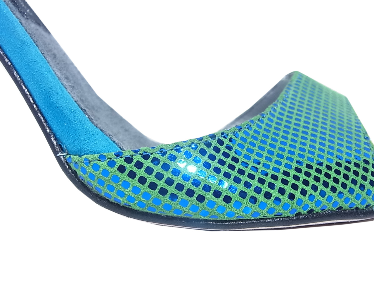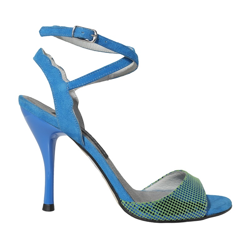 Besonders schöne Tango Slingsandale von Porteno & Bailarina, weiches, positano-blaues Wildleder hinten, im Frontbereich grünes Softleder, auf das zarte Pailletten in kleinen Vierecken appliziert wurde, der Verschlussriemen wird um den Spann gekreuzt, das die Sandale sehr hoch wirken lässt, real aber ist der sorgfältig Ton-in-Ton lackierte Acrylabsatz 80 oder 90 mm hoch, die samtige Tanzshohle in Wildleder gibt guten Halt auch auf rutschigen Böden, besonders gut auf Parkett...