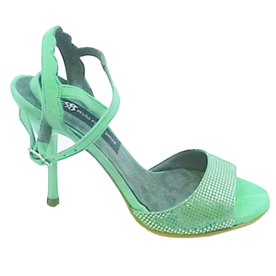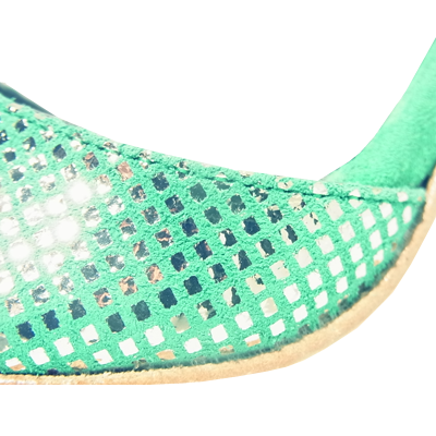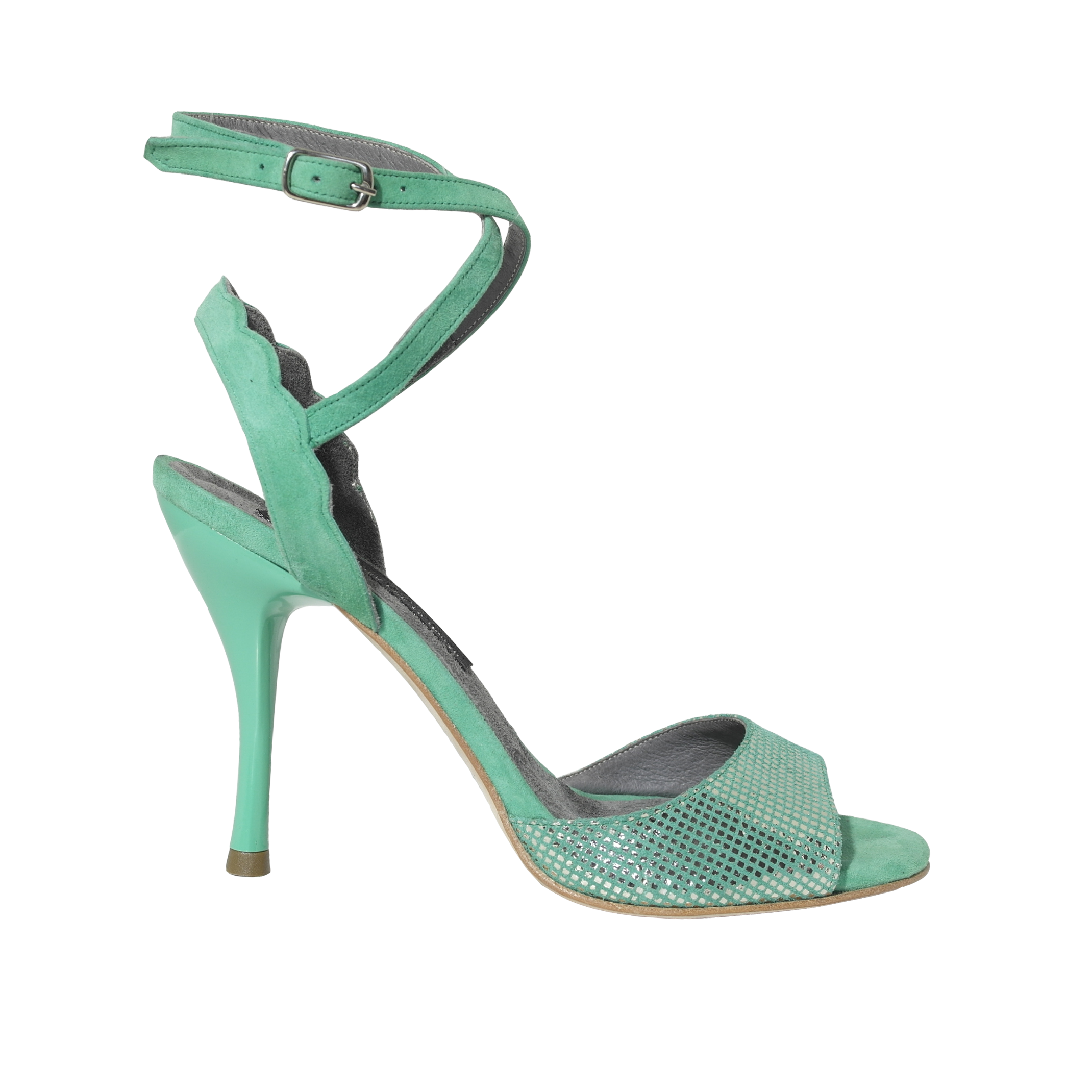Besonders schöne Tango Slingsandale von Porteno & Bailarina, weiches, mintgrünes Wildleder hinten, im Frontbereich grünes Softleder, auf das zarte Pailletten in kleinen Vierecken appliziert wurde, der Verschlussriemen wird um den Spann gekreuzt, das die Sandale sehr hoch wirken lässt, der sorgfältig Ton-in-Ton lackierte Acrylabsatz  ist 90 mm hoch, die samtige Tanzshohle aus offenporigem Leder gibt guten Halt auch auf rutschigen Böden, besonders gut auf Parkett...