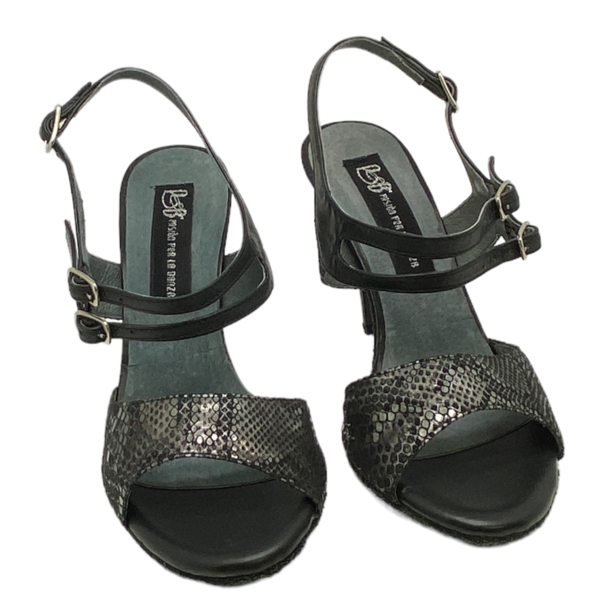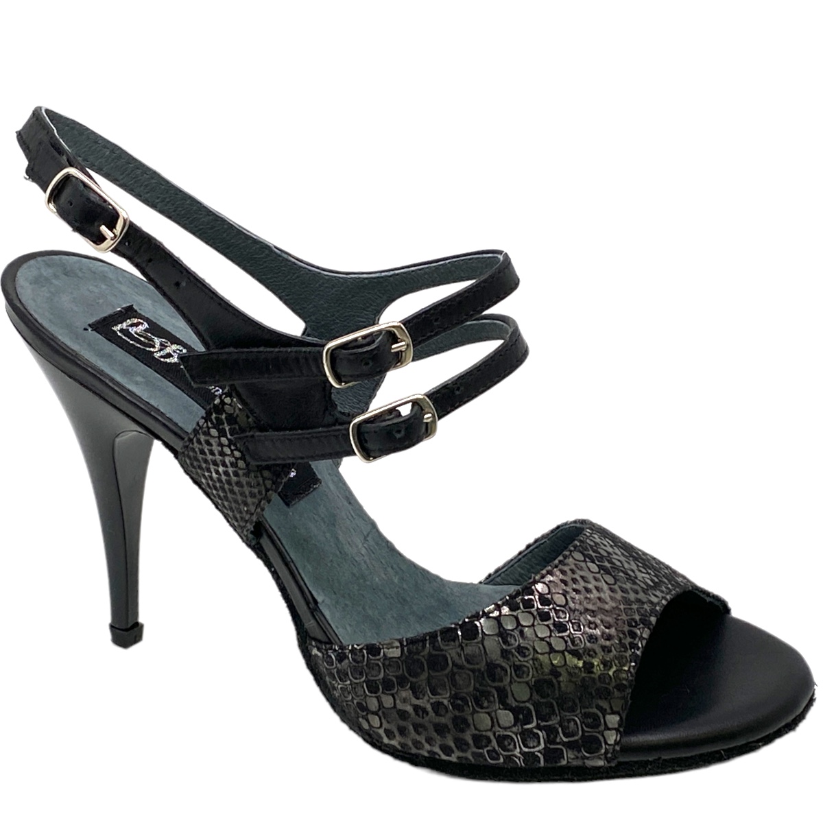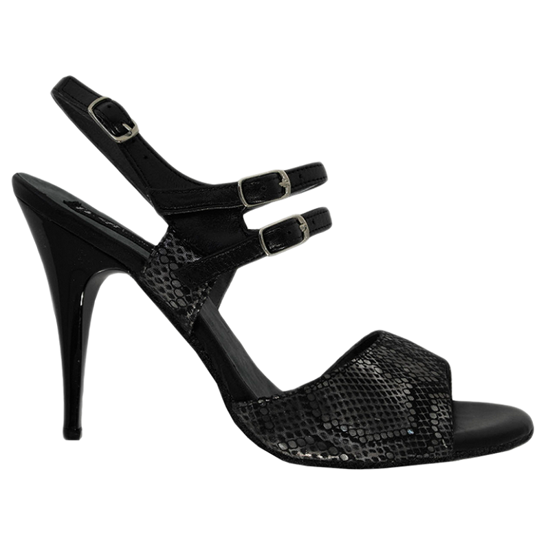 Portena & Bailarina - Modell 444 mit 95 mm lackiertem Acrylabsatz und griffiger Wildledersohle, hier im Material Megapython in Kombination von schwarzem Nappaleder hinten, Bequemlichkeit durch gut abgeschäumte Leder-Innensohle, 3-fach verstellbarer Verschlussriemen, Maximum an Balance durch ausgefeilte Statik, wie alle Modelle von Porteña & Bailarina