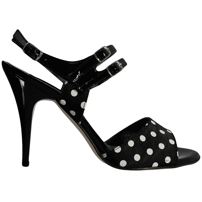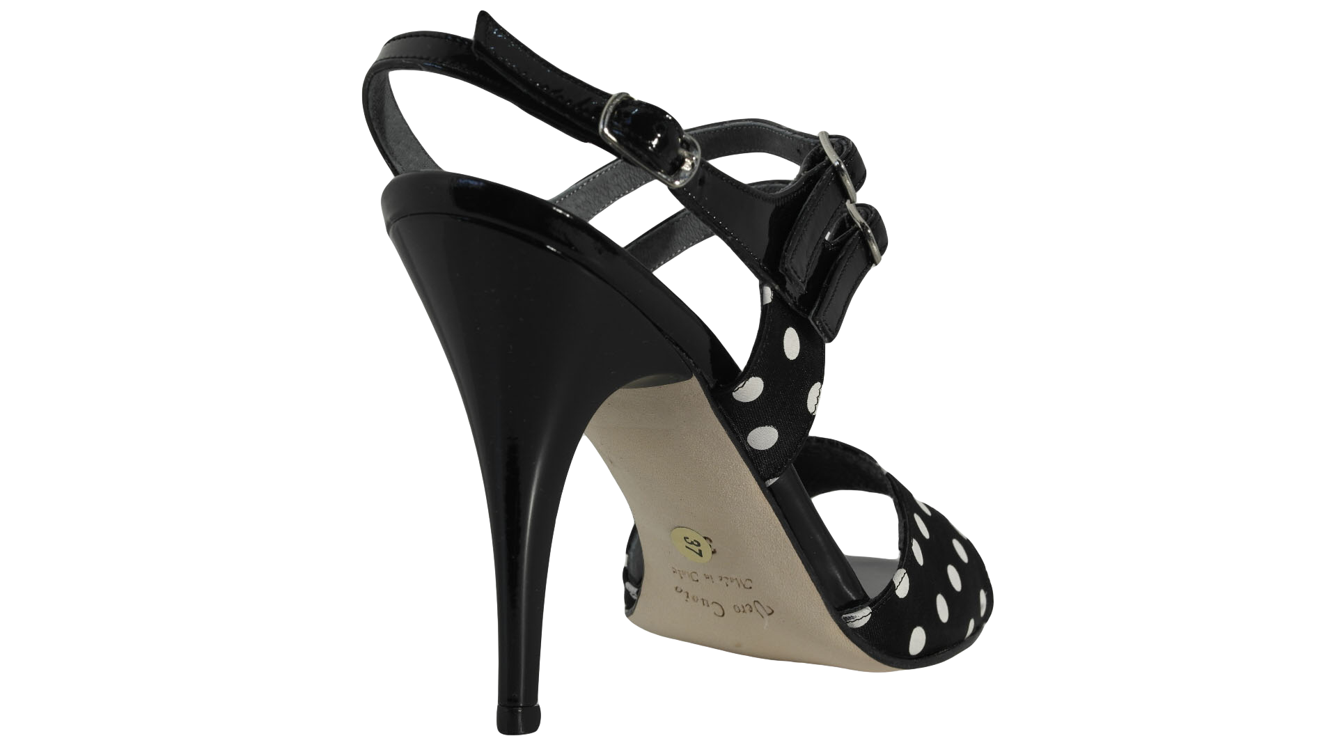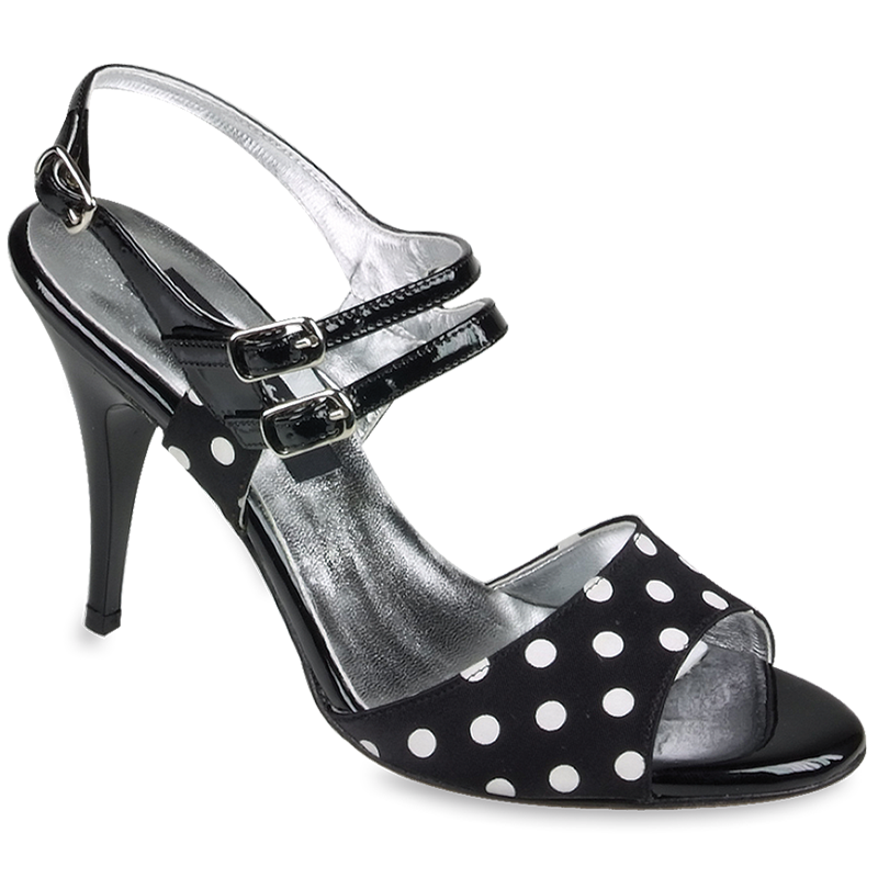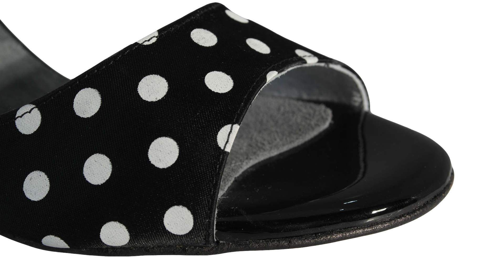 Modell 444 mit weißen Punkten auf schwarzem Satin, mit 95 mm lackiertem Acrylabsatz, offenporiger Ledersohle (outdoorfähig - also auch als Abendschuh nutzbar), höchste Bequemlichkeit durch gut abgeschäumte Lederinnensohle, 3-fach verstellbarer Verschlußriemen, Maximum an Balance durch ausgefeilte Statik, wie alle Modelle von Portena & Bailarina