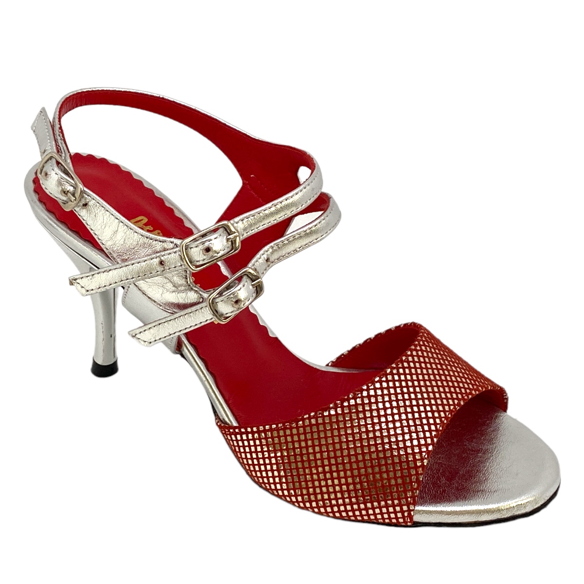Einzelpaar Nr. 36 vom Modell Maria Luisa - 444 in silber-rot, mit 80 mm silberr lackiertem Acrylabsatz, griffige Wildledersohle, höchste Bequemlichkeit durch gut abgeschäumte Lederinnensohle, 3-fach verstellbarer Verschlußriemen, Maximum an Balance durch ausgefeilte Statik, wie alle Modelle von Portena & Bailarina