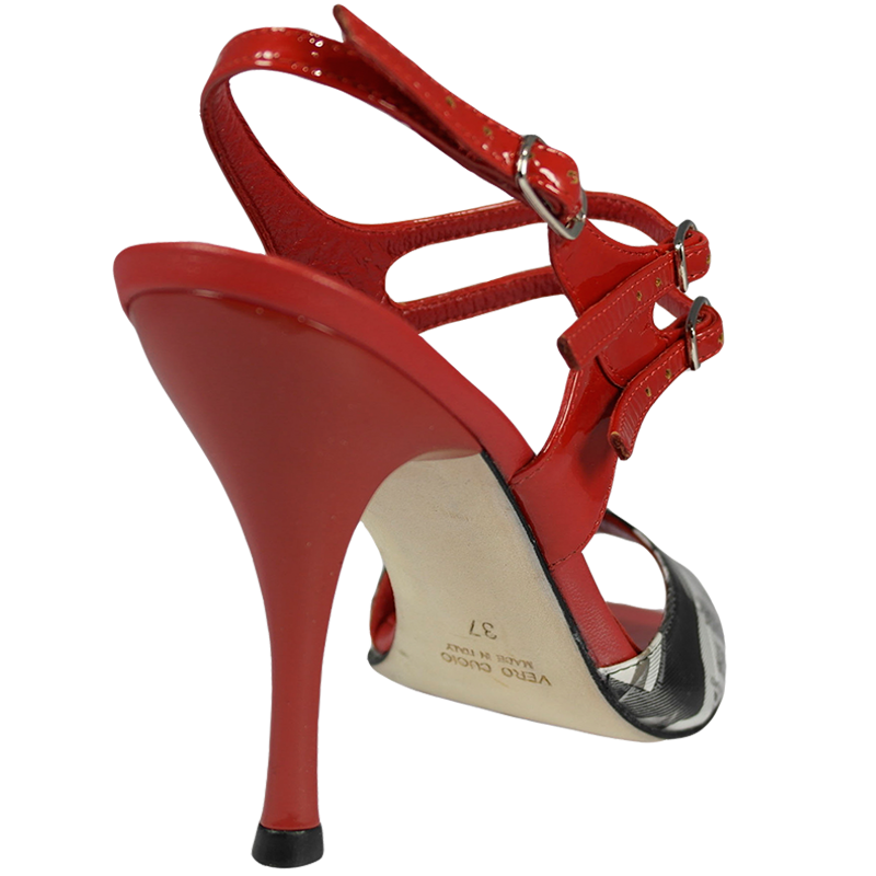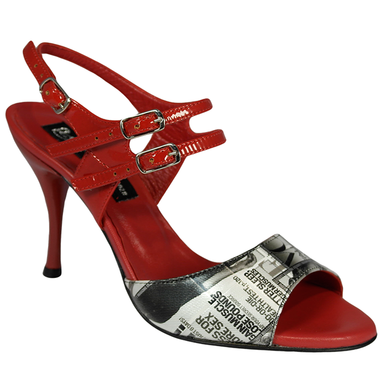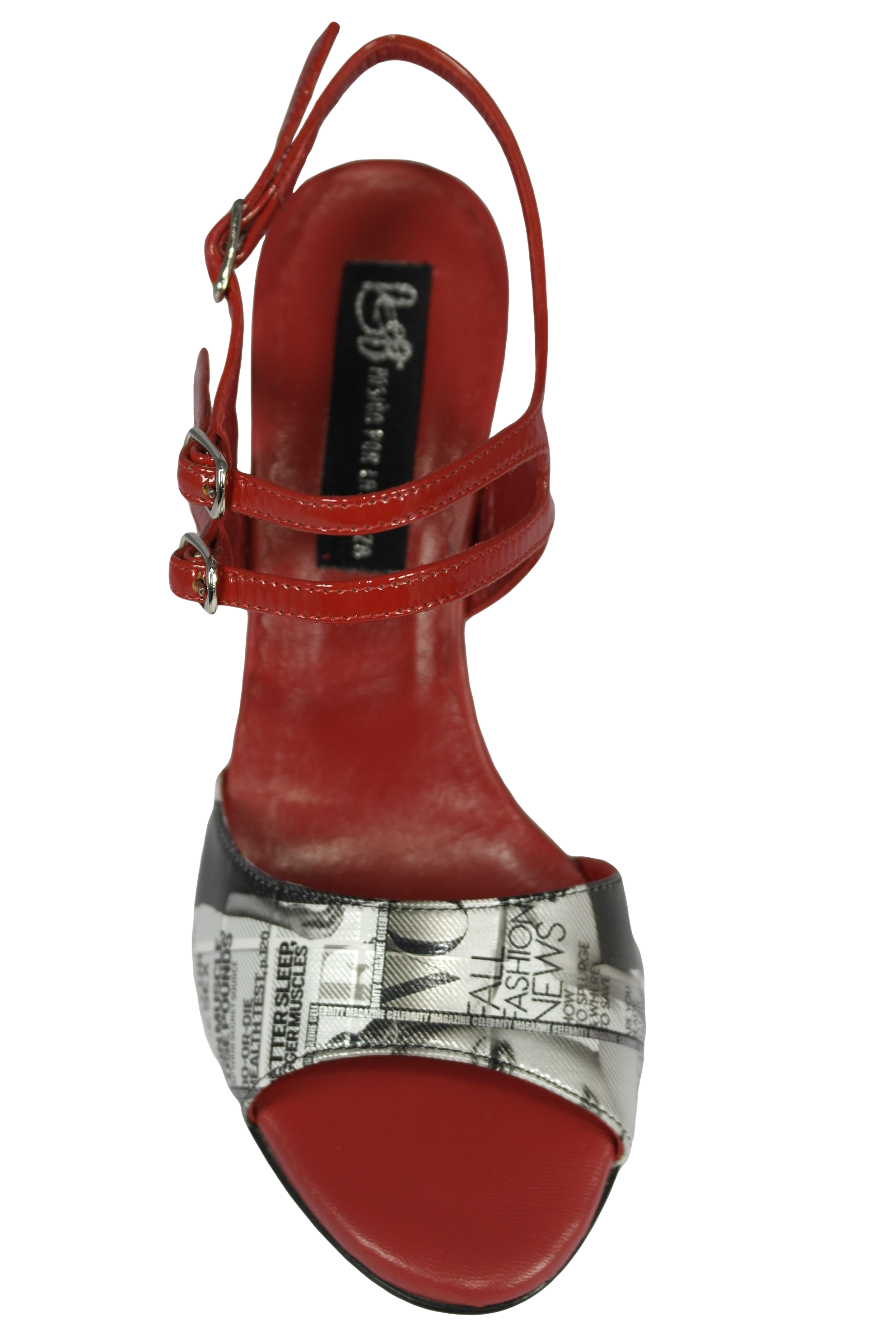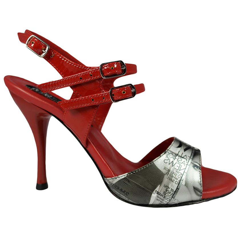 Ein weiterer Highlight der Kollektion Portena & Bailarina - Modell 444 mit 90 mm lackiertem Acrylabsatz -Ledersohle, hier im Material Magazin Slver in Kombination mit rotem Lackleder, Bequemlichkeit durch gut abgeschäumte Leder-Innensohle, 3-fach verstellbarer Verschlussriemen, Maximum an Balance durch ausgefeilte Statik, wie alle Modelle von Porteña & Bailarina