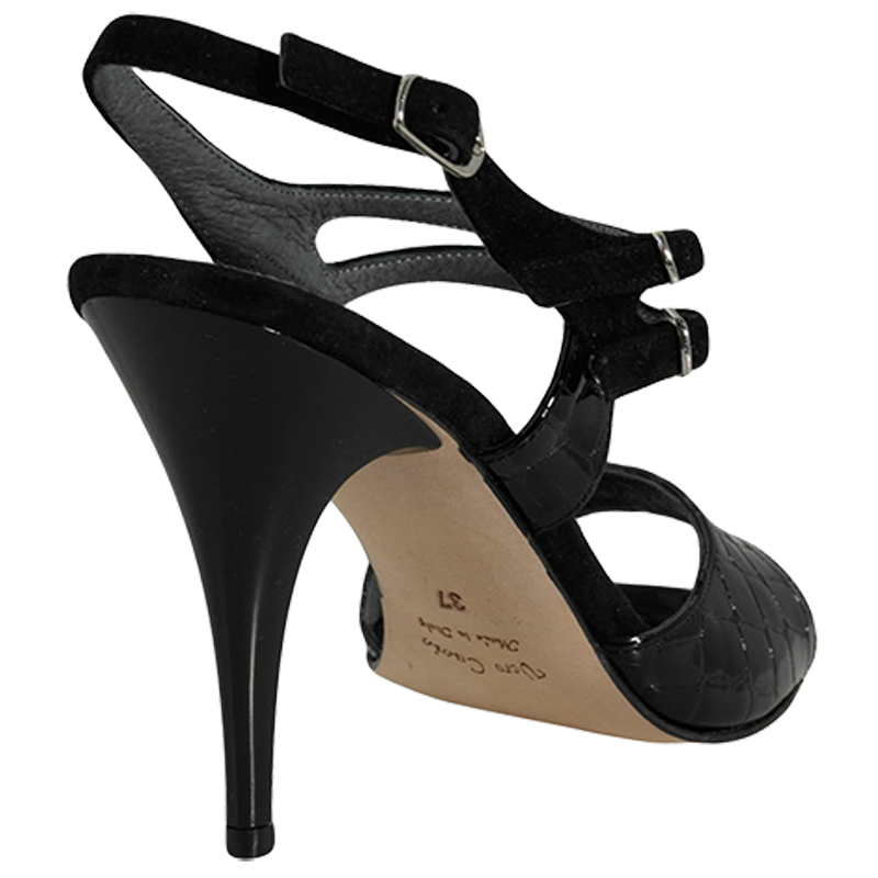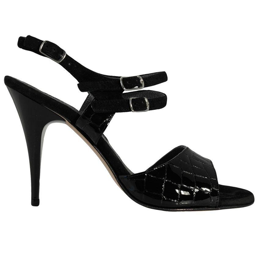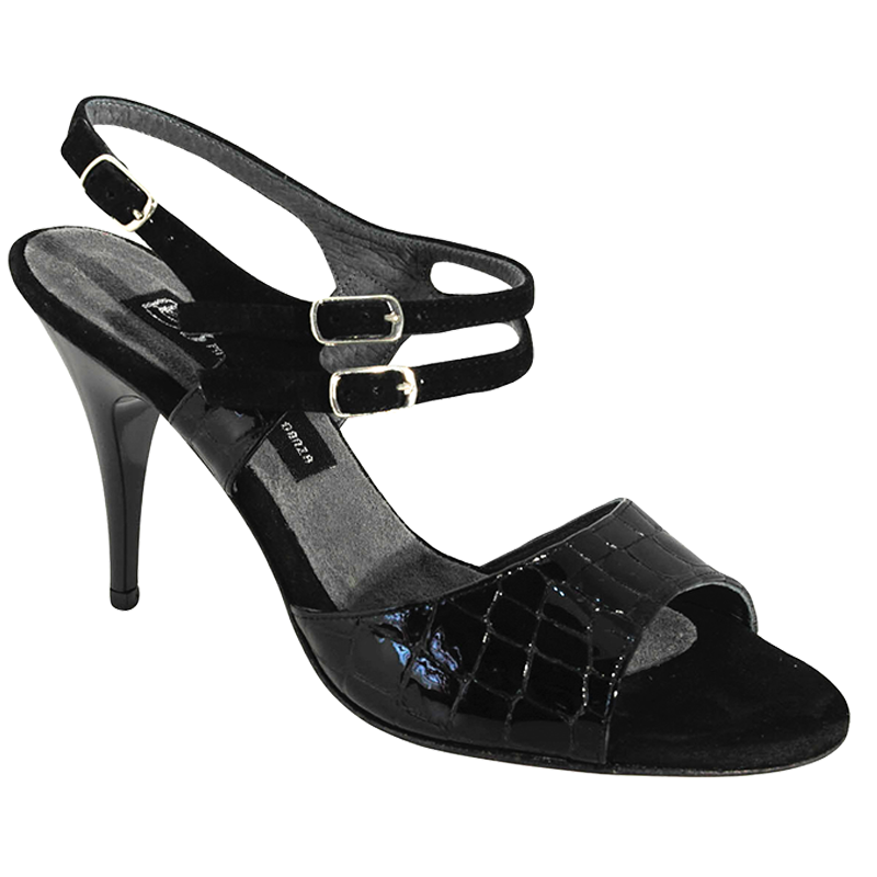 Modell 444 in schwarzem Lackleder mit Krokodilprint, 95 mm lackierter Acryl-Absatz, so wird Tangotanzen zum Genuß - höchste Bequemlichkeit durch gut abgeschäumte Leder-Innensohle, 3-fach verstellbarer Verschlussriemen, Maximum an Balance durch ausgefeilte Statik, wie alle Modelle von Portena & Bailarina - Sohle aus unbehandeltem Leder - daher auch outdoor-fähig, bzw. als Abendschuh zum kleinen Schwarzen zu nutzen..