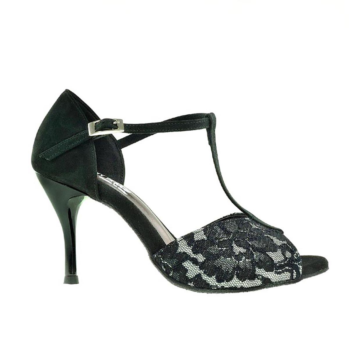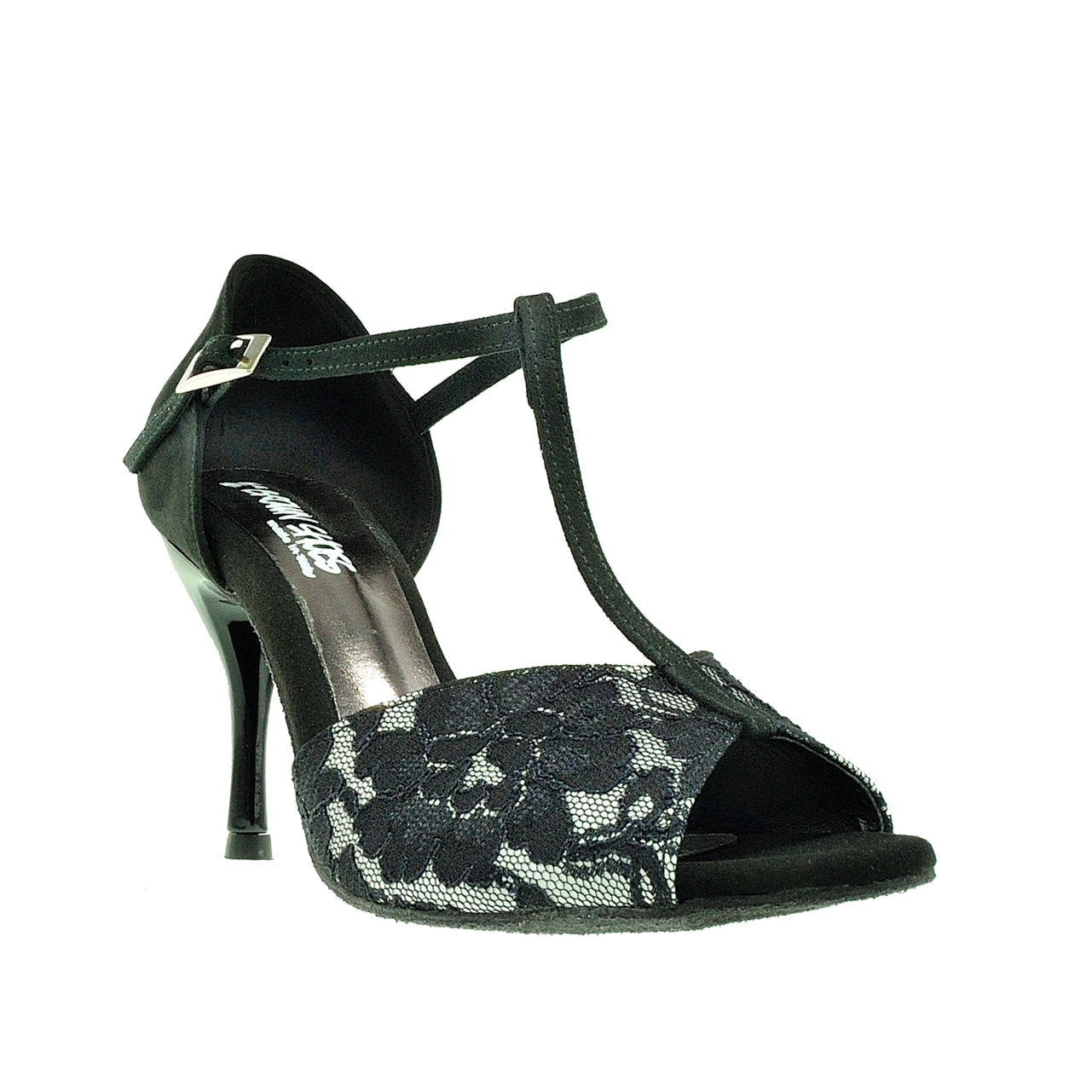 Go 2 tango mit diesem T-Bar mit Spitze auf Satin und  Mittelsteg vorn und schwarzer Mikrofaser mit 85 mm Absatz Stiletto hinten,  schwarz lackiert - filigran und elegant