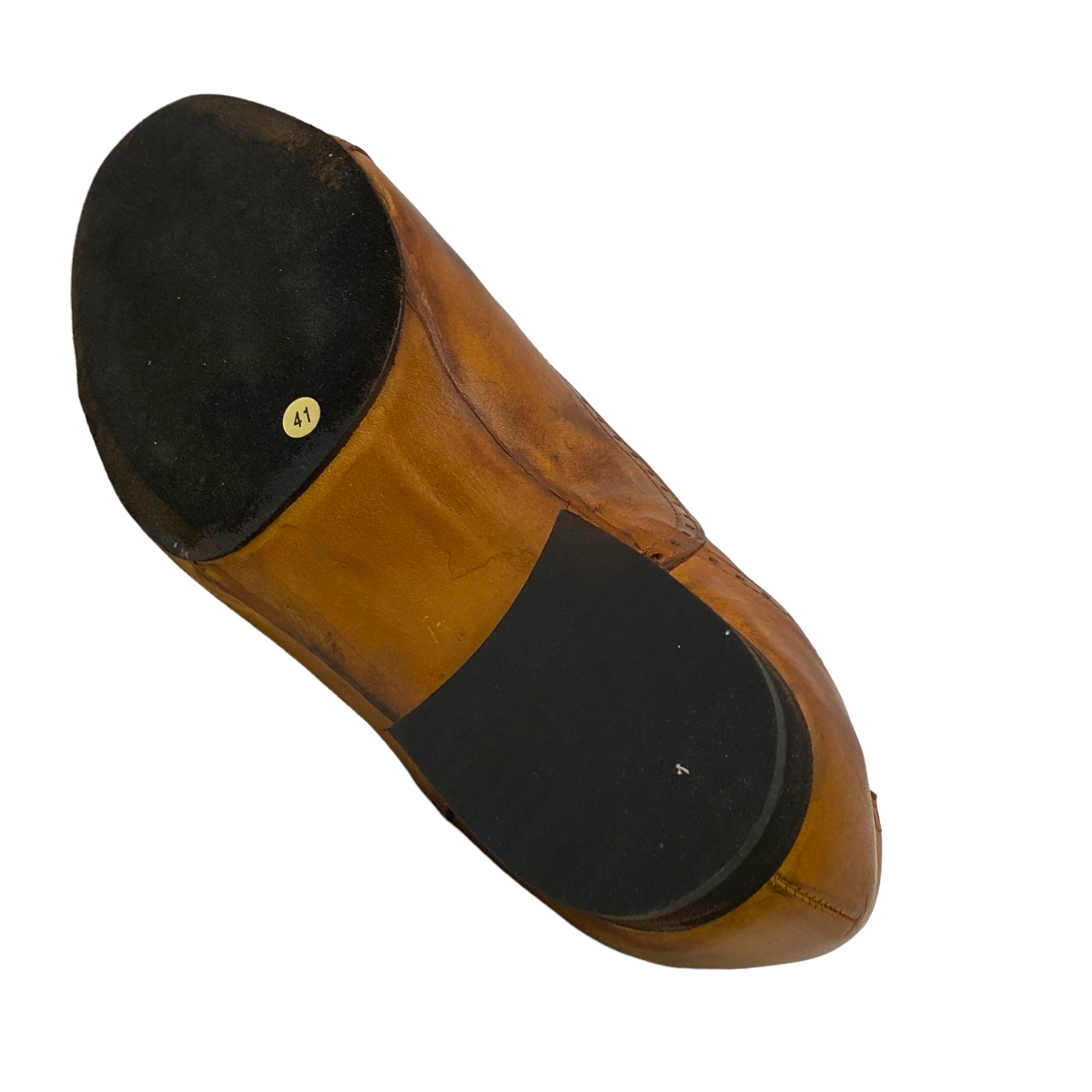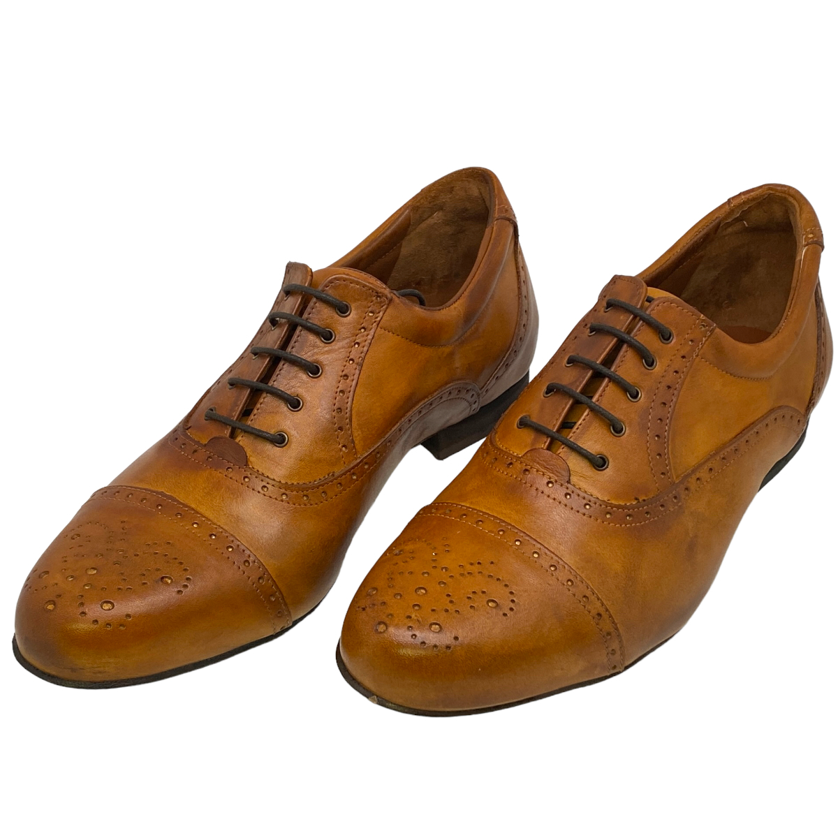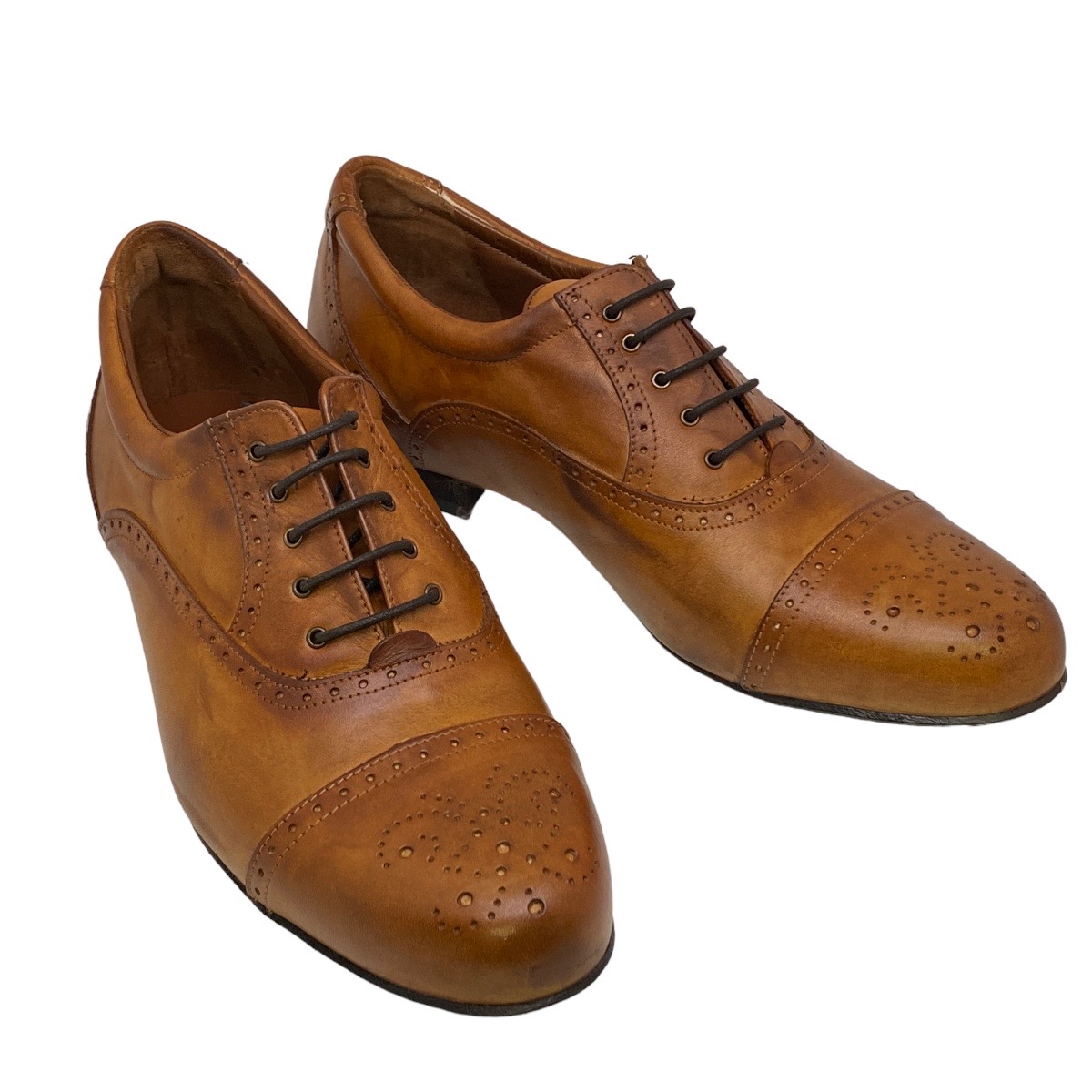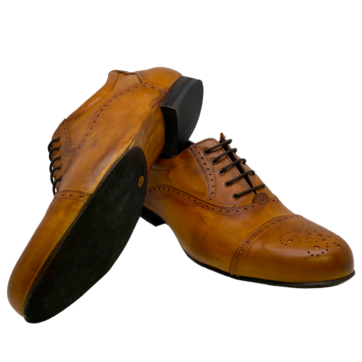 Extravaganter Herren Tanzschuh in Kalbsleder der mit einem besonderen Finish in Bürstentechnik daherkommt. Dies gibt dem cognacfarbenem Leder den etwas struktrurmäßigen Look. Super Edel mit geteilter Sohle aus Wildleder - perfekt für die Tanzschule, Tango Argentino oder Salsa / Kizomba für alle, die das simple "schwarz" langweilt ..  Italienische Handarbeit, giftfrei und aus sauberen Rohstoffen aus europäischer Fertigung gemacht.
