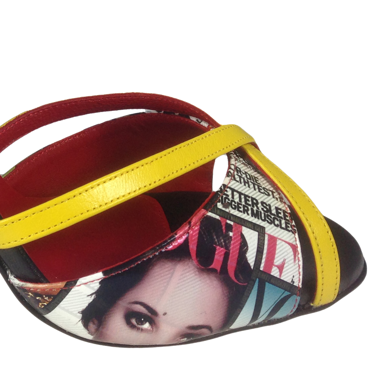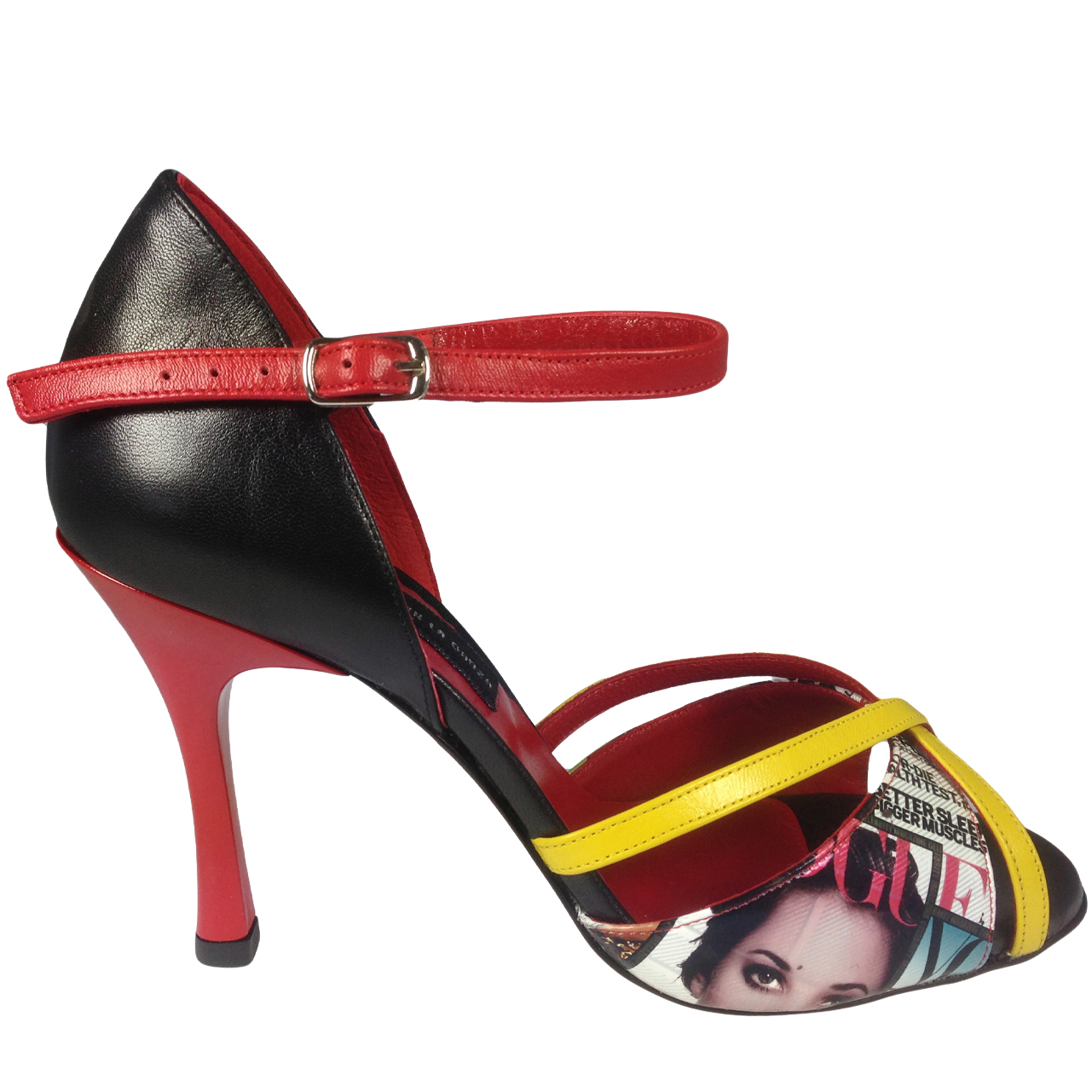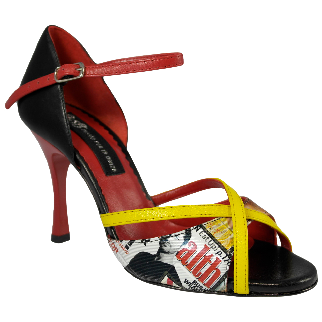 Modell 684 - eine schmale Tangosandale mit einem breiten Frontriemen über den 2 diagonale Riemchen zusätzlichen Halt bieten - das interessante Material Magazino (Zeitungsausschnitte) ist kombiniert mit rot, schwarz und gelb oder mit rosa und weiß. Ein Hingucker für schmale Füße. Der 90 mm Absatz ist unten leicht ausgestellt und bietet sicheren Halt in Kombination mit der unbehandelten Ledersohle. Wie alle Porteño & Bailarina Modelle ist er schön abgepolstert und hat eine perfekte Statik.
