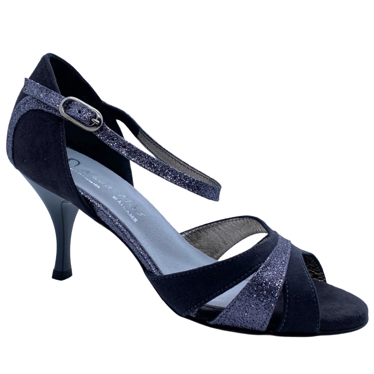 Nada Mas - Tangoschuhe aus italienischer Handarbeit - das Maximum an Qualität bietet die höchstmögliche Polsterung mit weichem Velourslederinlay sowie einer unter der Sohle integrierten Rutschbremse - samtig weiche, atmungsaktive und flexible Ledersohle (outdoorfähig) mit 70 mm Absatz, ton-in-ton stoßfest lackiert - hier eine elegante Kombination die farblich zu vielen Kleidern passt in anthrazit Glitzer und weichem Veloursleder Soft - eingearbeitetes Ballenpolster, die Sohle ist höchstmöglich geschäumt und lässt Dich wie auf Wolken durch die Milonga schweben