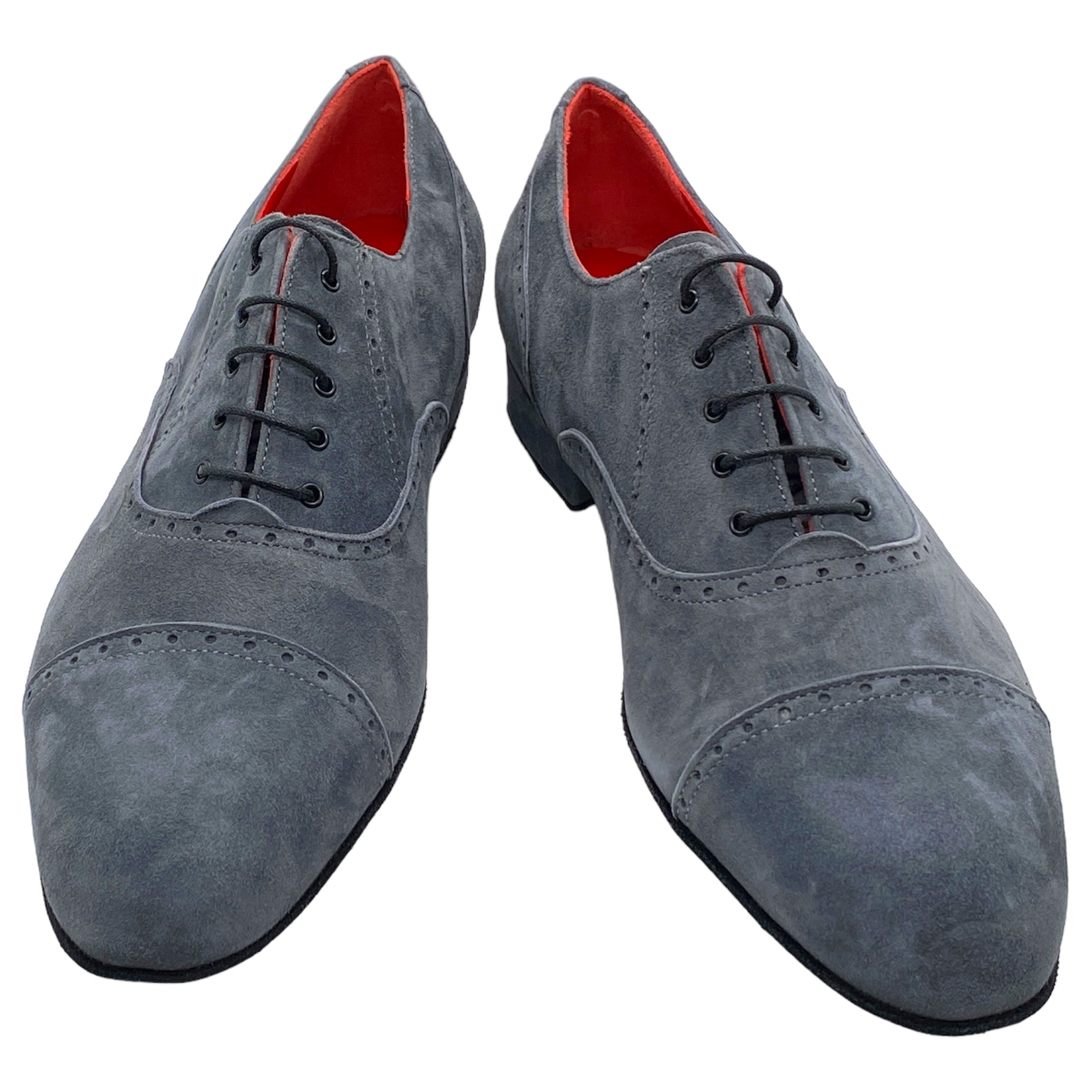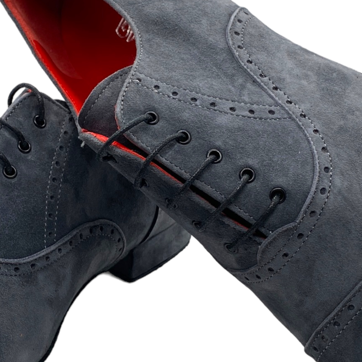 Eleganter Herren Tanzschuh aus pflanzengefärbtem, weichem Wildleder in graphit mit 20 cm Absatz und Wildledersohle für Parkett und andere Tanzböden. Handgearbeitete italienische Wertarbeit aus einem kleinen Familienbetrieb kaufst Du mit der Marke Porteno & Bailarina, Pasión Por La Danza - mit Liebe gefertigt. Die besondere Note ist das rote Innenfutter aus Leder wie bei den meisten P&B Schuhen, die Sohle griffig und weich,