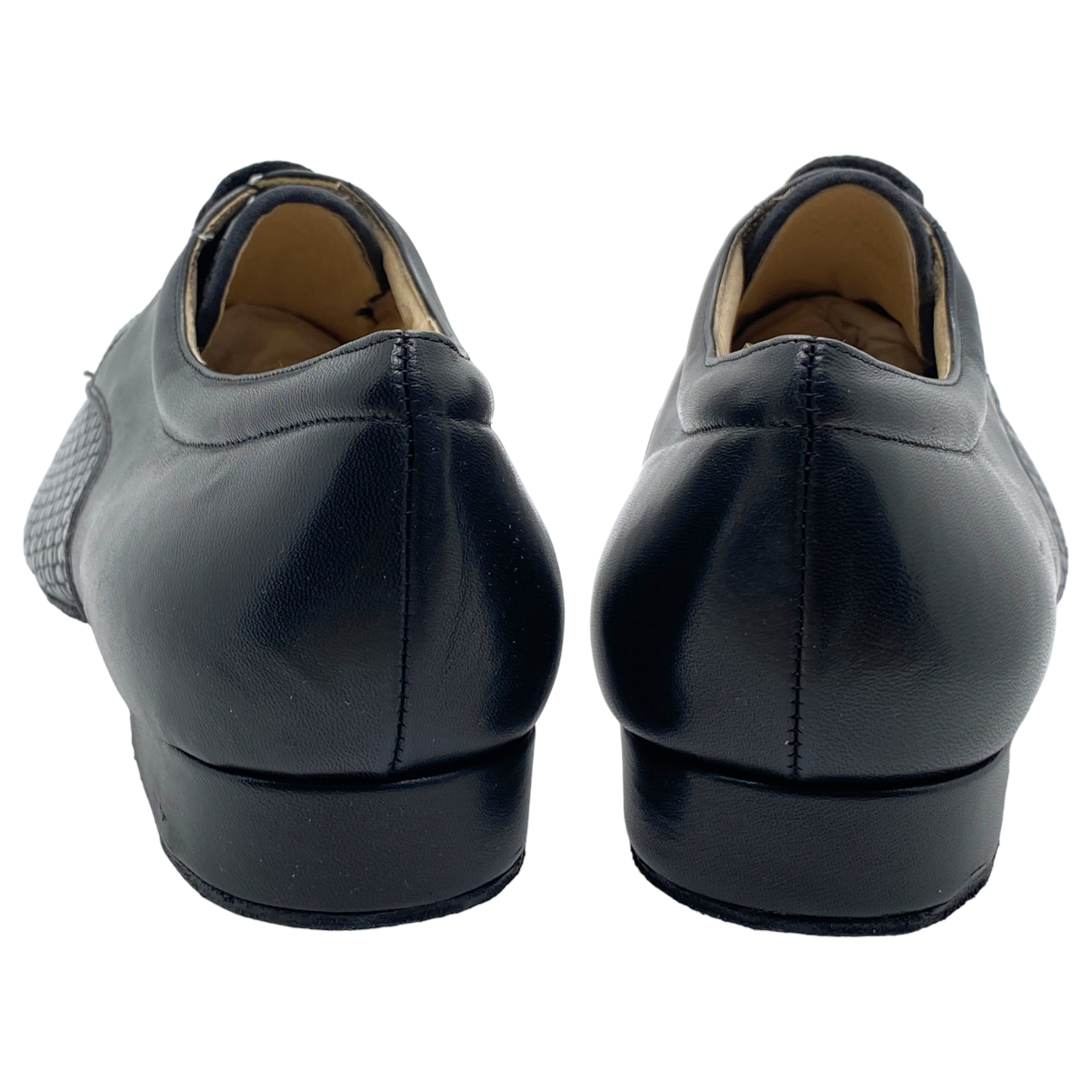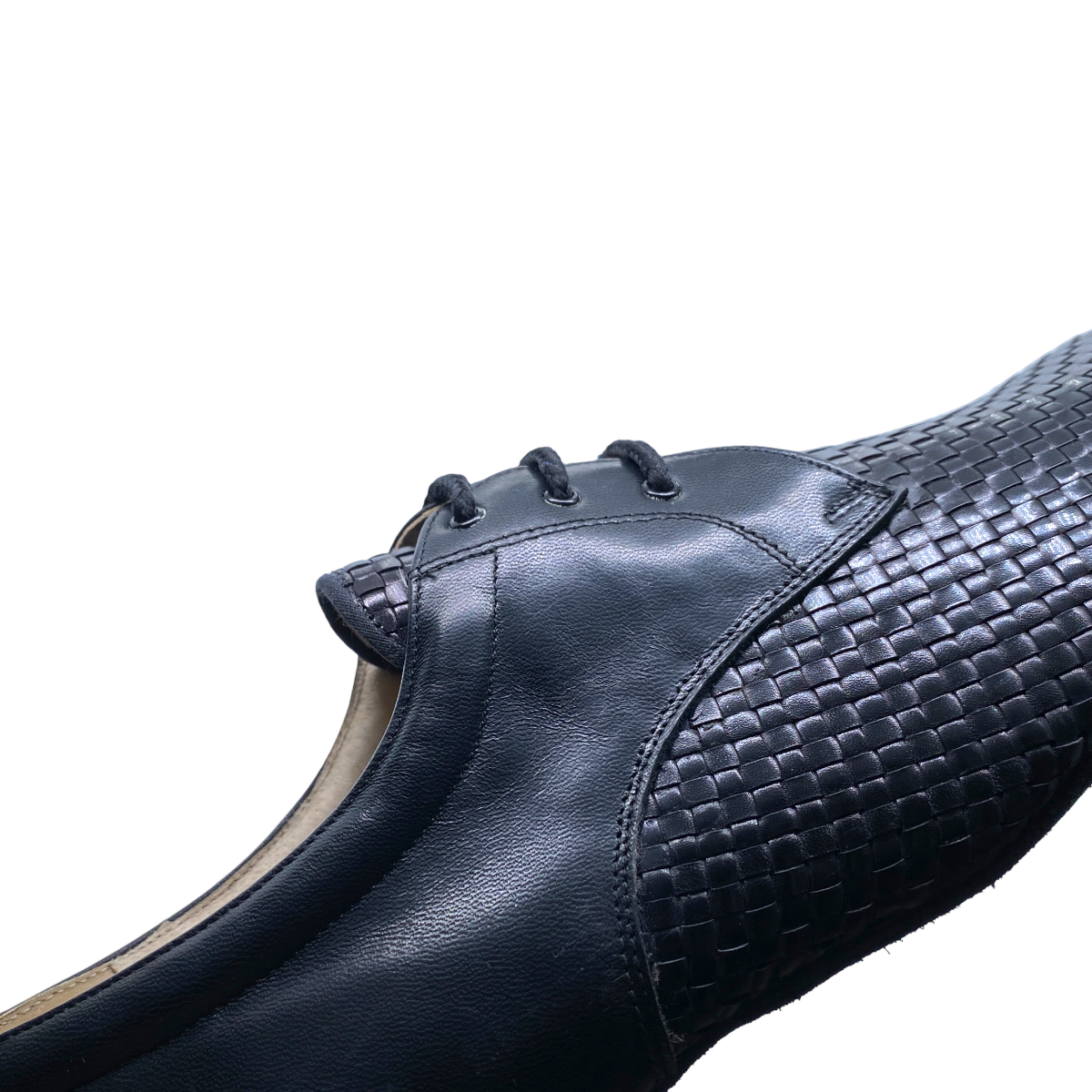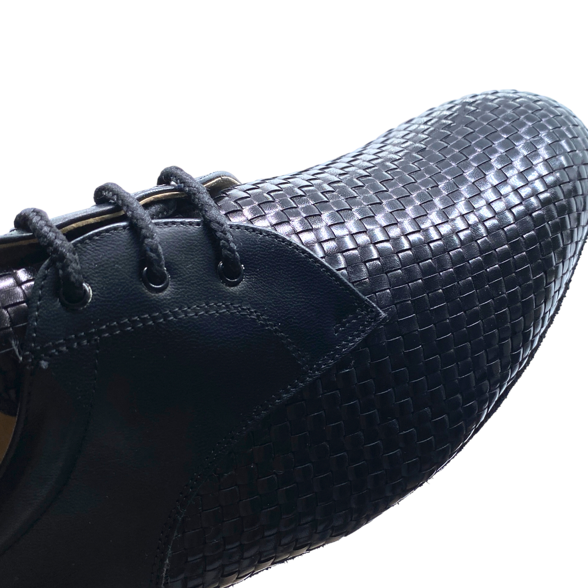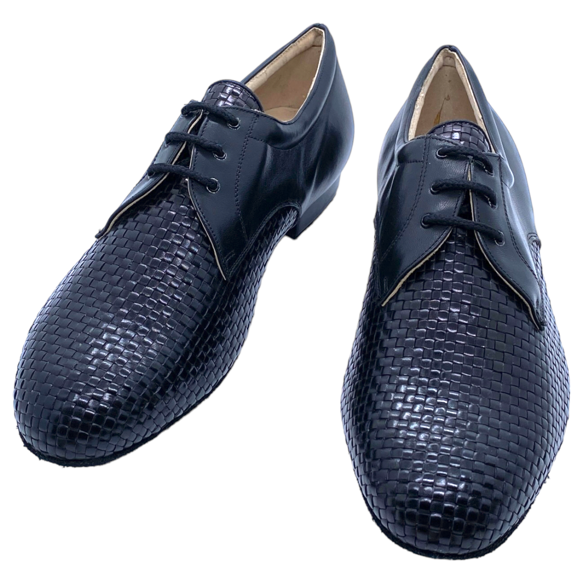 Eleganter Herren Tanzschuh aus schwarzem Kalbsnappa Flechtleder vorn und glattem Kalbsnappleder hinten, 20 mm Absatz, lederüberzogen, 6-Loch offene Derby Schnürung - also auch für hohen Spann geeignet. Der Abschluss am Knöchel ist leicht abgepolstert für hohen Tragekomfort. Tanzsohle aus Wildleder.