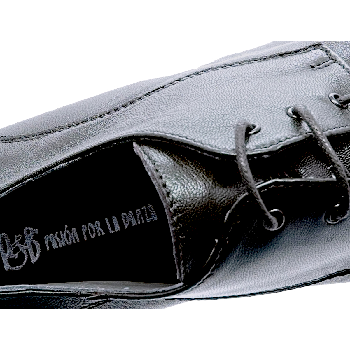 Damenführungsschuh SB35 Stellina in schwarzem Nappa-Leder, - ein klassischer Herrenschuh, gemacht auf einem Damenleisten nur für Frauen mit einem stossfedernden MCR Absatz 35 mm und griffiger Wildledersohle. Alle Materialien pflanzengefärbt und giftfrei. Es gibt so viele Frauen die beim Tanzen führen, und keine Heels gebrauchen können. Auf Herrrenmodelle in kleinen Größen ausgewichen, ergibt sich das Problem, dass die Leisten zu breit geschnitten sind. Daher hat Porteño & Bailarina einen Damen Führungsschuh herausgebracht. Ein maskuliner Schnitt auf einem Leisten für Damenanatomie gearbeitet.