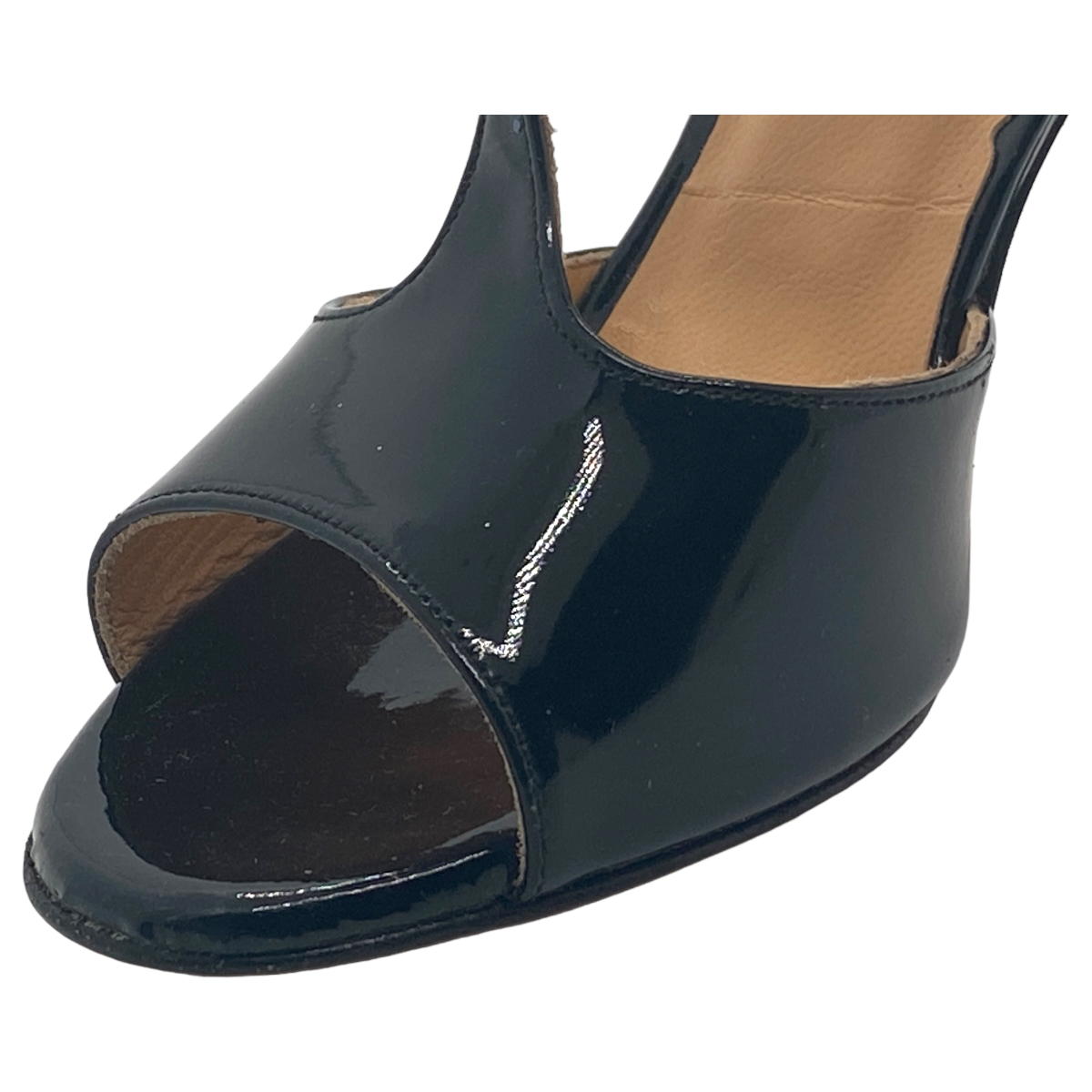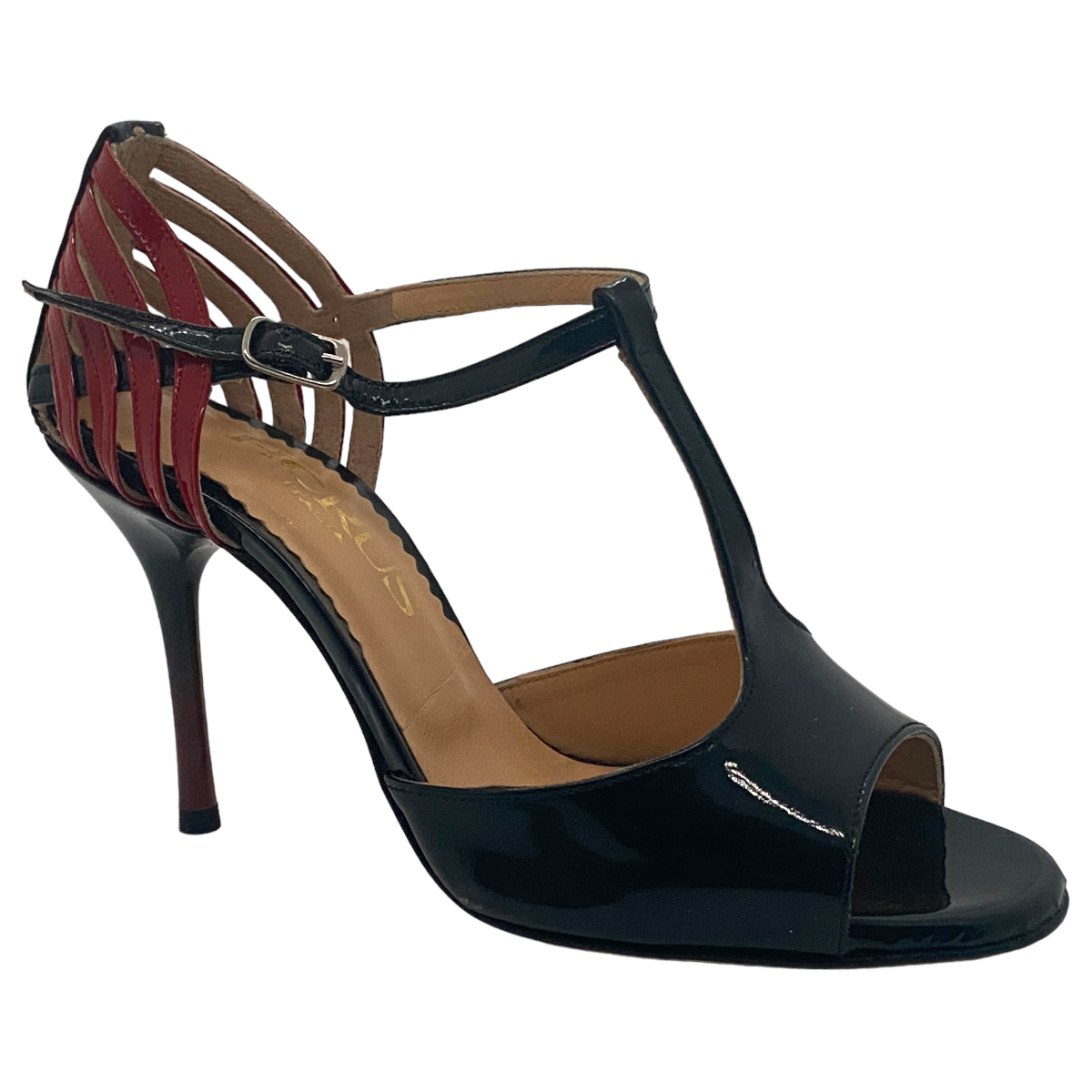 Elegante, eher schmale Lacksandale mit dünnem 95mm Stiletto mit Farbverlauf (schwarz-in-rot) in schwarz-roter Lackleder Kombination, Ledersohle offenporig (auch outdoor funktionell) samtig und griffig auch auf glatten Böden aber auch auf Deiner Außenmilonga funktionell. Interessanter Fersenbereich mit Outcuts - italienische Handarbeit
