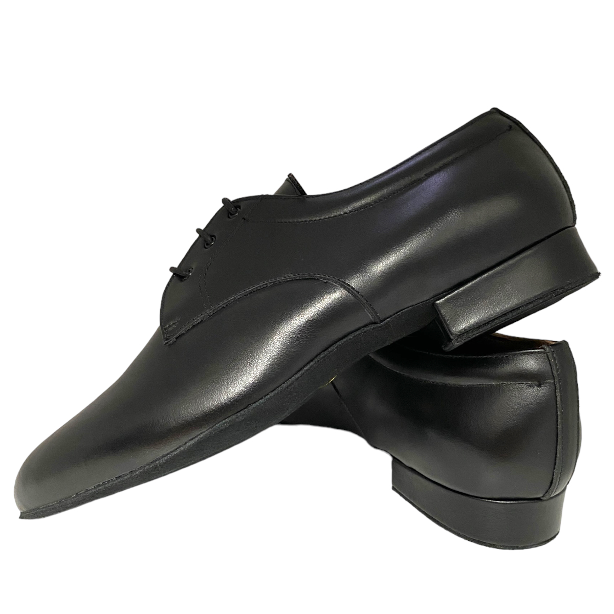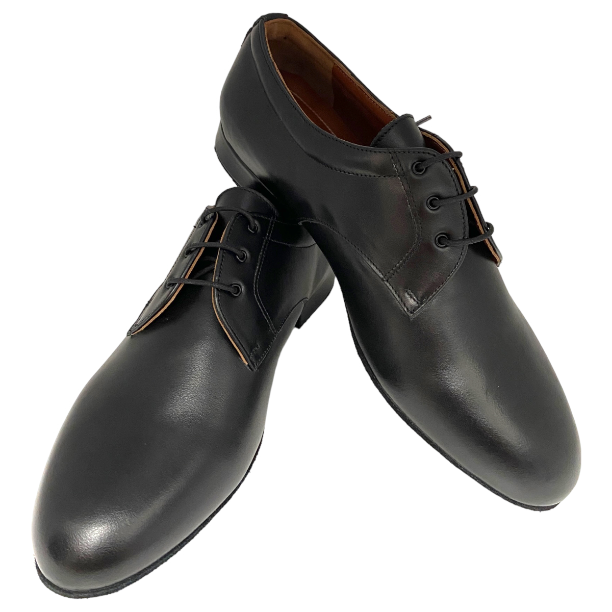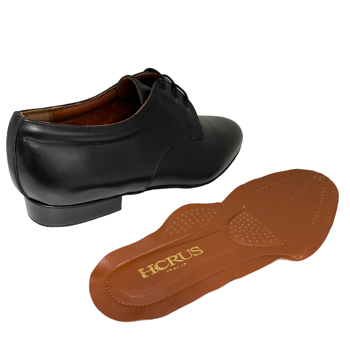 Der Herrenschuh 132 aus dem Hause Horus Italia aus schwarzem Leder mit Velourledersohle, 2cm Absatz, 3-Loch-Schnürung und Schaftpolster - ab Mitte 2024 mit Lederfussbett zum rausnehmen - perfekt wenn Du Deine Einlagen darin tragen möchtest oder Deine Füsse bei langen Tanznächten mal etwas dicker werden - unter dem Fußbett findest Du natürlich auch eine Lederdecksohle !!