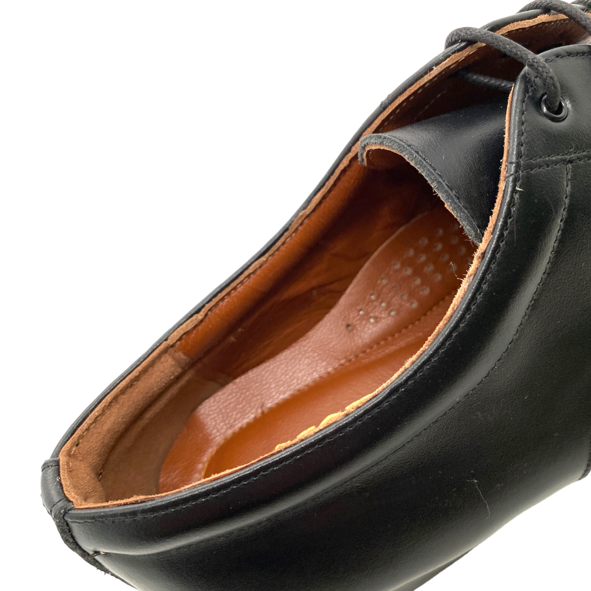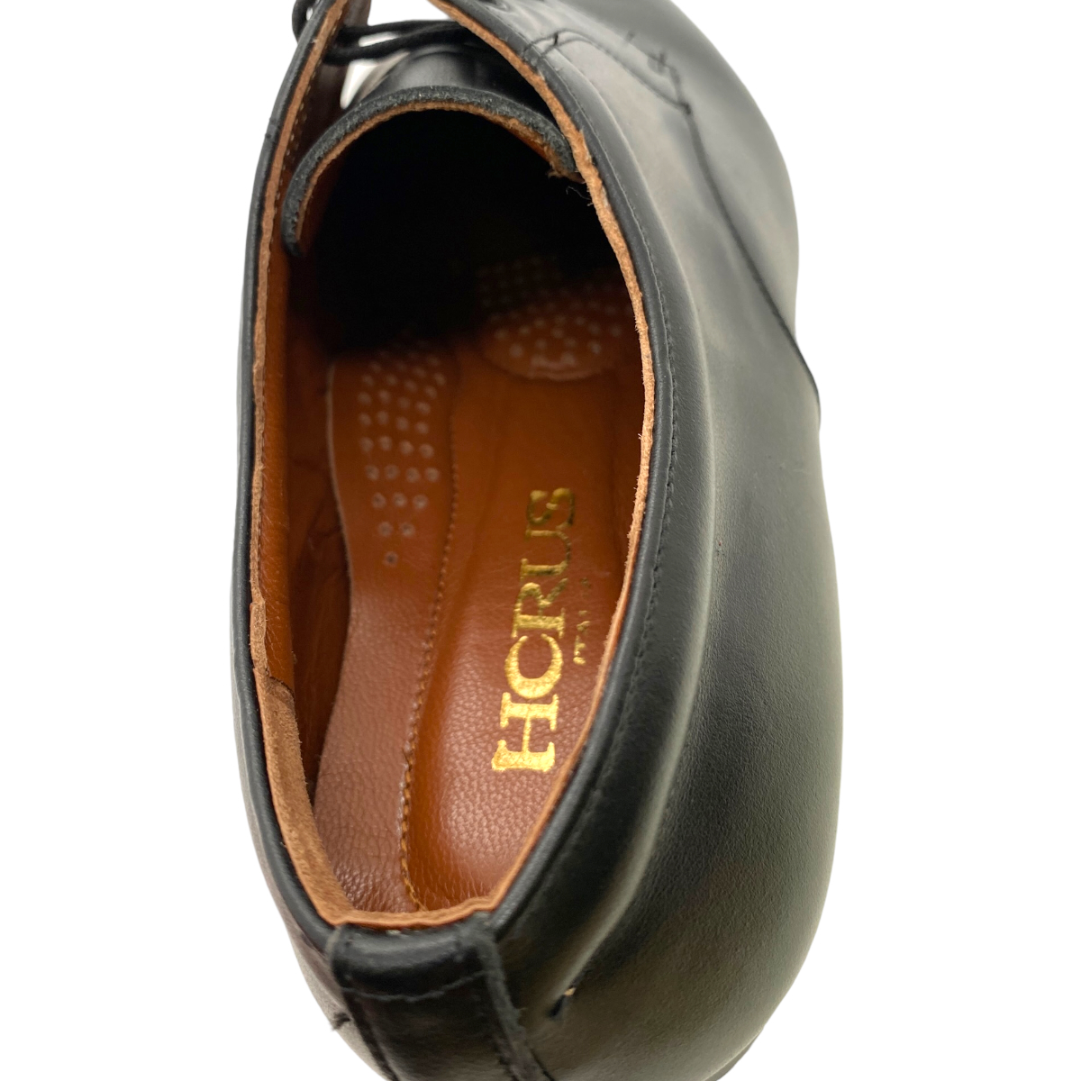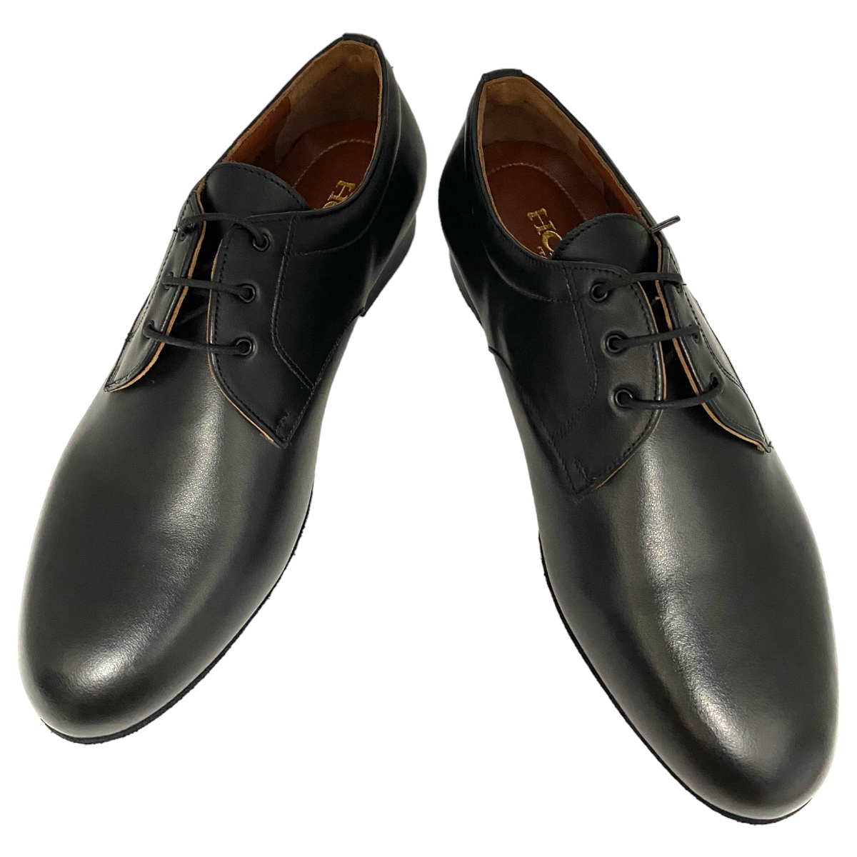 Der Herrenschuh 132 aus dem Hause Horus Italia aus schwarzem Leder mit Velourledersohle, 2cm Absatz, 3-Loch-Schnürung und Schaftpolster - ab Mitte 2024 mit Lederfussbett zum rausnehmen - perfekt wenn Du Deine Einlagen darin tragen möchtest oder Deine Füsse bei langen Tanznächten mal etwas dicker werden - unter dem Fußbett findest Du natürlich auch eine Lederdecksohle !!
