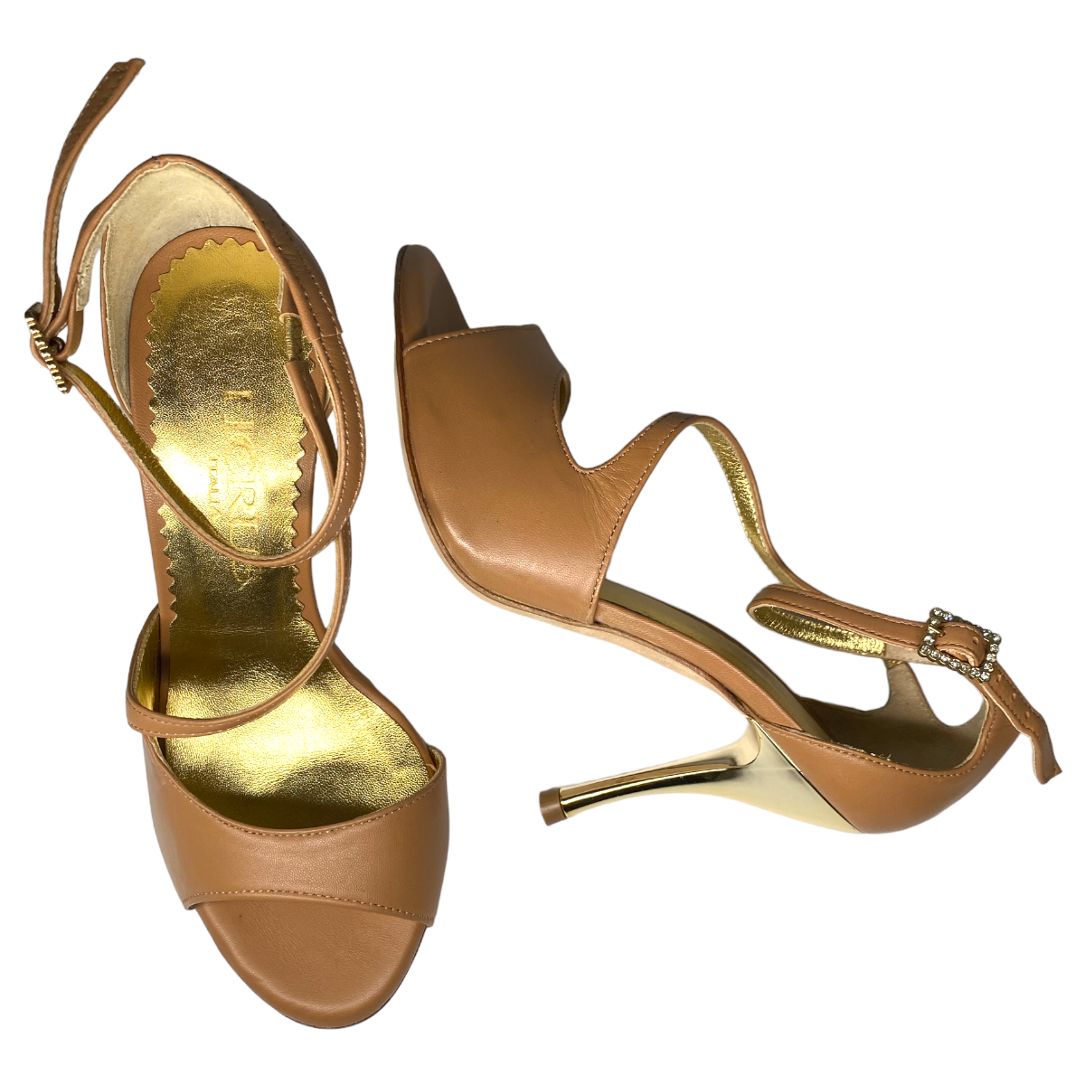 Ausgefallener Tangoschuh aus italienischer Handarbeit von Horus, Italia in nude Nappa. 90 mm Absatz, gold lackiert und griffige unlackierte Ledersohle, Innensohle aus gold Leder, gut abgepolstert, gute Statik für lange Tangonächte. Der Schnitt vorn ist asymetrisch, aussen geschlossen rutschen keine kleinen Zehen heraus und innen schön offen für gute Bewegungsfreiheit - Einzelpaar in 36 - es passt für eine Strassenschuhgrösse 37 perfekt und ist nicht megaschmal geschnitten aber für sehr breite Füße oder Füße mit Hallux weniger geeignet..  dieses Modell kommt erst im Herbst wieder.