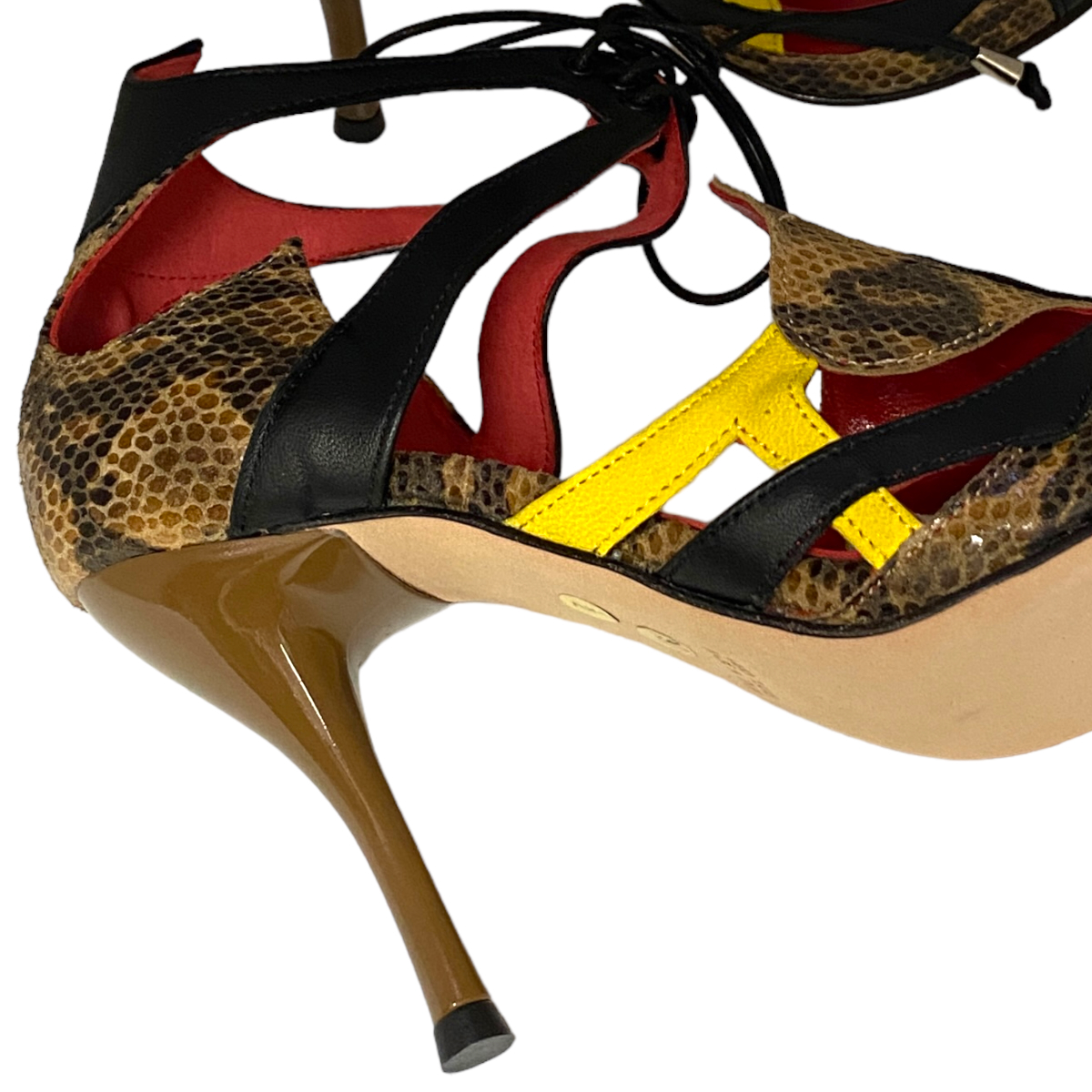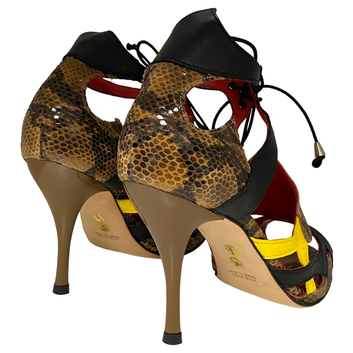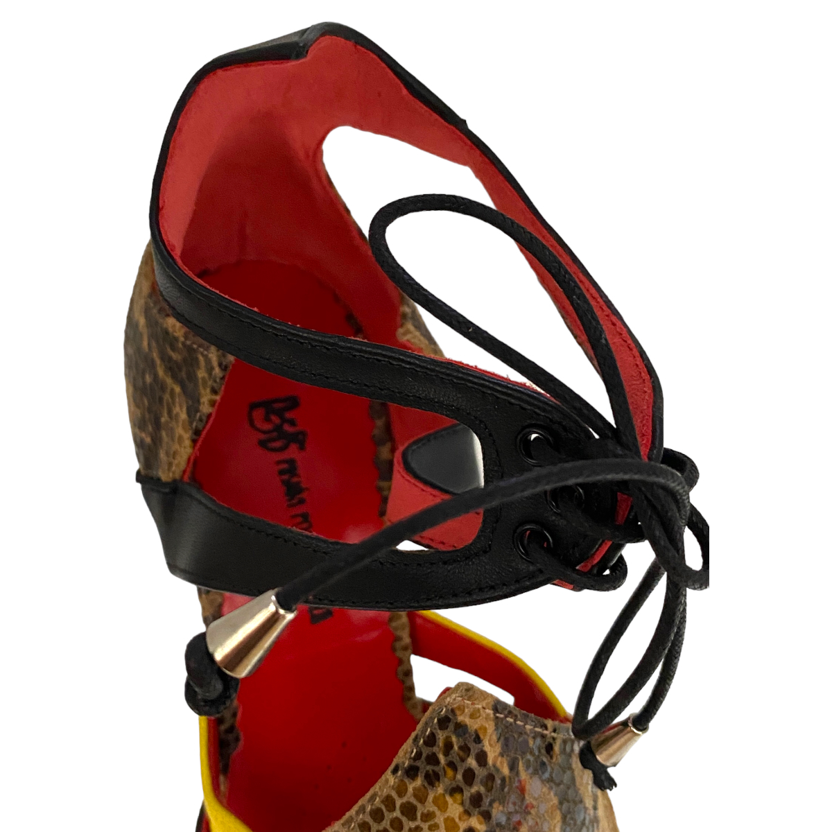 Porteño & Bailarina (Pasión Por La Danza) Modell 932 - Paquita - hier in braun/beige Tönen in Kombination mit gelbem Nappaleder ist Haut Couture unter den Tanzschuhen. Ein extravagantes Modell mit guter Abschäumung zwischen Deck- und Tanzsohle (griffiges Wildleder) und farblich passend lackiertem, stoß-resistentem Absatz 90 mm. Es besticht durch seinen ausgefallenen Schnitt mit vielen Details
