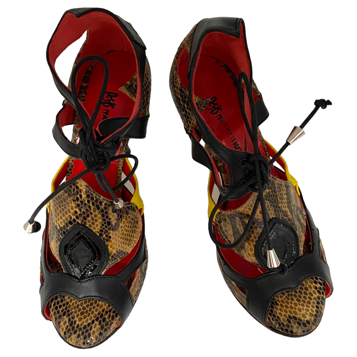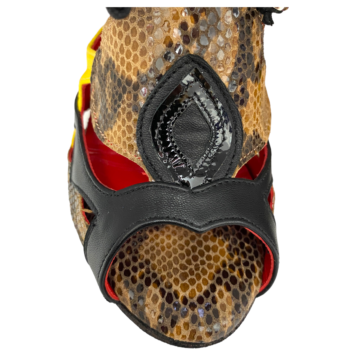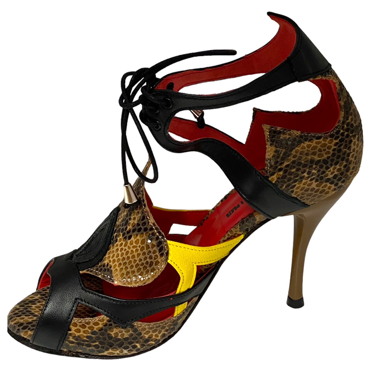 Porteño & Bailarina (Pasión Por La Danza) Modell 932 - Paquita - hier in braun/beige Tönen in Kombination mit gelbem Nappaleder ist Haut Couture unter den Tanzschuhen. Ein extravagantes Modell mit guter Abschäumung zwischen Deck- und Tanzsohle (griffiges Wildleder) und farblich passend lackiertem, stoß-resistentem Absatz 90 mm. Es besticht durch seinen ausgefallenen Schnitt mit vielen Details