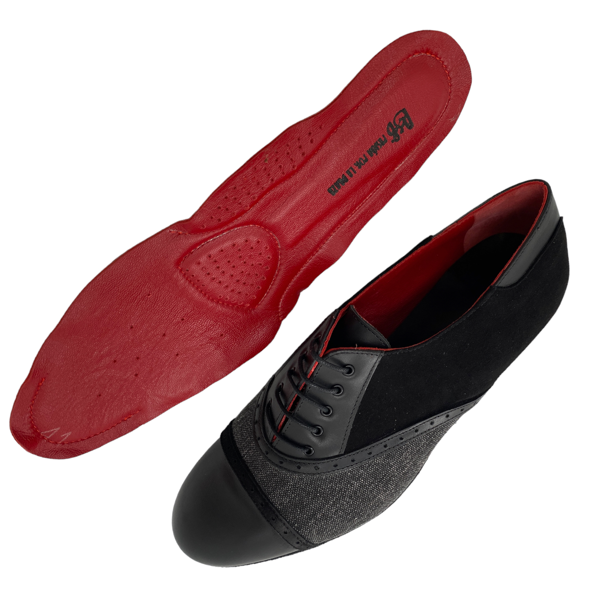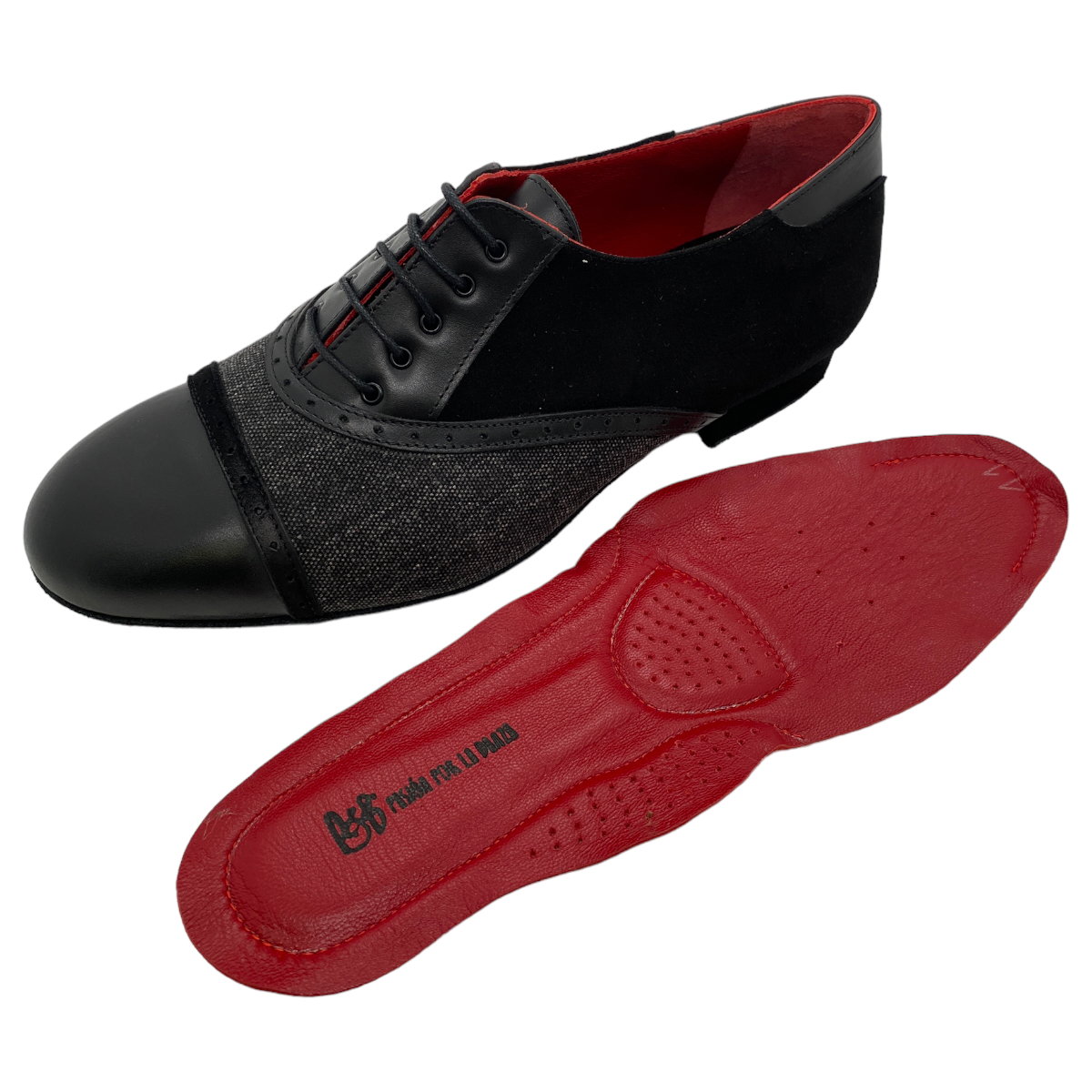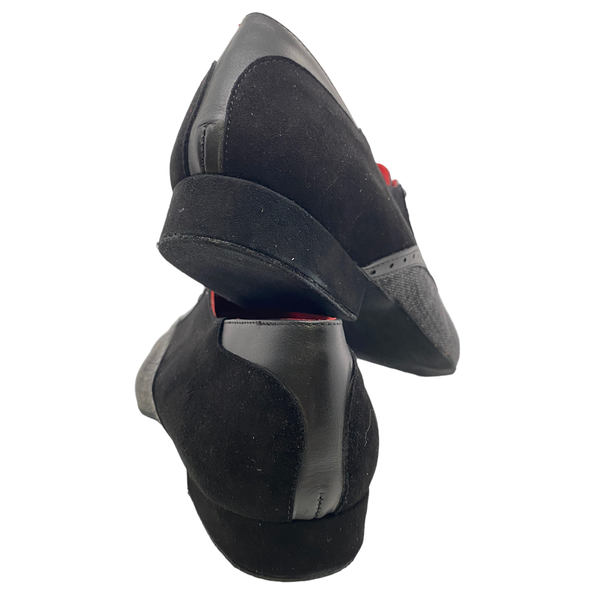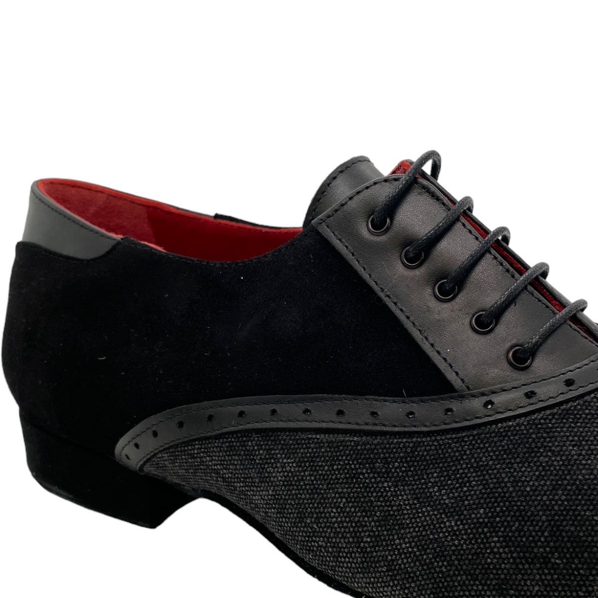 Jung - frech und elegant - die Linie 15112 aus italienischer Handarbeit - ausgefallene Materialien, pflanzengefärbte Leder, witzige Farbkombinationen - weiche flexible Wildledersohle mit flachem 2 cm Absatz - hier in einer Kombination schwarz Kalbsleder mit schwarzem Jeans - eine tolle Variante egal für Salsa, Tango Argentino oder die Tanzschule