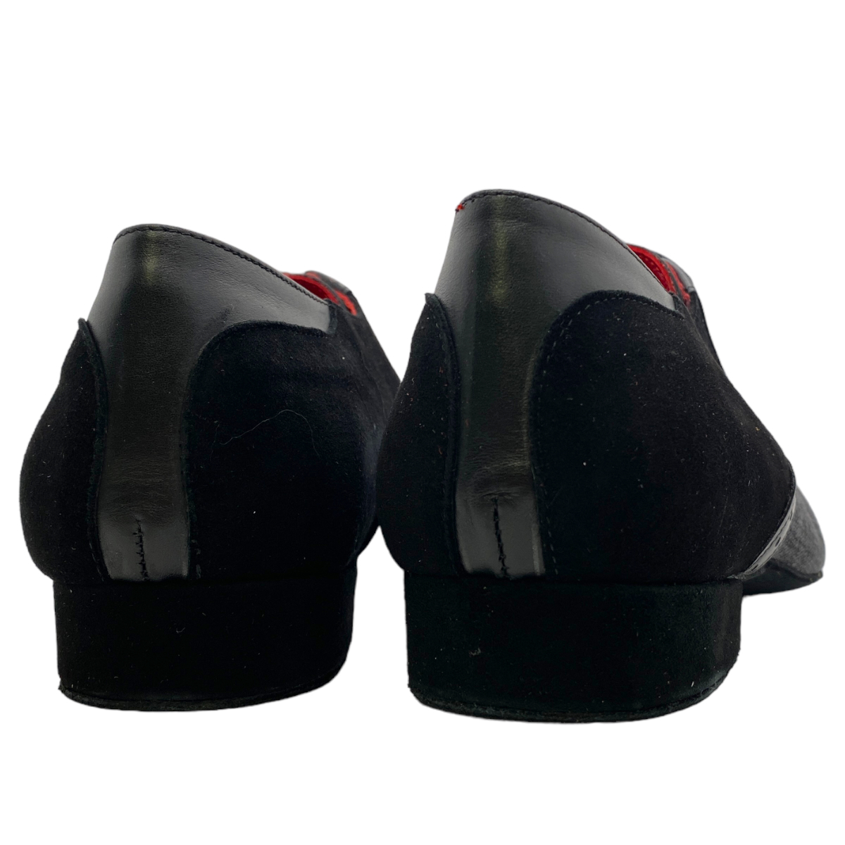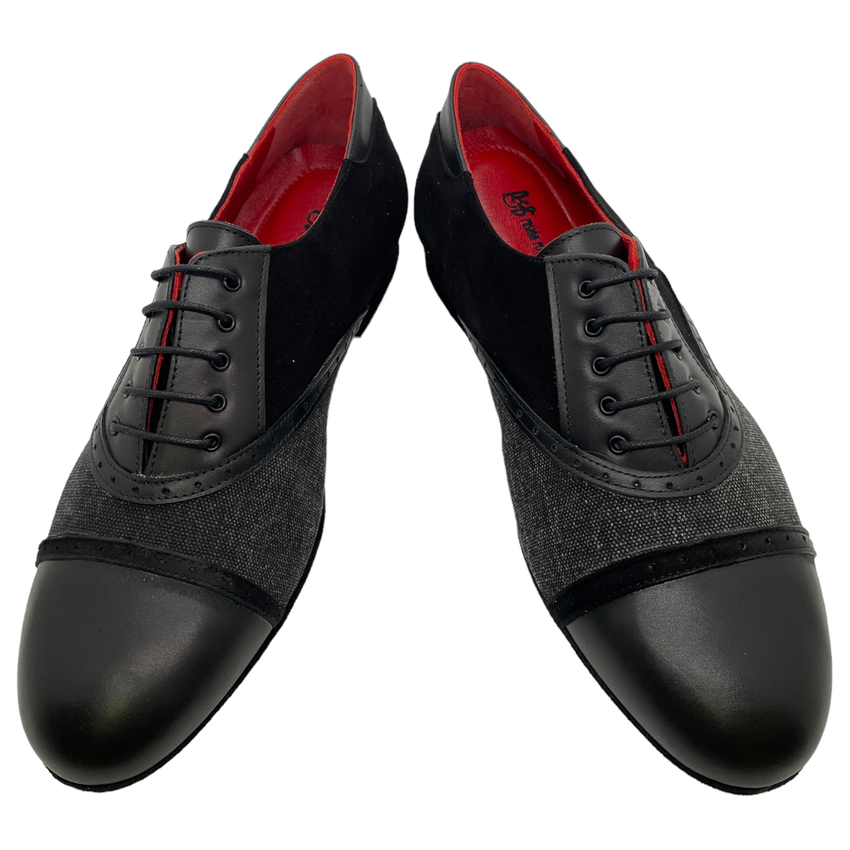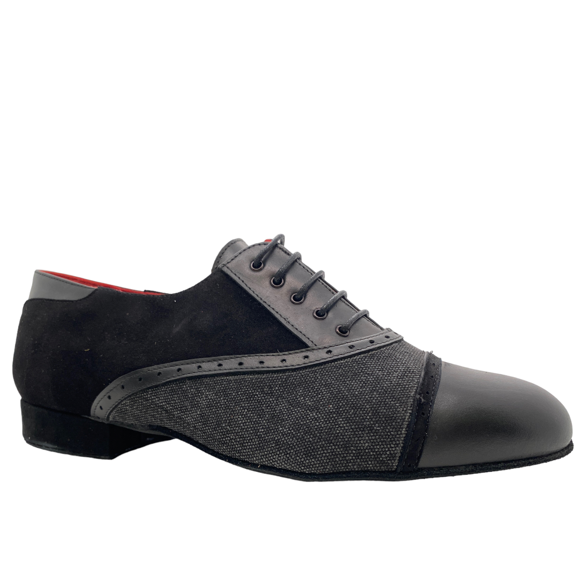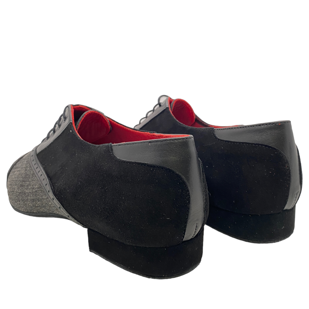 Jung - frech und elegant - die Linie 15112 aus italienischer Handarbeit - ausgefallene Materialien, pflanzengefärbte Leder, witzige Farbkombinationen - weiche flexible Wildledersohle mit flachem 2 cm Absatz - hier in einer Kombination schwarz Kalbsleder mit schwarzem Jeans - eine tolle Variante egal für Salsa, Tango Argentino oder die Tanzschule