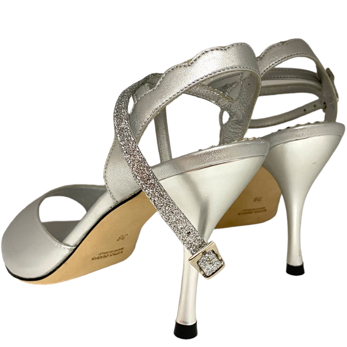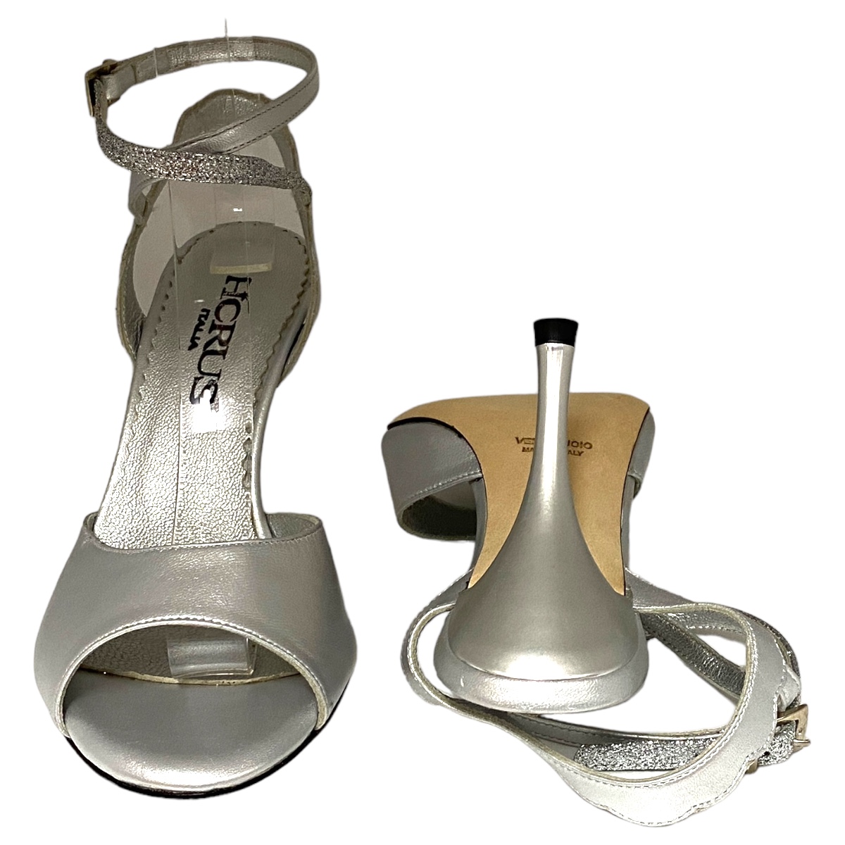 Mattsilberne Tangosandale aus italienischer Handarbeit, mit offenporiger und gut griffiger Ledersohle, auch outdoor nutzbar. Riemchen zur Hälfte Glitter Silber, Absatz 90 mm silber lackiert (stoßfest)