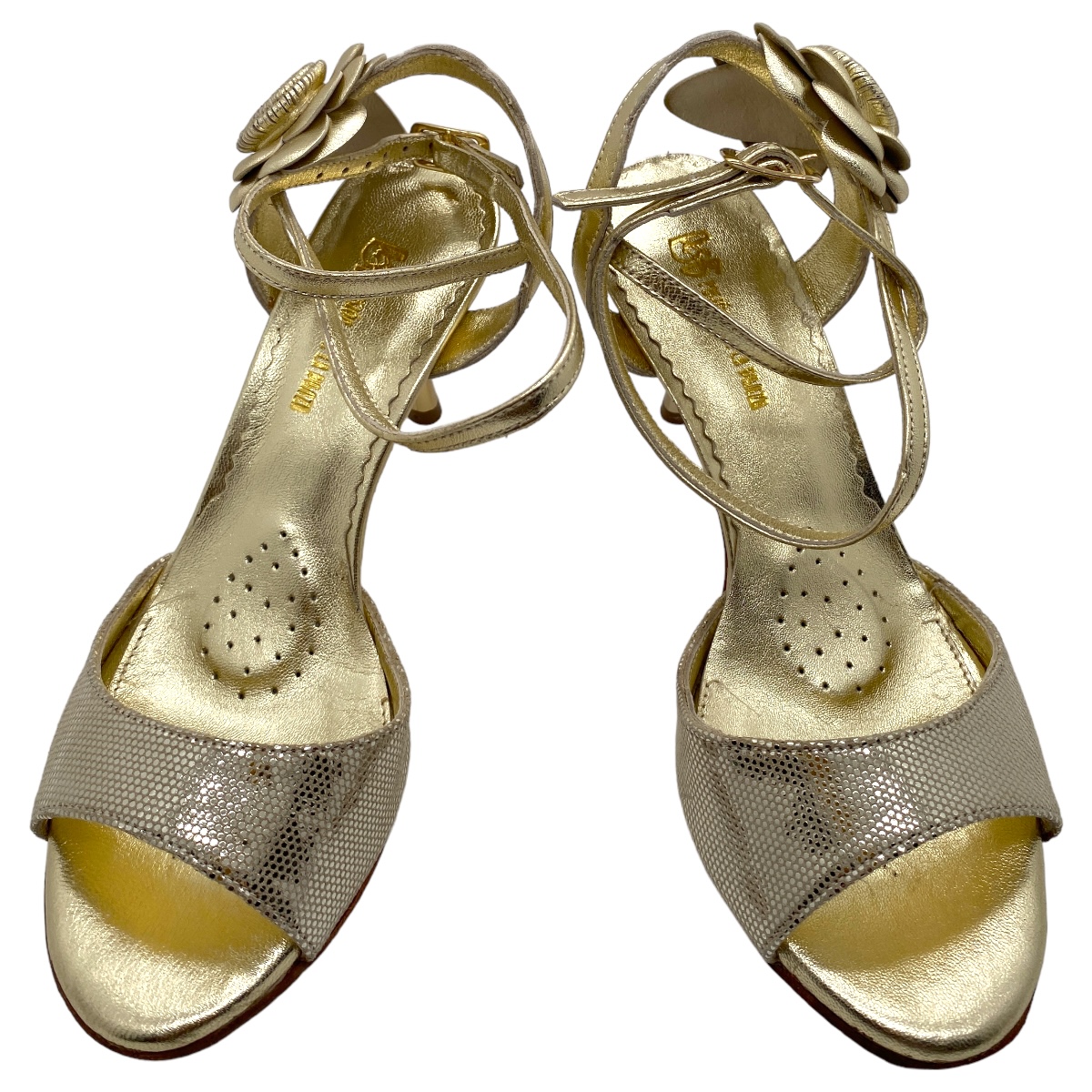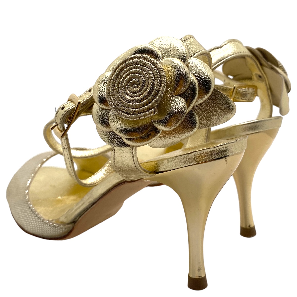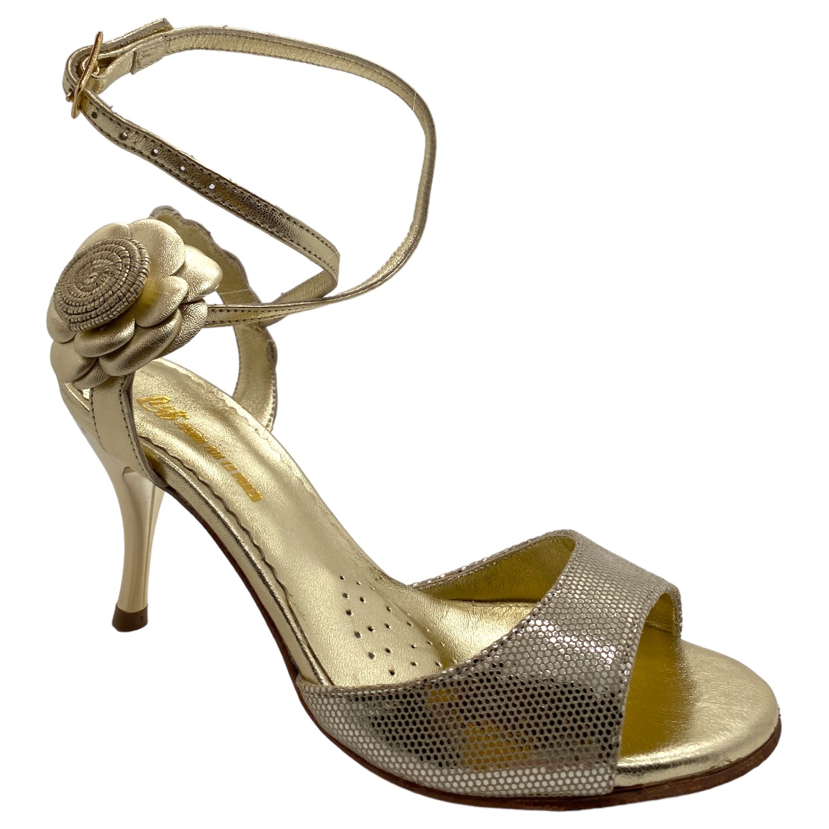 Ein Highlight unter den Porteñas - Florcita trägt eine vernähte Blume am hinteren Knöchelriemen - eine elegante Variante in platin (zwischen gold und silber) Schimmerleder in Kombination mit schlichtem Knöchelriemen, 80 mm Absatz der aufwendig zweifarbig lackiert wurde, wie alle P&B Schuhe weich abgepolstert, Sohle offenporiges rutschhemmendes Leder, outdoorfähig - Tango oder Salsa, aber auch für Tanzschuldamen die es beim Standardtanzen ein wenig ausgefallener mögen - natürlich auch - einfach nur zum Ausgehen ...
